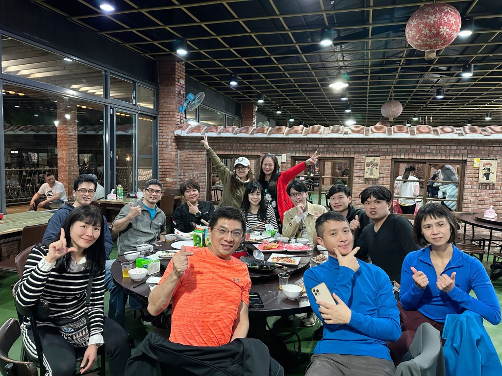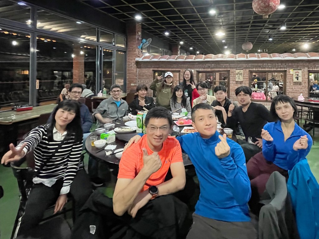 完成後,已經是黃昏時刻,此時,換完裝,開車直到中壢的台灣番鴨園區,我們要跟所有一起爬山的伙伴吃尾牙,也要與樂活玩童的以德兄、美惠妹一起相見,好像是要去相親喔!這是一個開心的晚上,大伙暢談過去的一些經歷,就只恨時間總是不給面子不給足啊!