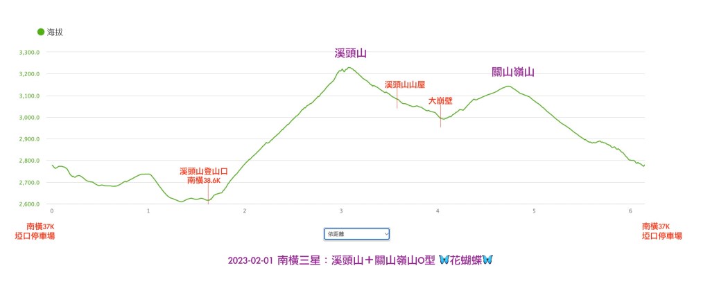08:23 南橫37K埡口停車場 (總里程0.0K) 08:50 南橫38.6K溪頭山登山口 (總里程1.6K) 12:13-12:52 溪頭山 (總里程2.9K)(午餐 ) 14:05 溪頭山山屋 (總里程3.4K) 14:31 大崩壁 (總里程3.8K) 15:41-15:49 關山嶺山 (總里程4.4K) 16:28 南橫37K埡口停車場 (總里程5.9K)