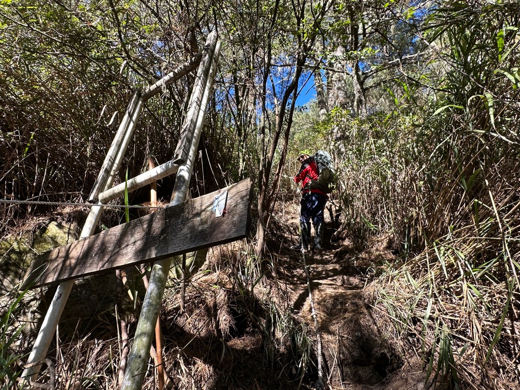 影片:有指示牌寫著:斷崖峭壁,也就是剛才經過的兩段拉繩段,如果是陡上,應該也是蠻辛苦的。16:03