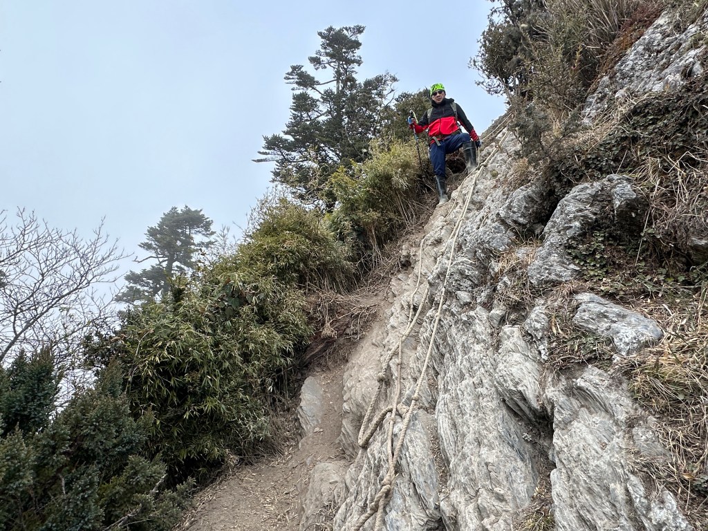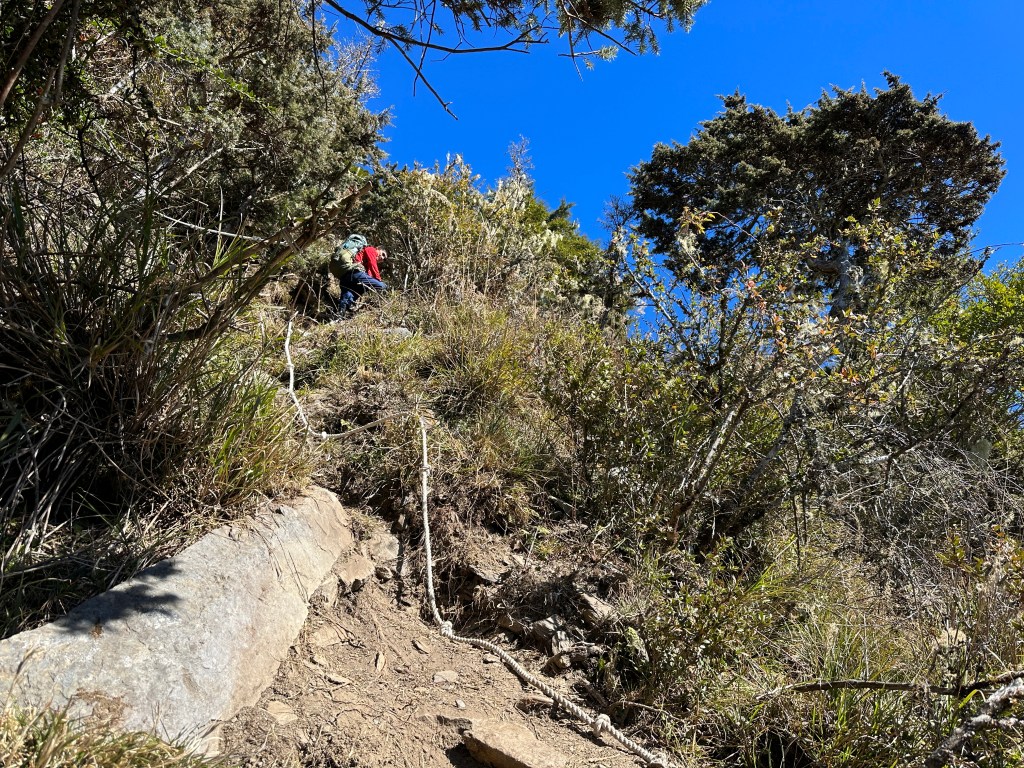 上圖:開始進入極陡區,有繩索輔助。這已經是第三段的拉繩段,此處大約在海拔H2900m,在此往後可以看到南橫公路。09:50