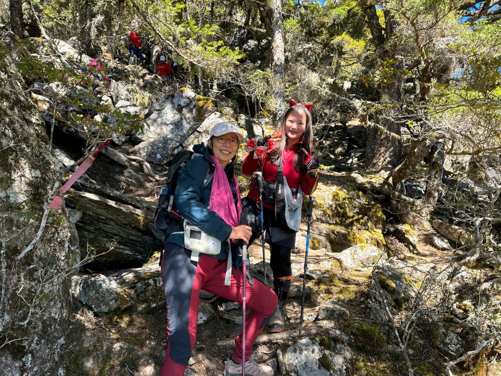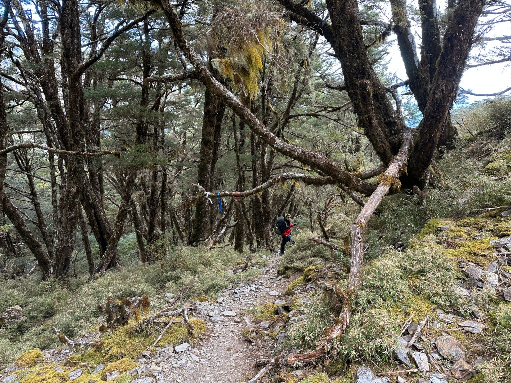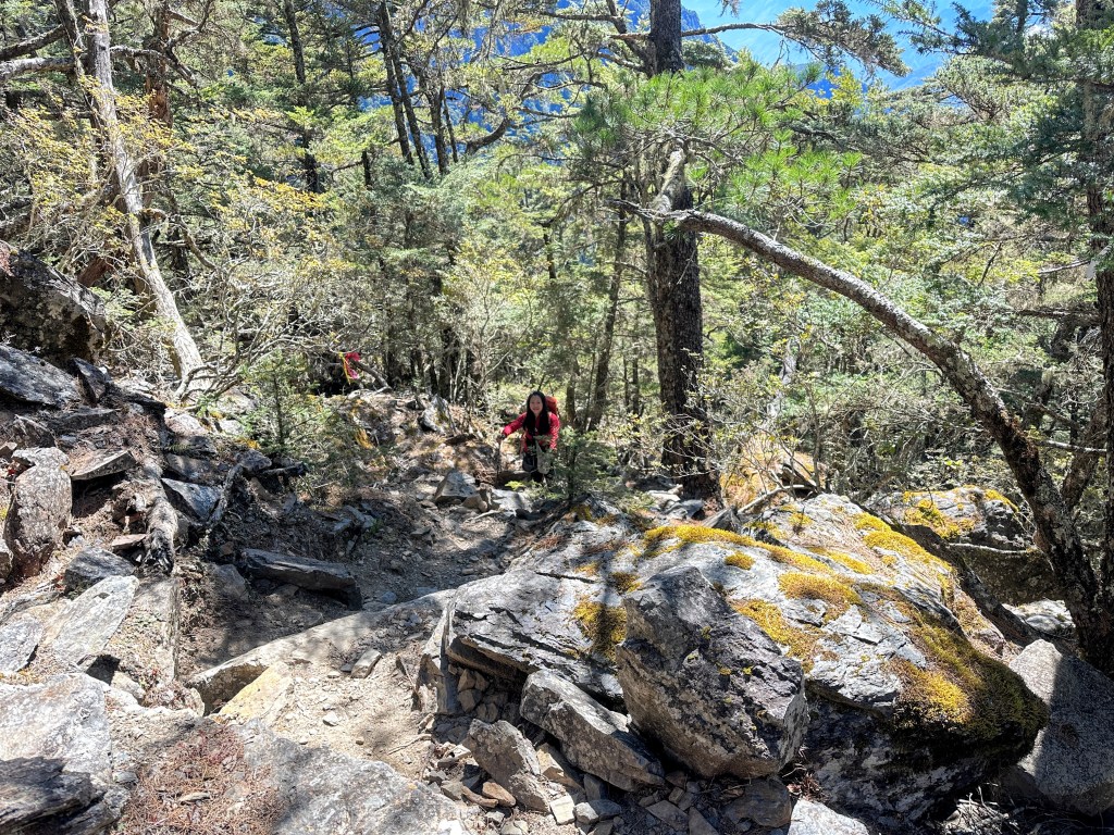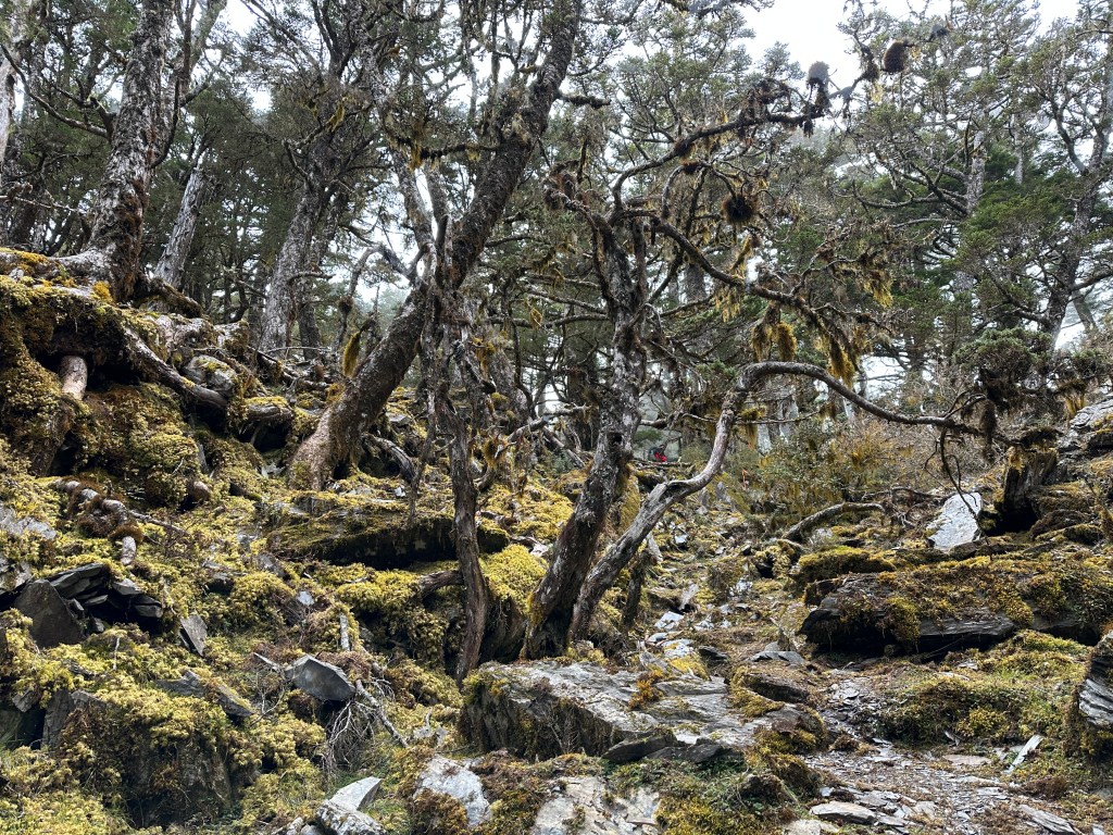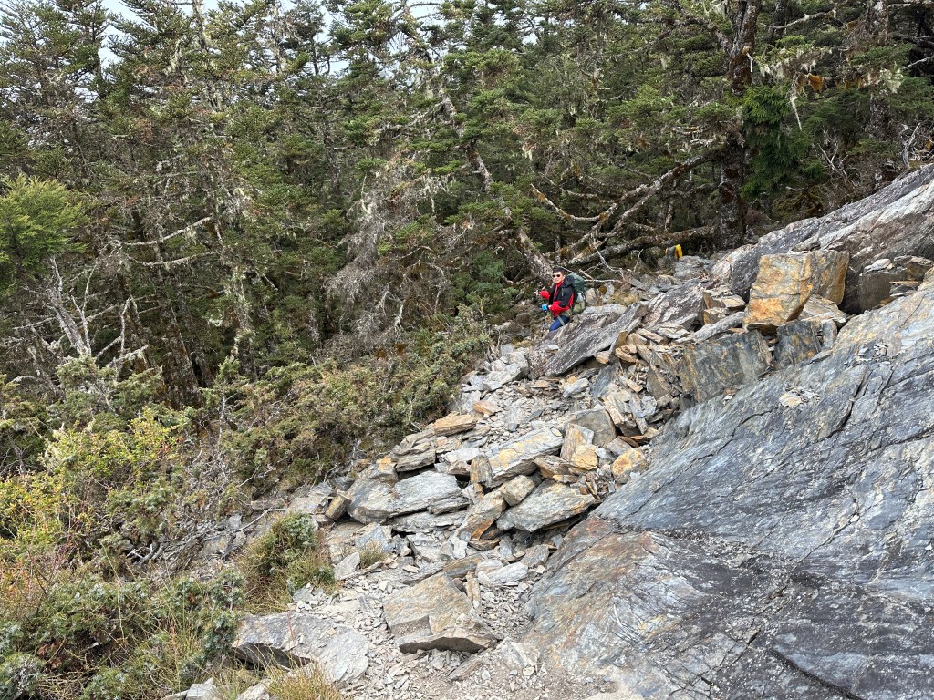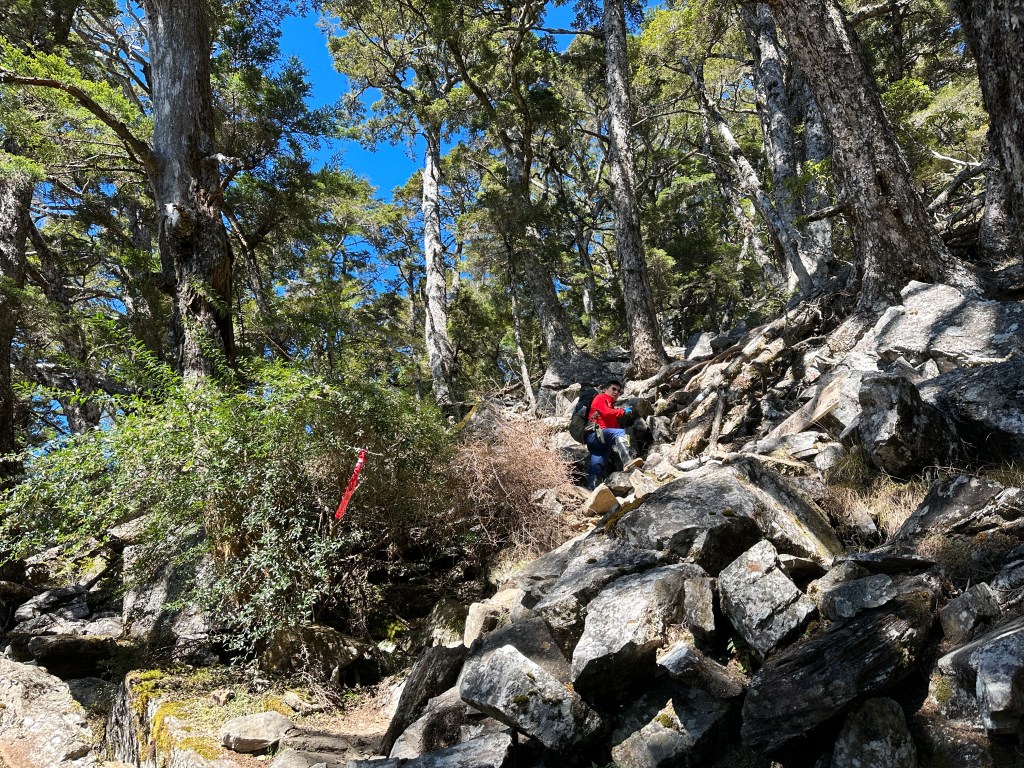 上圖:來到大倒木後,就進入石瀑區,而且隨著海拔愈高,高聳的樹木反而會越來越少。非常的陡啊!突然想起了,白姑大山、玉山前峰登頂前的石瀑區。