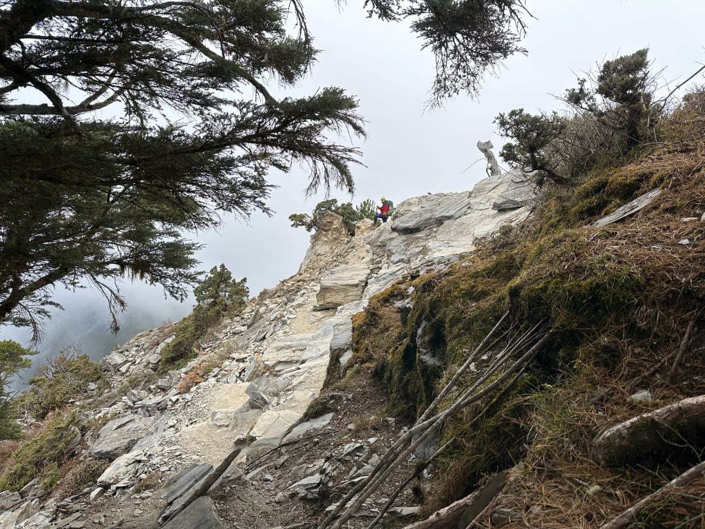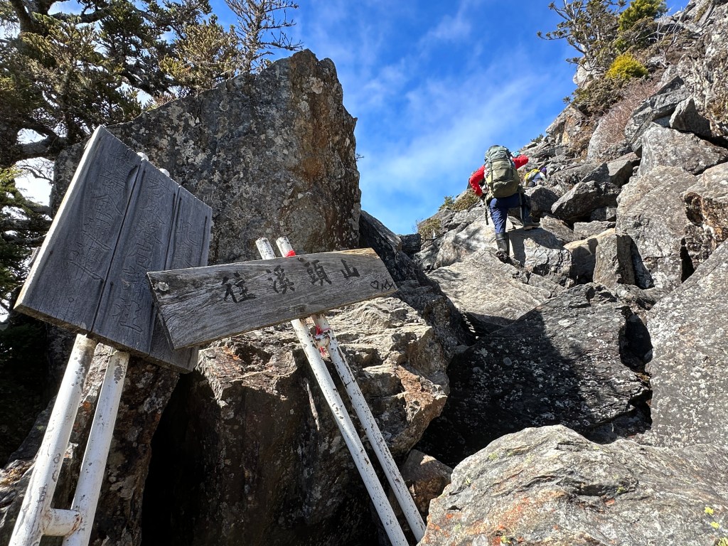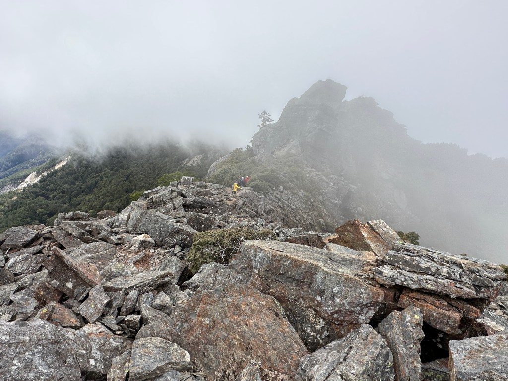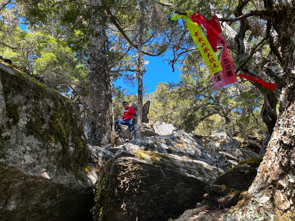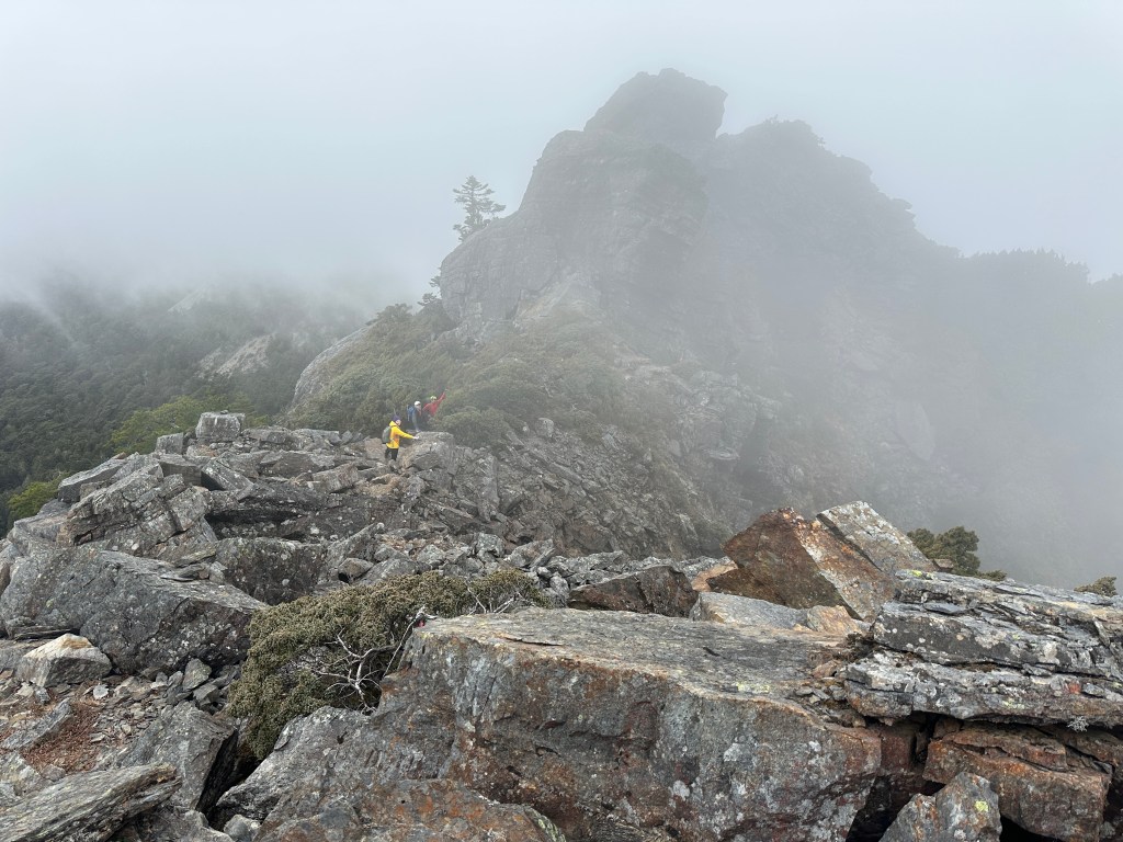 上圖:登頂溪頭山前500m,在海拔高度2950m起,就會進入到石瀑區,一直到登頂都是。由下方的Smile仰拍即將登頂的Ken及我(Gosen),這裡離登頂不到200m。