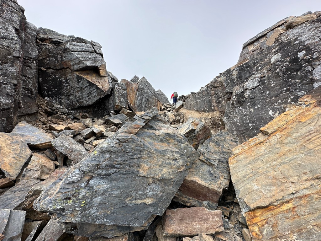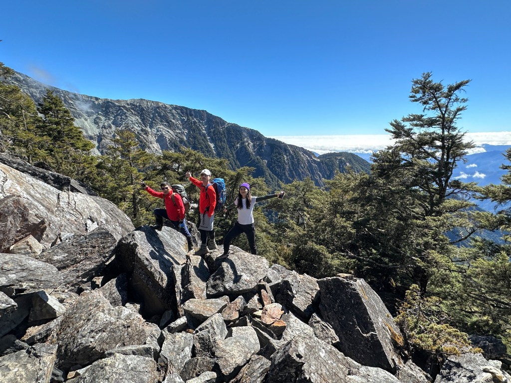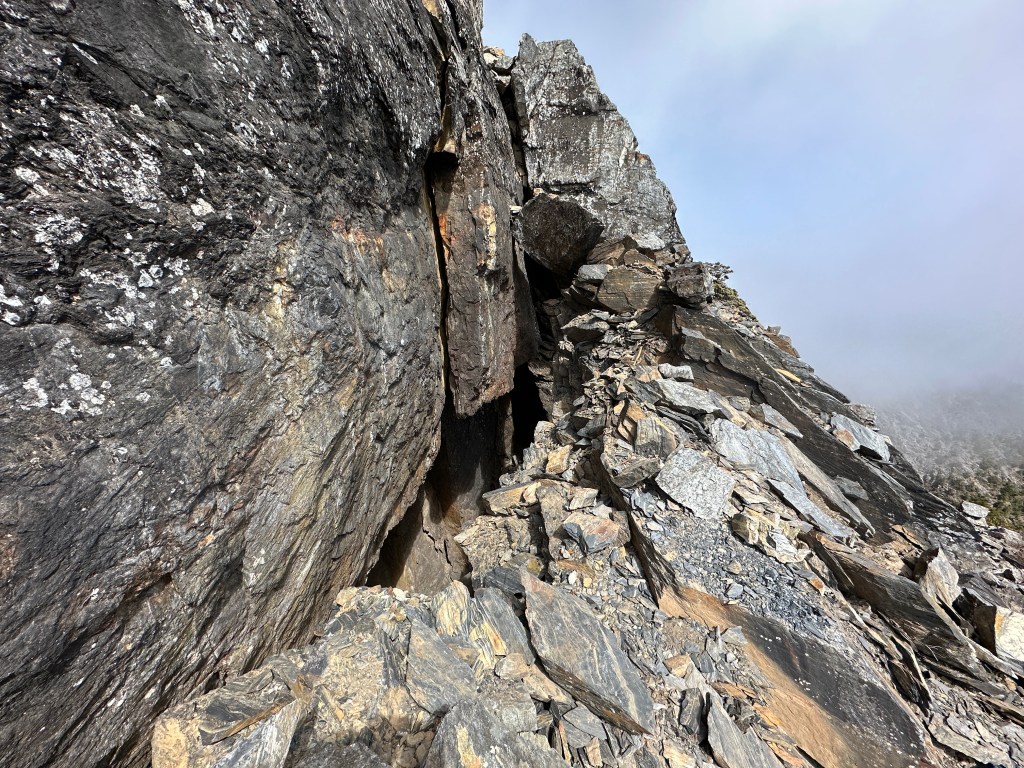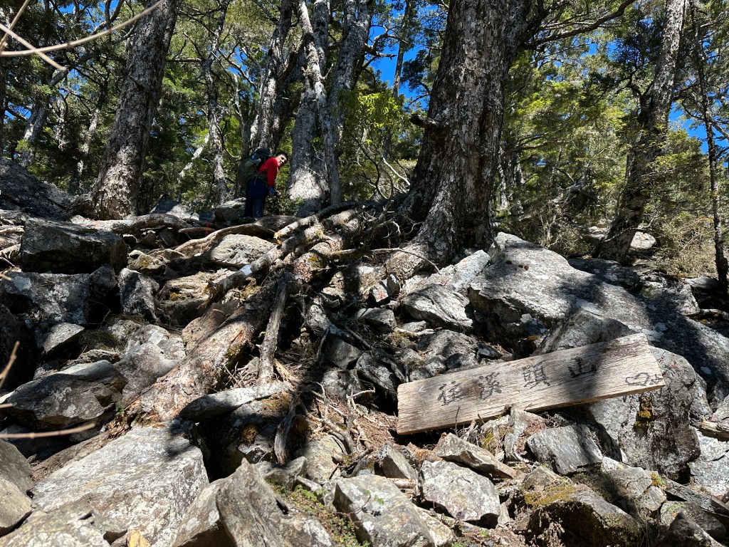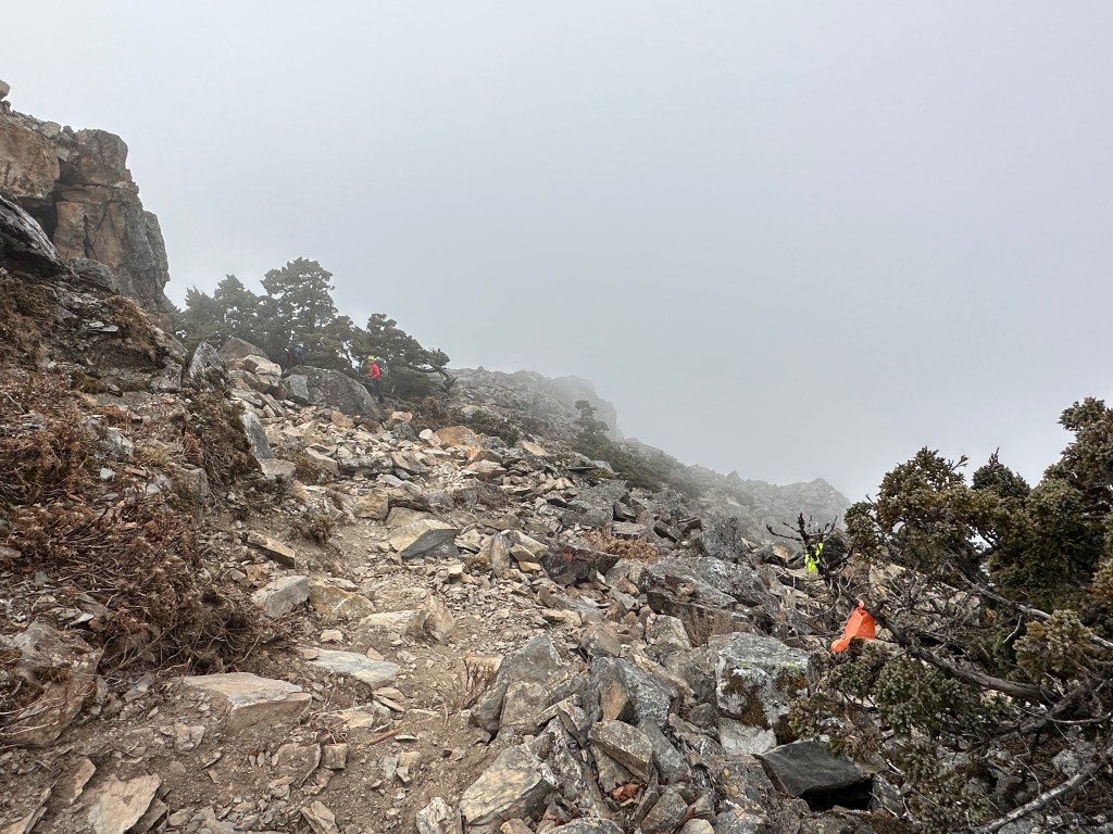 上圖:登頂溪頭山前500m,在海拔高度2950m起,就會進入到石瀑區,一直到登頂都是。由下方的Smile仰拍即將登頂的Ken及我(Gosen),這裡離登頂不到200m。