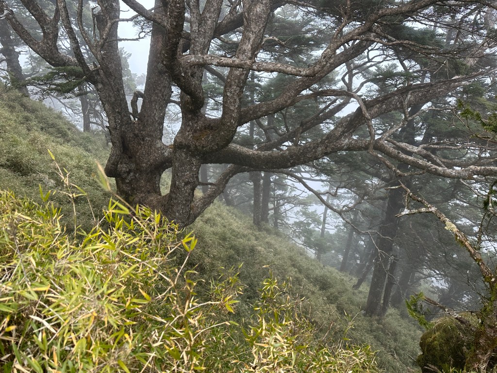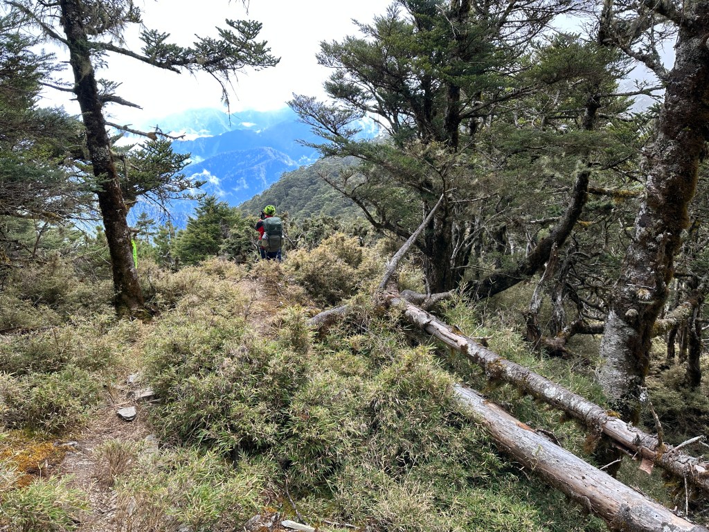 上圖:稜線路徑上的右側有一棵奇形怪狀的大鐵杉。