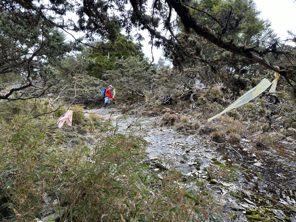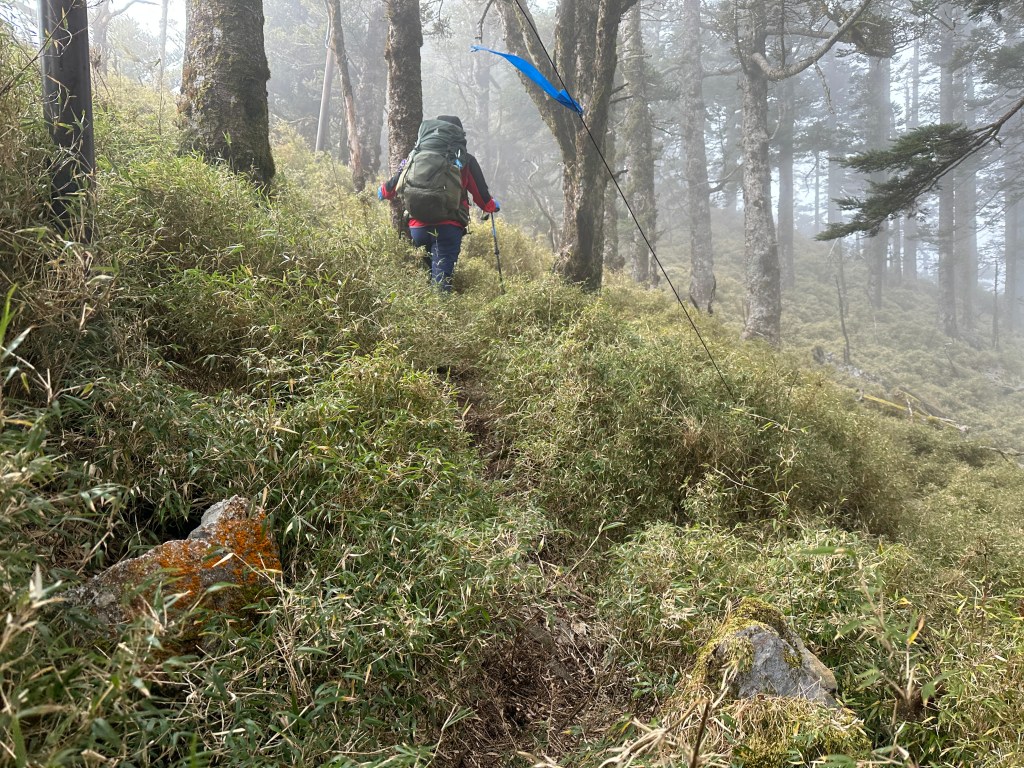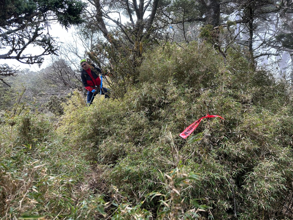 (2)溪頭山到關山嶺山 這一段路只有1.5K的距離,整個過程算得上是蠻複雜的,一離開溪頭山一路陡下,持續一大段的石瀑區,有一小段右側是垂直斷崖的路徑,看來有點驚險,接著進入森林區,會先經過一小段的瘦稜,兩邊都是極陡坡但不會危險,一過了瘦稄,馬上接上一個S型下切迴轉段,有危險!因為邊坡是垂直型態而且極深,沒有繩索輔助,要利用周遭的植披還有小樹根來通過,接下來的路徑沒有登山步條,全部都是低矮箭竹林,非常綿密都蓋住了路徑,仔細的看,至少有三條山友走過的路,所以我們就直接對著離線地圖的軌跡來走,再來就會看到廢棄的溪頭山山屋,過了山屋一段後就會由左側腰繞溪頭山大崩壁,接著來了一段好走的松蘿路段,再來就直接陡上海拔200m,這一段我們四人走得很慢,因為天氣轉為極為寒冷都快沒力了,奮力陡上後才來到關山嶺山。
