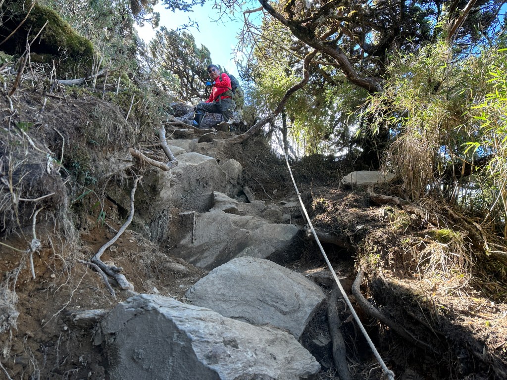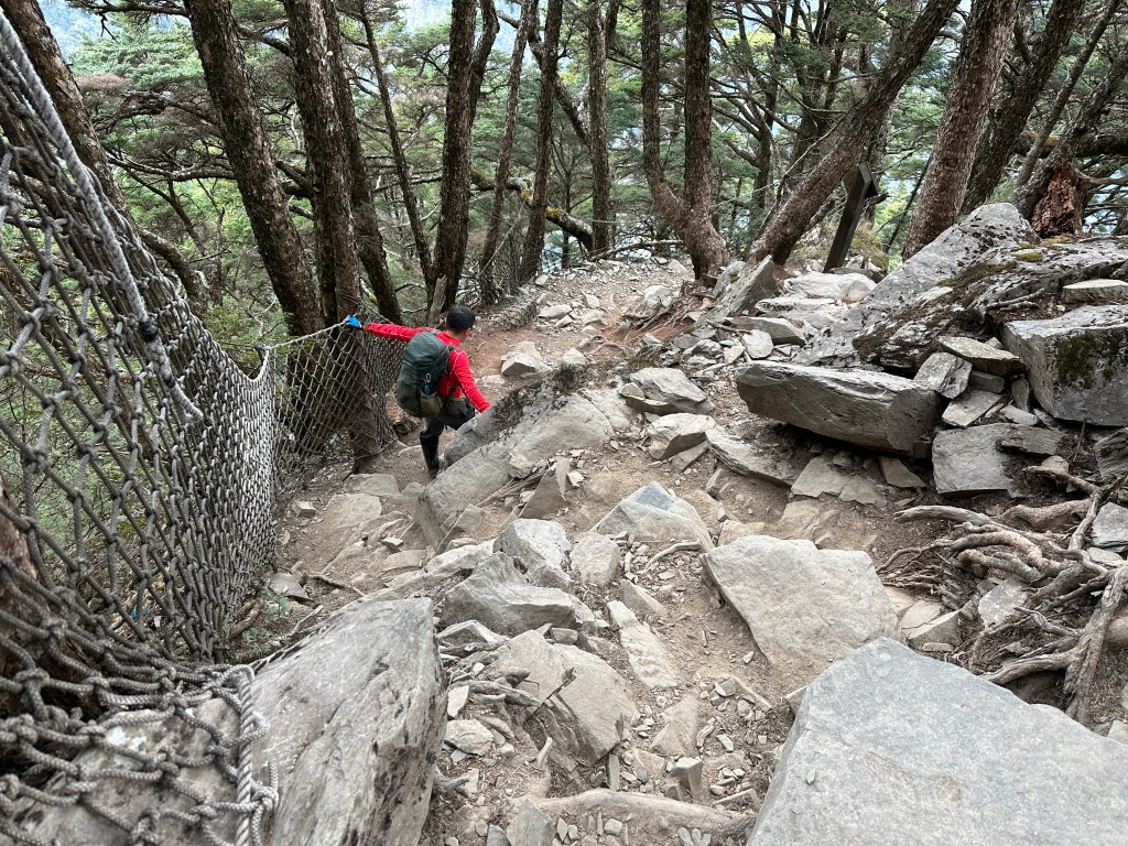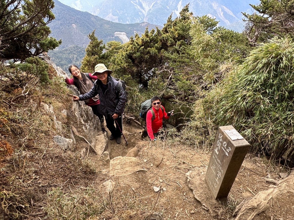 在登頂前約1.4K處有注意斷崖的指示牌,這裡的斷崖只有一小段,海拔提升也不高,1.3K處有一圓體木椅休息區,有8個圓體木椅,走到1.2K里程碑後,路徑轉為陡峭一段接著平緩一段的型態,過了0.7K里程碑後,直接進入岩壁攀爬,由此要一直陡到塔關山三角點,先經過兩邊都有護網的岩壁斷崖攀爬,距離大約有100m,要陡上海拔約50m,通過後,持續陡上,接著,看到0.2K的里程碑,感覺上,陡上不到200m的距離就會抵達三角點。感受得到,這是一座比較親民的百岳!在三角點,可以看到通往鷹子嘴山的稜線路,看這一條路線是很具有挑戰的路線。