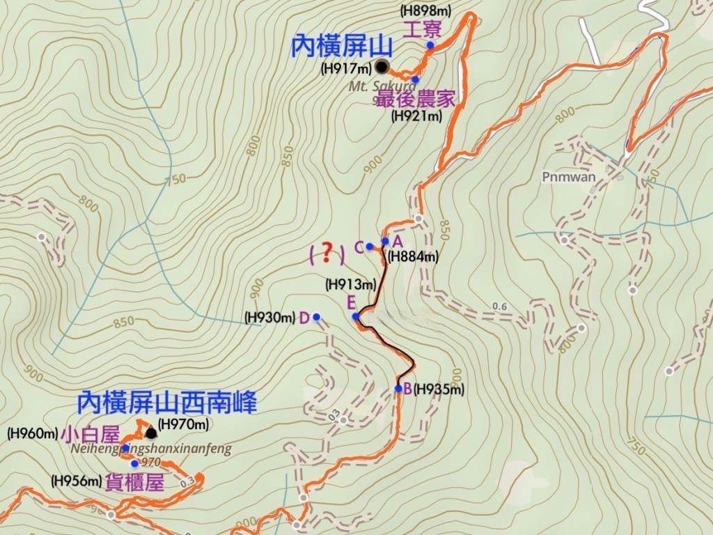 接著,由內橫屏山東北峰到內橫屏山之間,由離線地圖來看由稜線路走到底,再走離線地圖上沒有的路徑只差400m的距離,如果要嘗試由此稜線路來走看看,就必須要先走0.9K的稜線路到底,再走非常不確定不知是否可以通過的400m距離接上產業道路,如果不通,則來回就要多走上1.8K,因此放棄走這一條路。