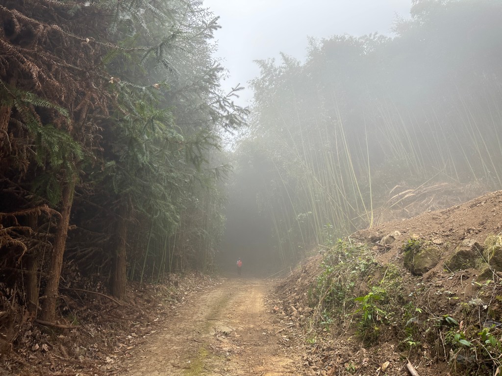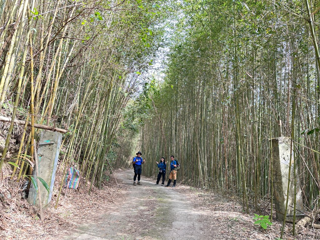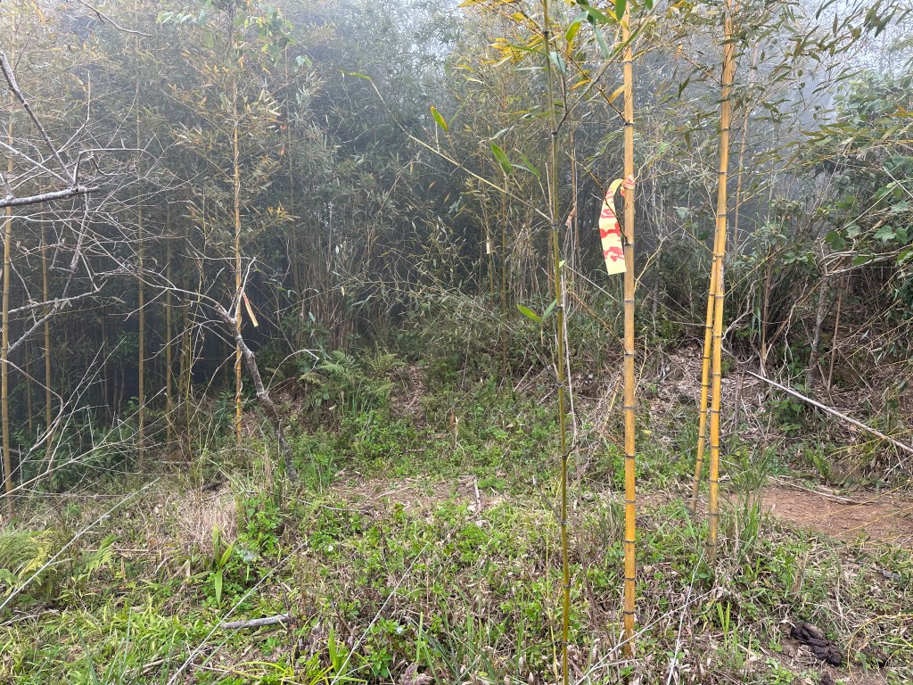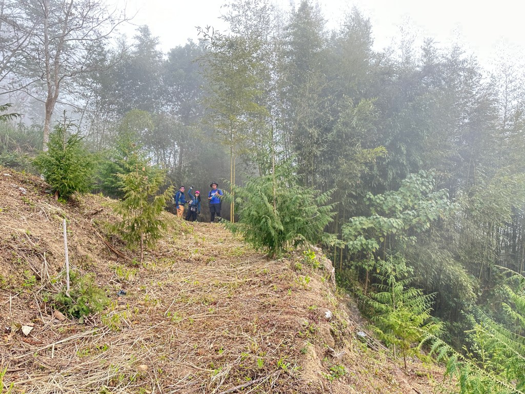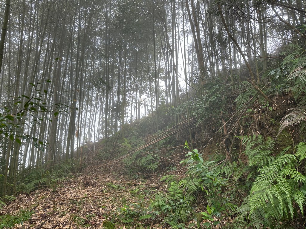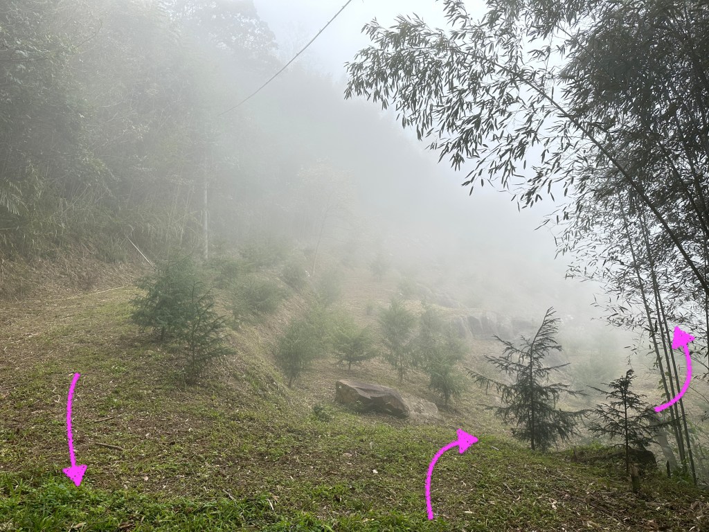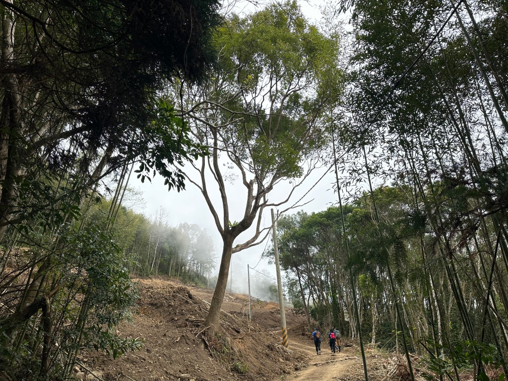 此時采庭跟我(Gosen)不想再吃到蜘蛛絲了,於是讓英勇的Smile一路帶領我們一直闖關,這一段路徑上剛開始好走,慢慢的就進入原始路徑之中,一路上也沒有布條指引,因此我們三人一路綁了一些布條,走到等高線圖的E點時,路徑雖然原始但又恢復為林道型態,但要右轉還是左轉呢?看著地圖,我們三人選擇左轉,約再走100m就穿出林道來到一處有種植痕跡的斜坡,從斜坡上陡上走100m就再度接上產業道路,沒想到硬闖亂鑽居然也走通了,這不知道算不算是打通的一條路?