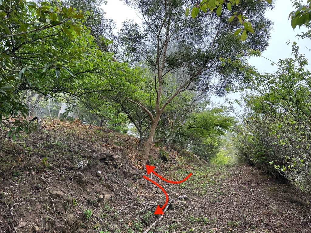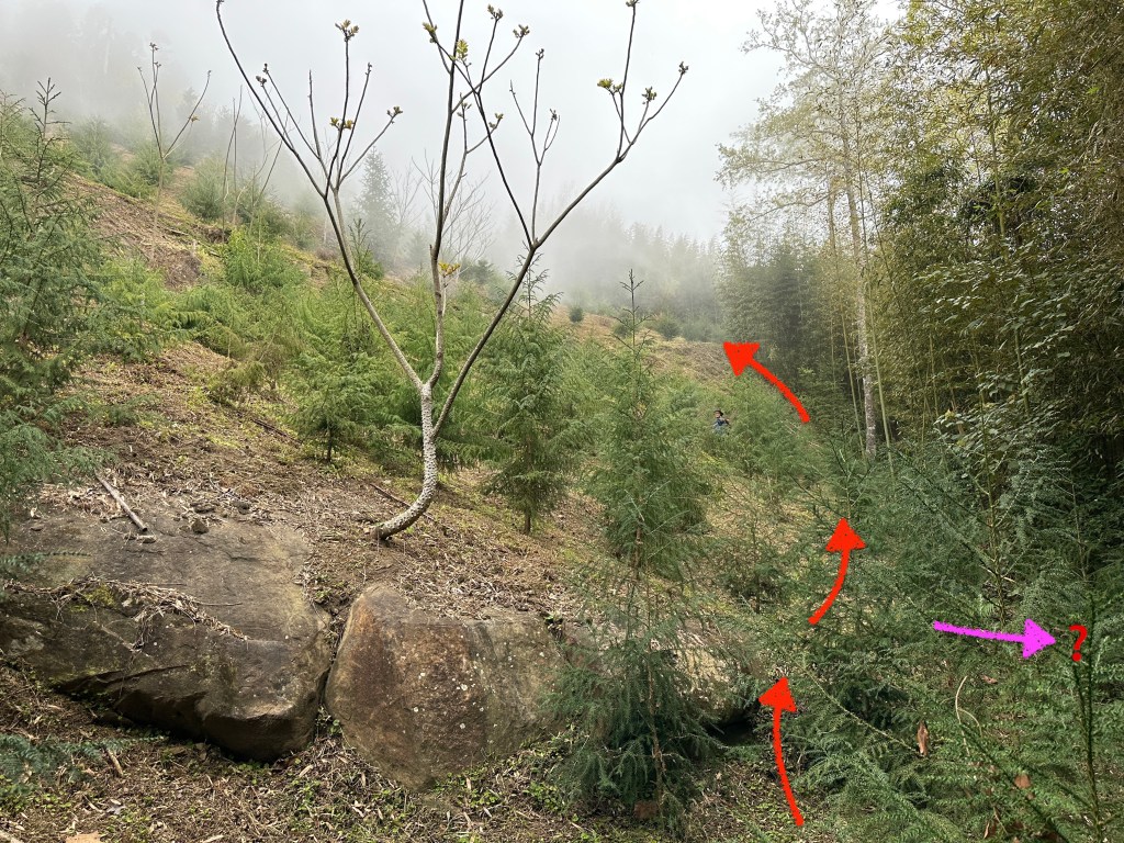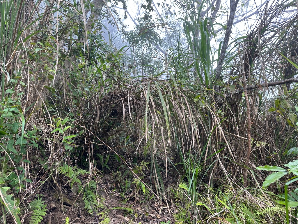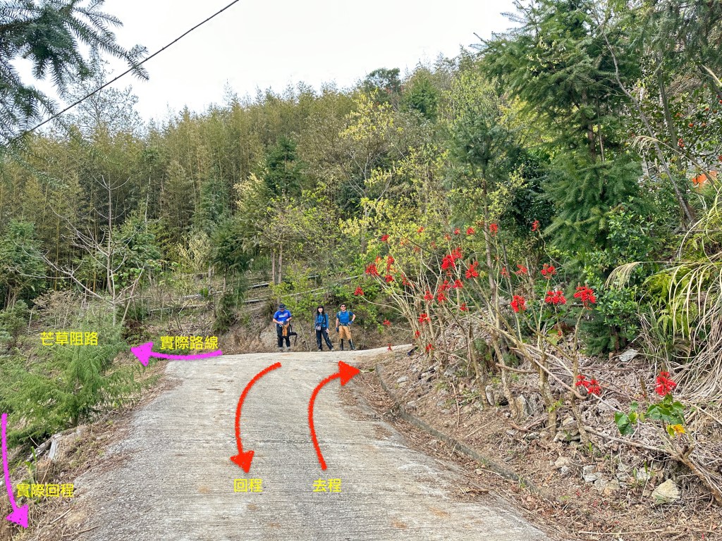 接著就改走腰繞的林道路,在離線地圖上,是存在有這一條路線的,而且只要0.7K的距離通得過,就可以省下1.5K的必須回走重複路線的距離,結果一進入才走了100m,就發現路徑已經完全被芒草植披完全覆蓋,也就是圖形中打❌的部分,看得出來這一條林道的路徑仍在,但除非帶鐮刀來砍,是一條可以打通的路線。就在確定不好行走退回之後,遇到岔路還在想能不能找到捷徑路省點路程,所以才會出現地圖上有❗️的回走路徑部份,如果有朋友們要走相同的路線,就原路回走就好。