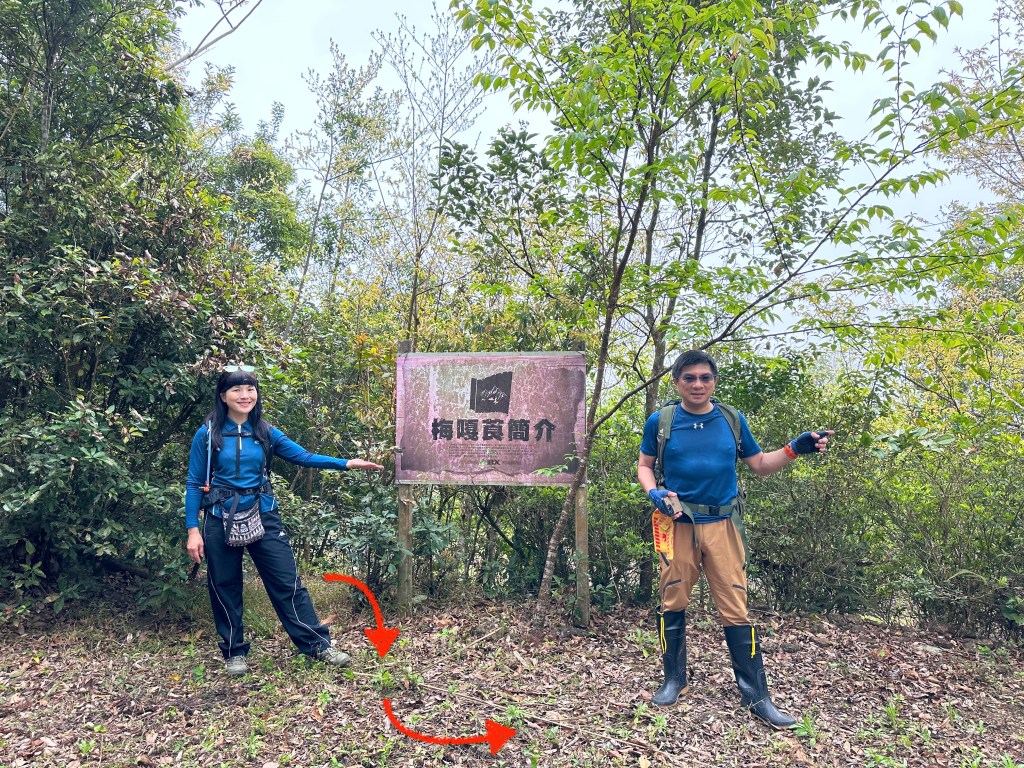 由橫山分局梅花派出所前20m的路邊空地停車,就沿著產業道路一路陡上走3.3K的距離來到最後農家,這一路上汽車是可以開上來的,由海拔H520m一路陡上到H862m,再由最後農家左側進入陡升約50m的距離,就會看到「梅嘎莨簡介」的告示牌,再繼續往前走50m要稍微注意一下位置,就可以在右側小山丘找到內橫屏山東北峰的三角點。再往前走100m有一個觀景點,不過目前的展望都被大樹給遮蔽,其實是看不到展望的。