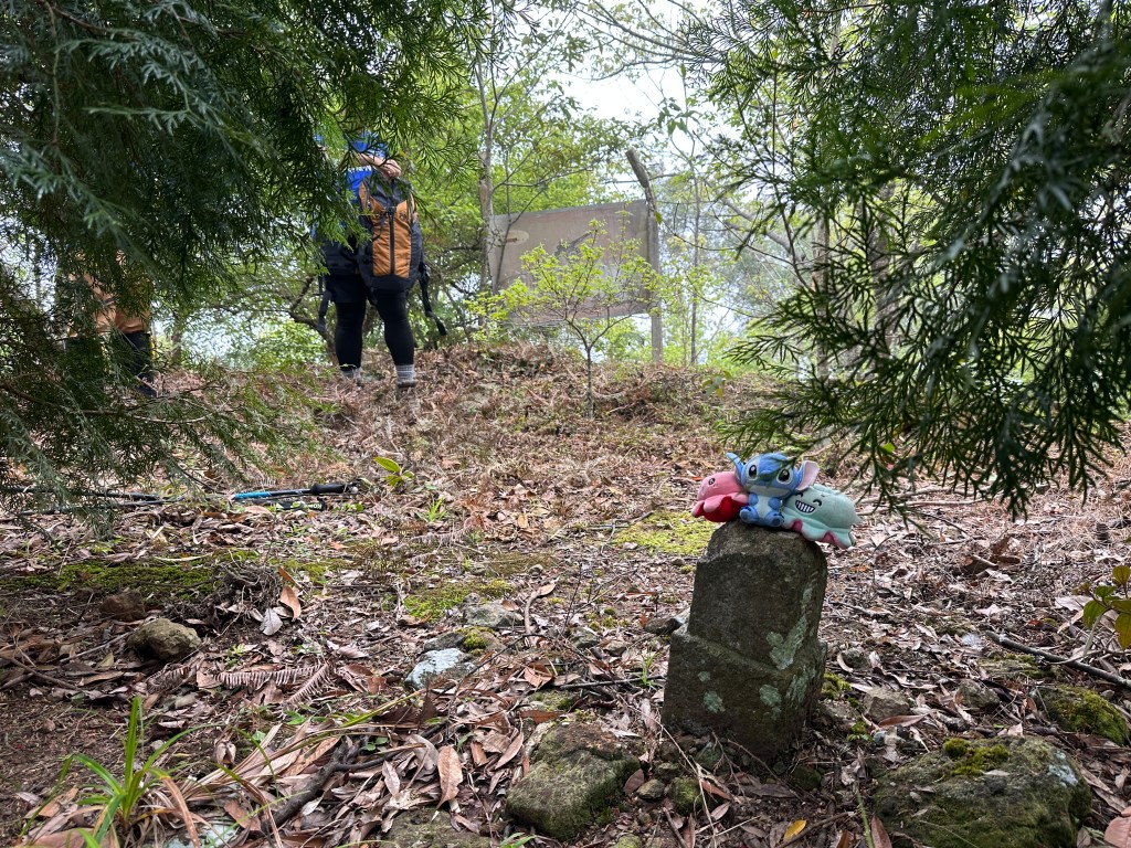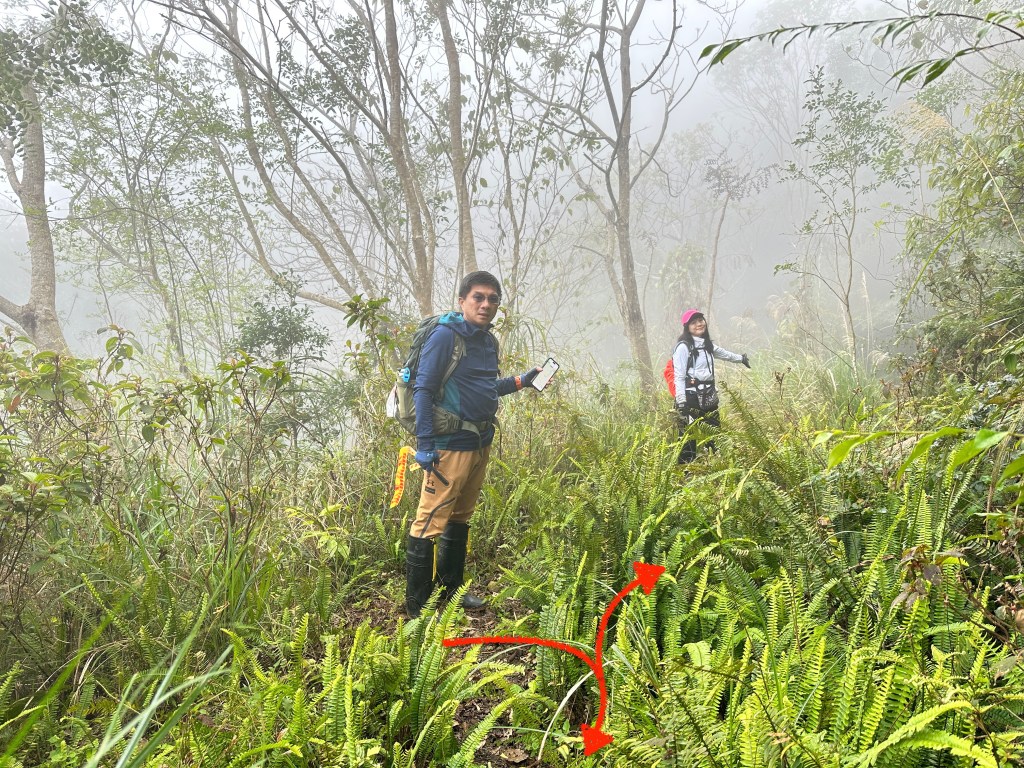 采庭與我(Gosen)對著離線地圖上三角點的位置,繞了半天就是找不到三角點的位置,當Smile從斜坡上來後,看了一下,就直接往一處稍微低的位置說:在那裡!齁!真是厲害,這個三角點已經有些殘破,再加上顏色又與周遭的環境相同,在具有保護色的條件下,這樣也看得到?我們在三角點旁綁了三條布條,相信未來朋友們一進來,就會馬上看到!