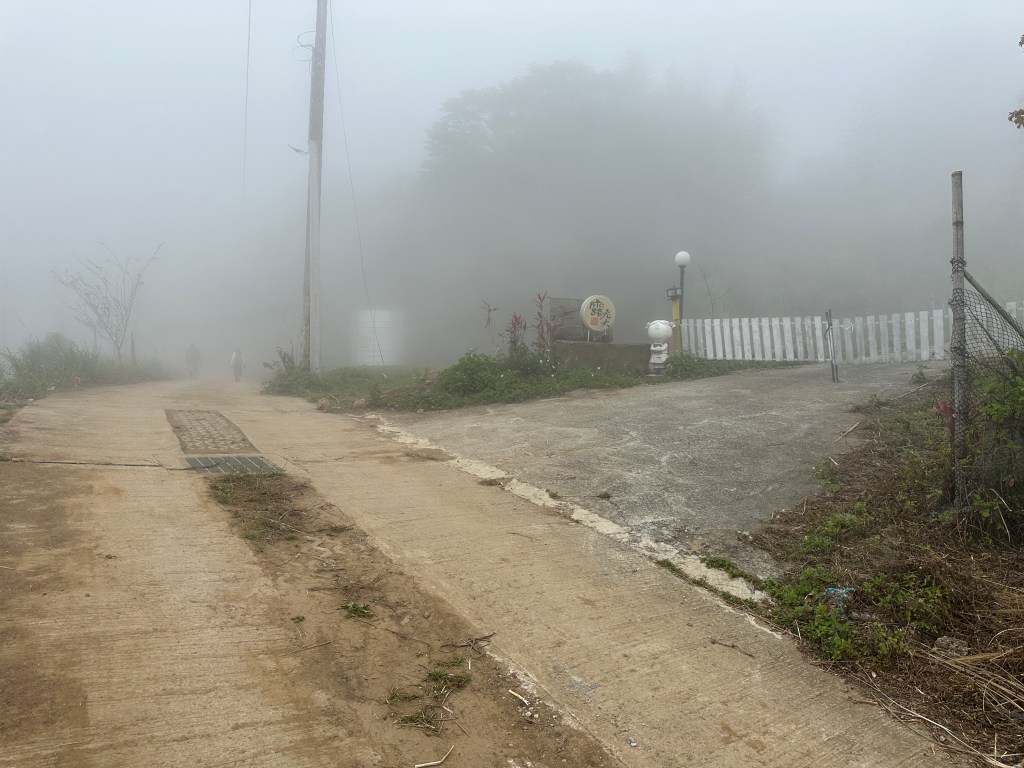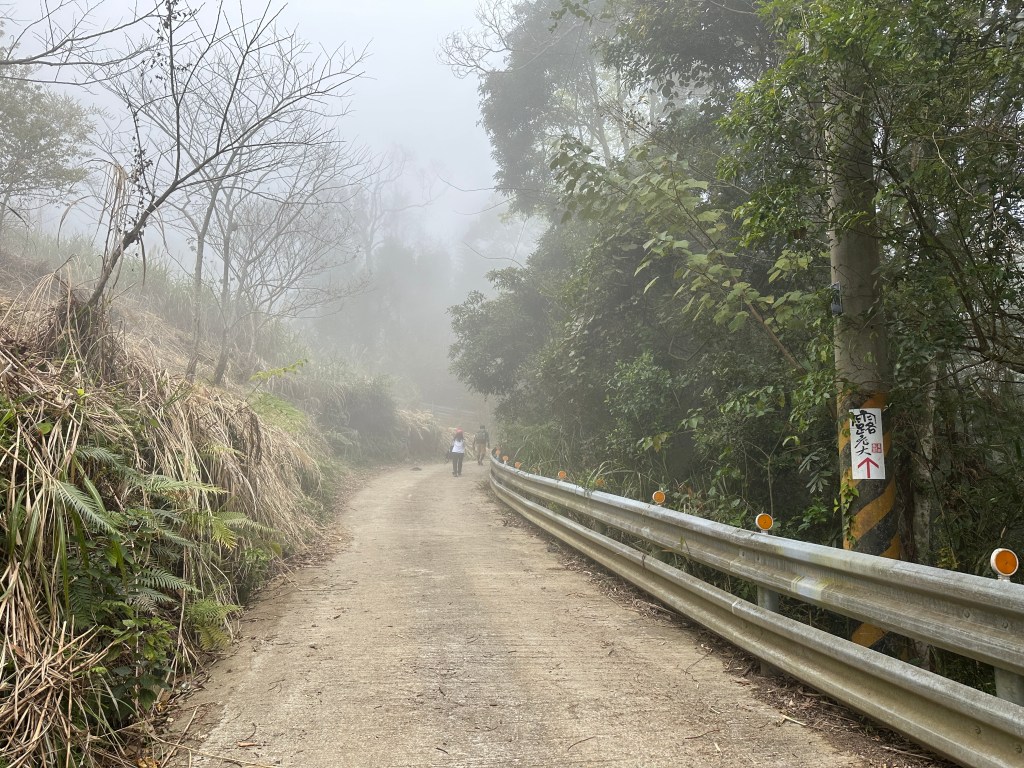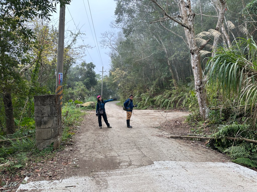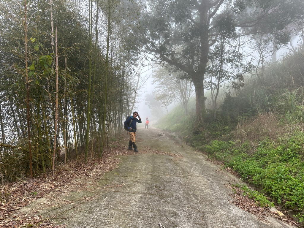 由芒草阻路段退回,開始再度沿著產業道路回走,接著全部都是走在堅硬的柏油路或水泥路上,要走恰好5K的距離可抵達內橫屏山,這過程中,Alvis反應他雙腳的腳裸及膝蓋有感覺,因此我們走回到地圖上的F點時,就建議Alvis沿著產業道路下山不要再走,我們三人則持續往內橫屏山方向前進,此時天氣轉為霧雨狀態,慢慢緩上到接近三角點前200m就會看到一個蠻大的工寮,再往前走100m就會看到內橫屏山的最後農家,由此往右上的斜坡往上走100m即會抵達內橫屏山三角點。而Alvis在下午1點左右回到了停車場。