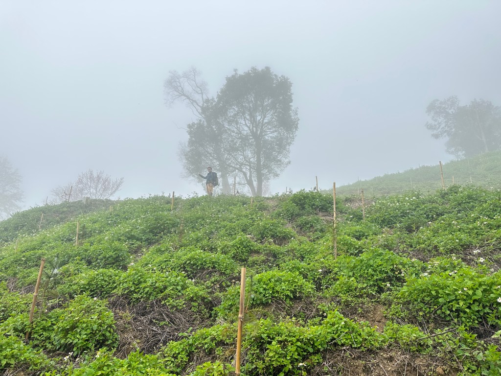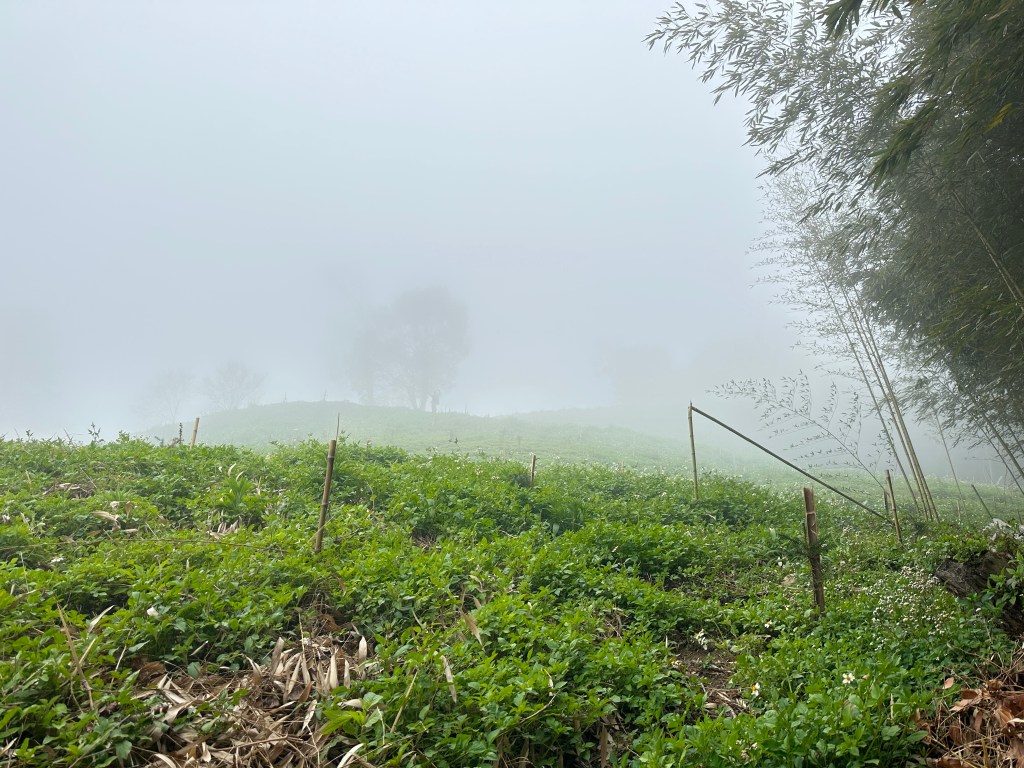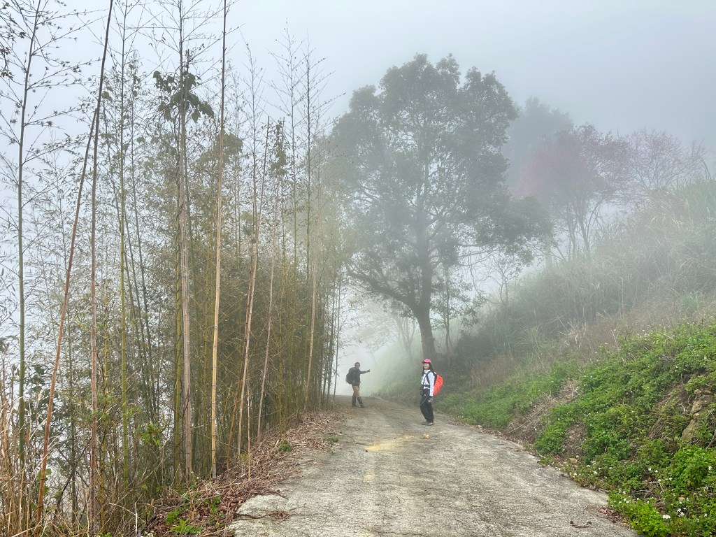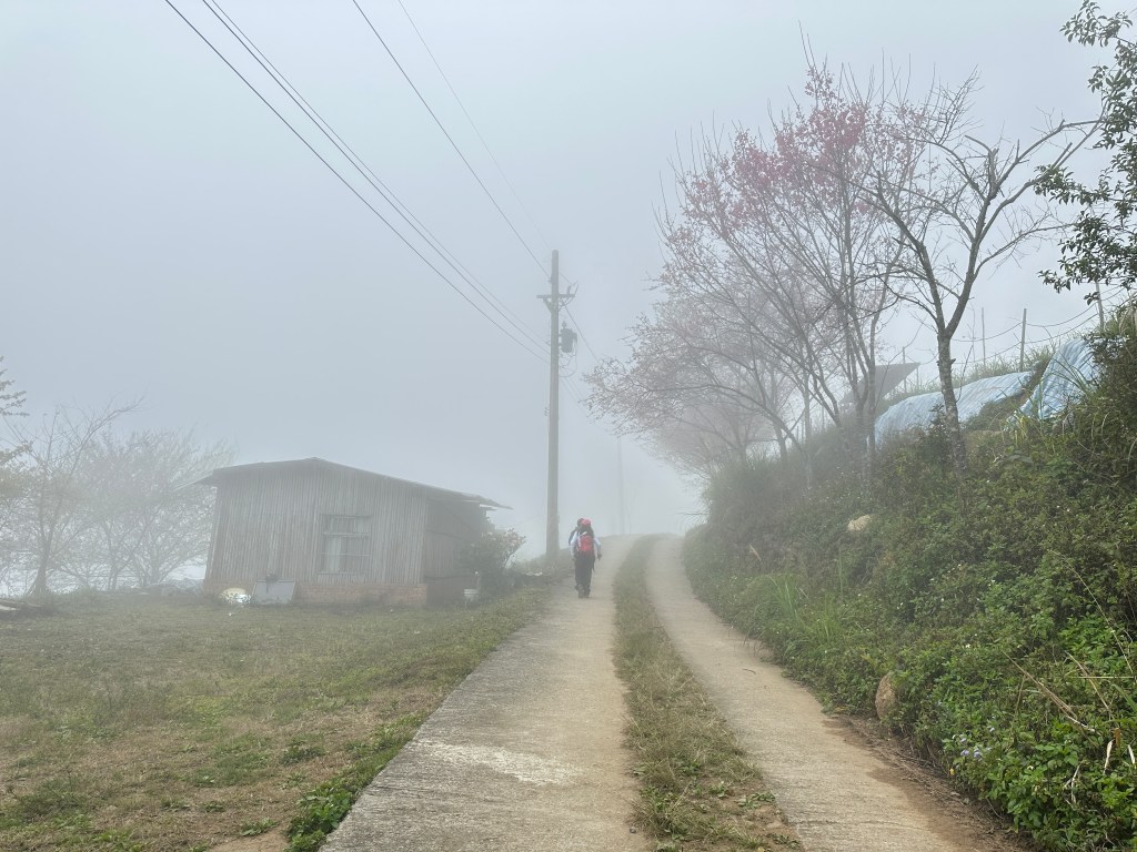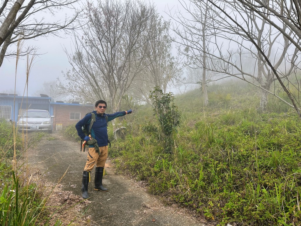 由芒草阻路段退回,開始再度沿著產業道路回走,接著全部都是走在堅硬的柏油路或水泥路上,要走恰好5K的距離可抵達內橫屏山,這過程中,Alvis反應他雙腳的腳裸及膝蓋有感覺,因此我們走回到地圖上的F點時,就建議Alvis沿著產業道路下山不要再走,我們三人則持續往內橫屏山方向前進,此時天氣轉為霧雨狀態,慢慢緩上到接近三角點前200m就會看到一個蠻大的工寮,再往前走100m就會看到內橫屏山的最後農家,由此往右上的斜坡往上走100m即會抵達內橫屏山三角點。而Alvis在下午1點左右回到了停車場。