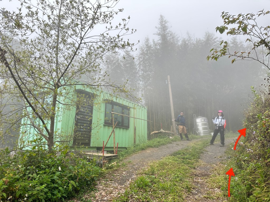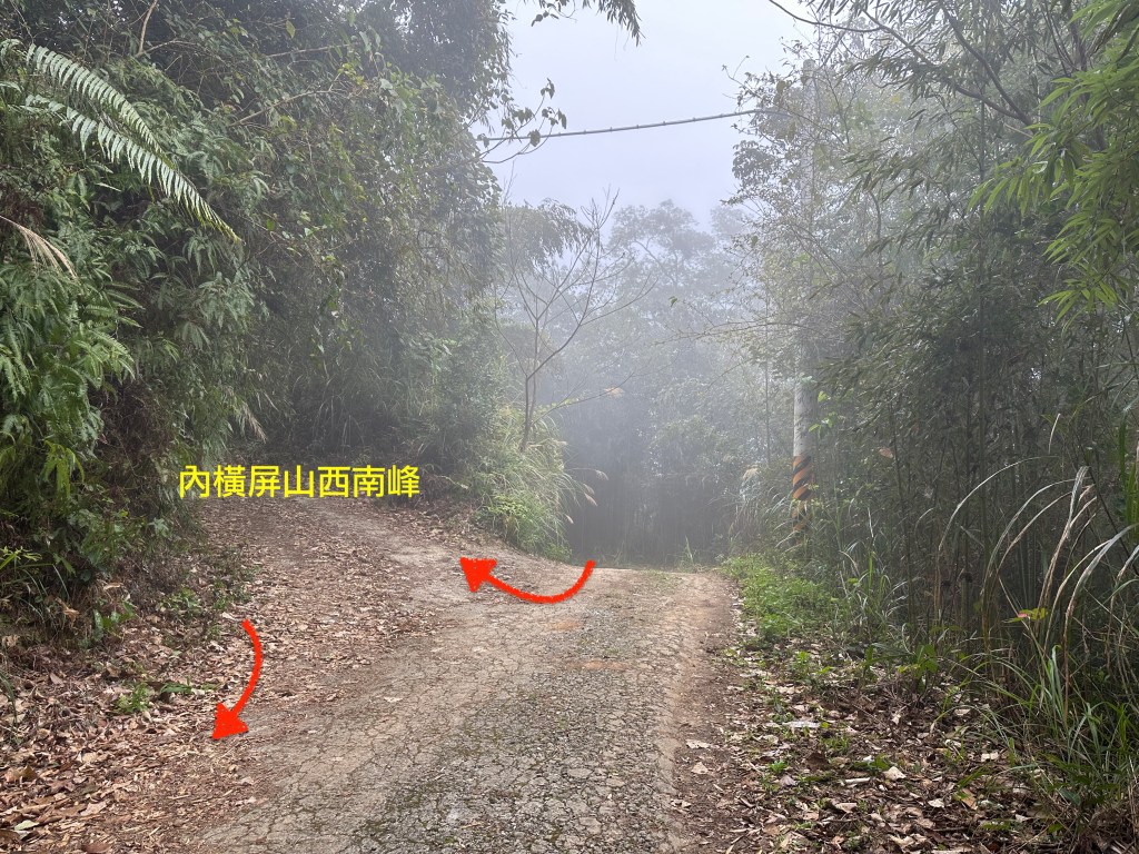 接著,沿著產業道路緩緩而上,就會走到內橫屏山西南峰,在抵達前200m會看到一個綠色的貨櫃屋,再往前走100m就會看到一個小白屋,由小白屋右轉而上繼續走100m看到水塔,由水塔右側轉上去就抵達內橫屏山西南峰。