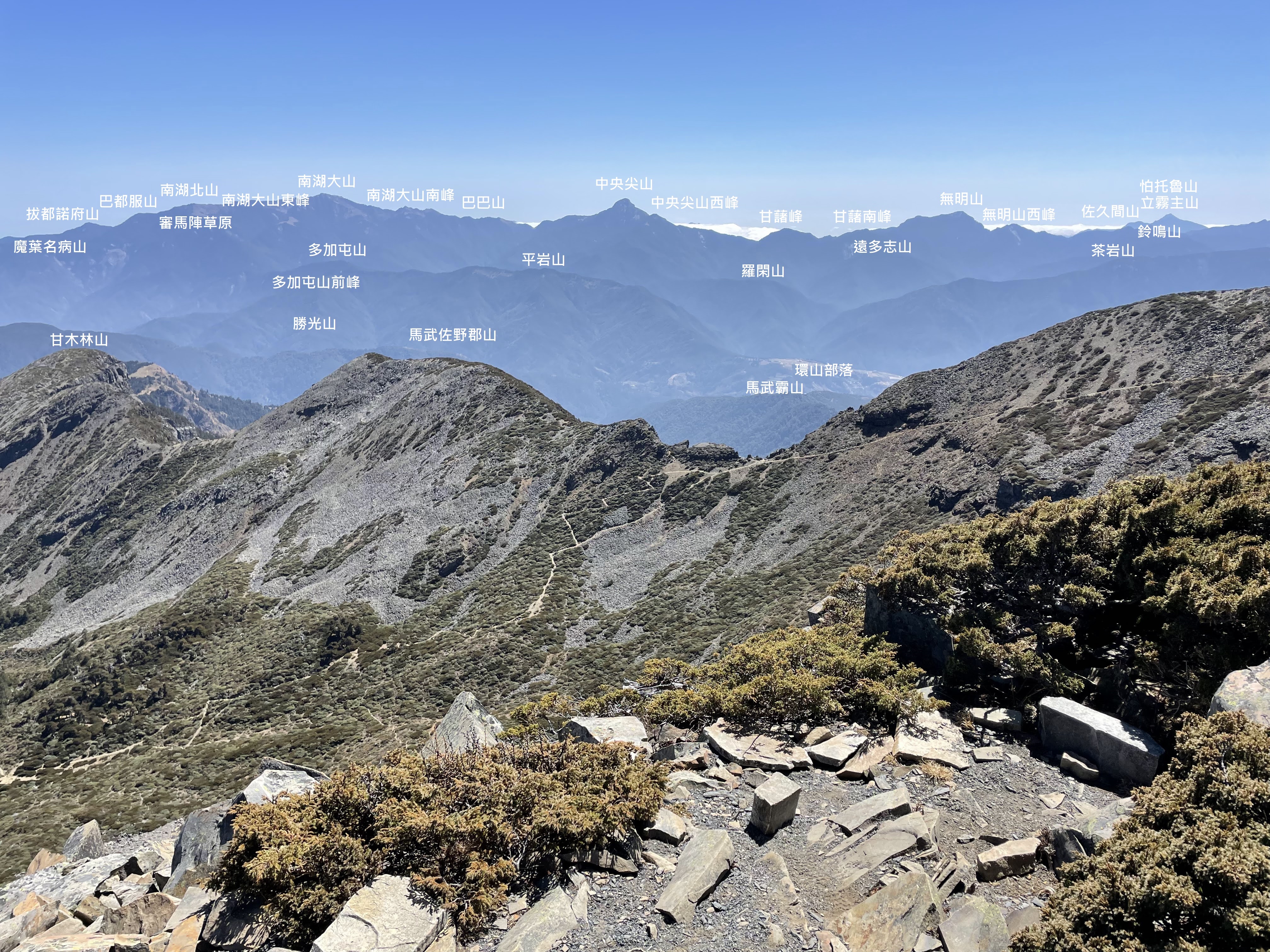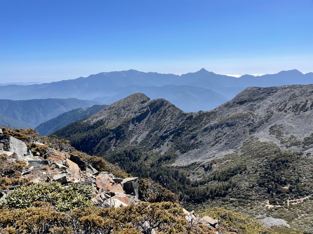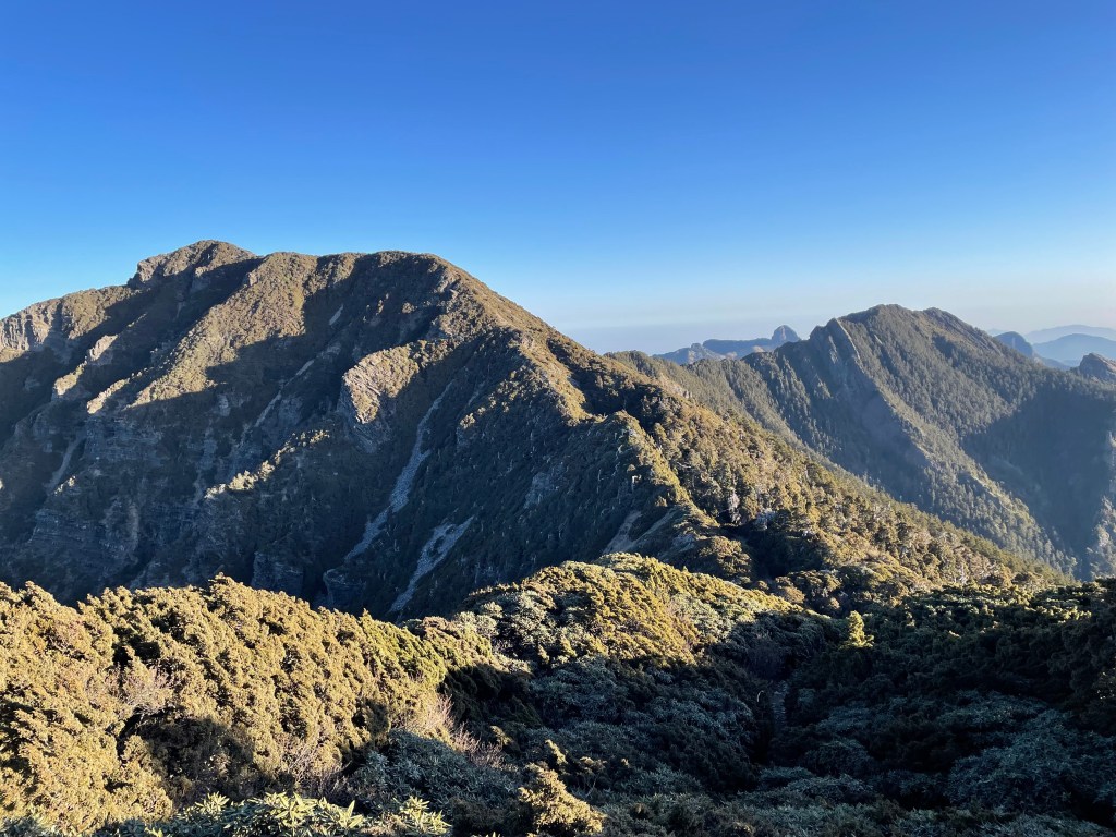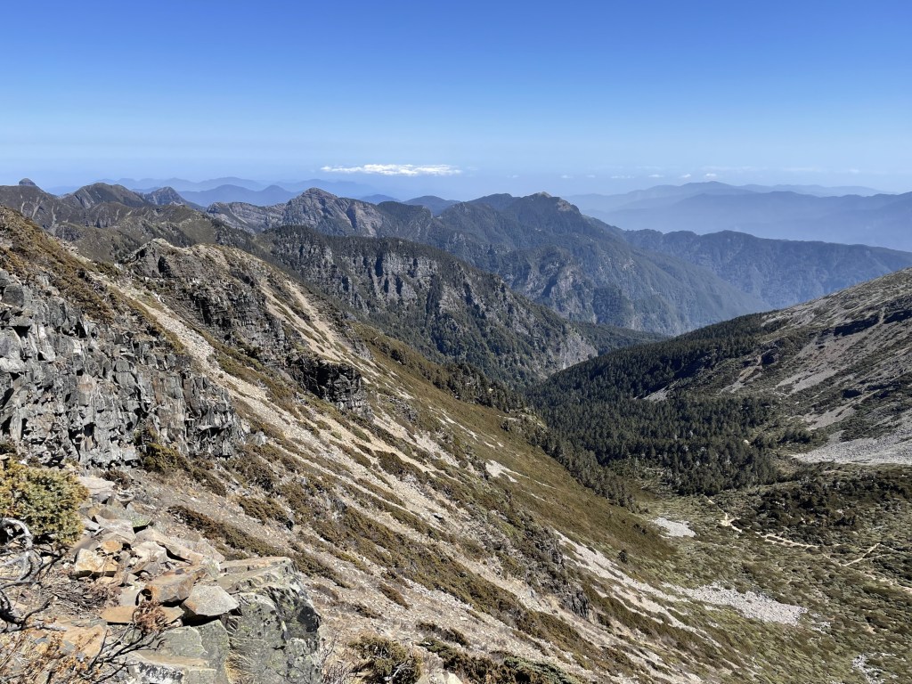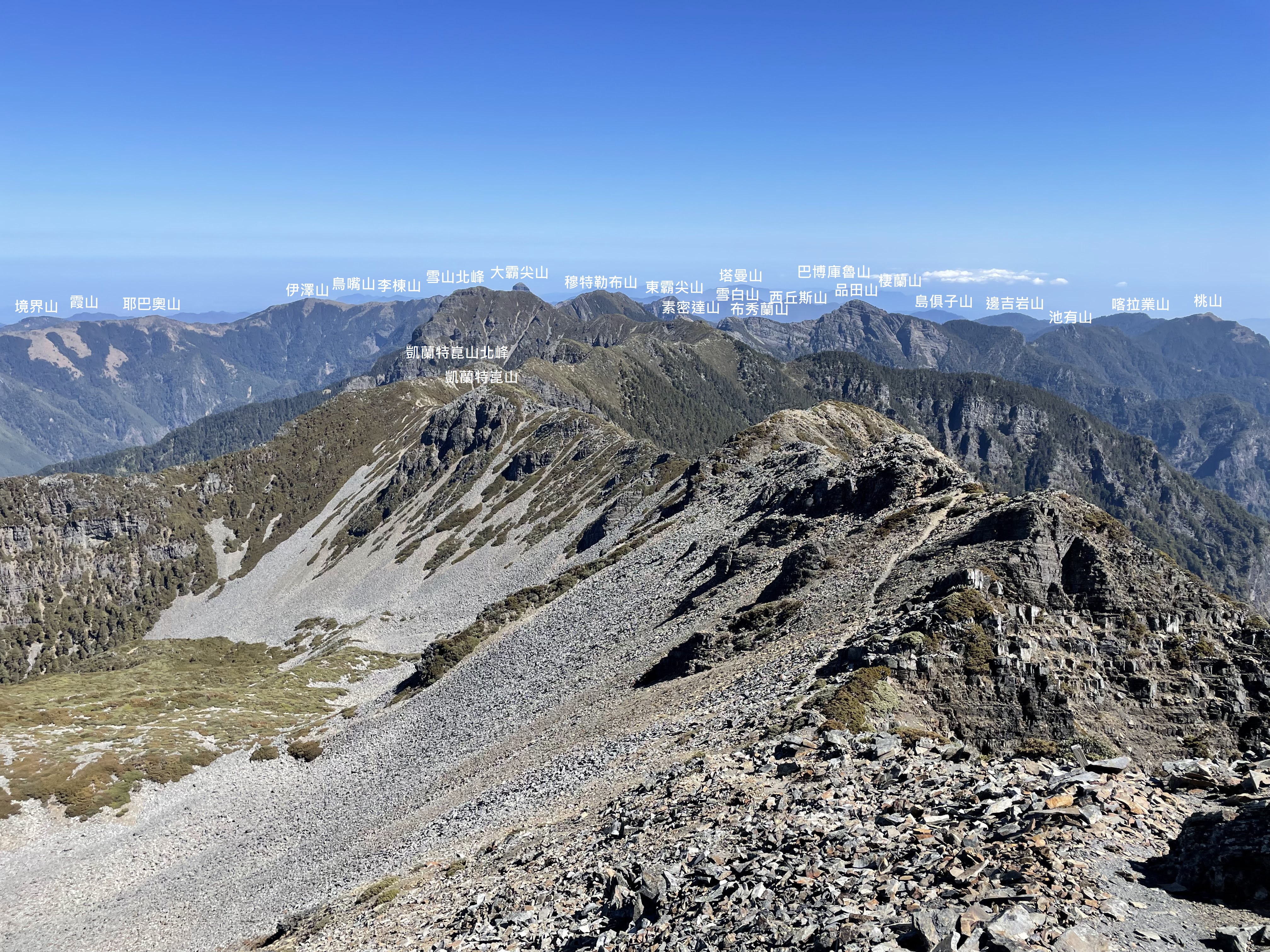 上圖:此時回首來時路,竟見穆特勒布山、大小霸、東霸尖山、布秀蘭山與品田山都清晰可見,而我們今早還遠在品田山之後