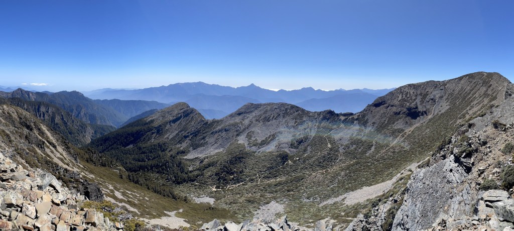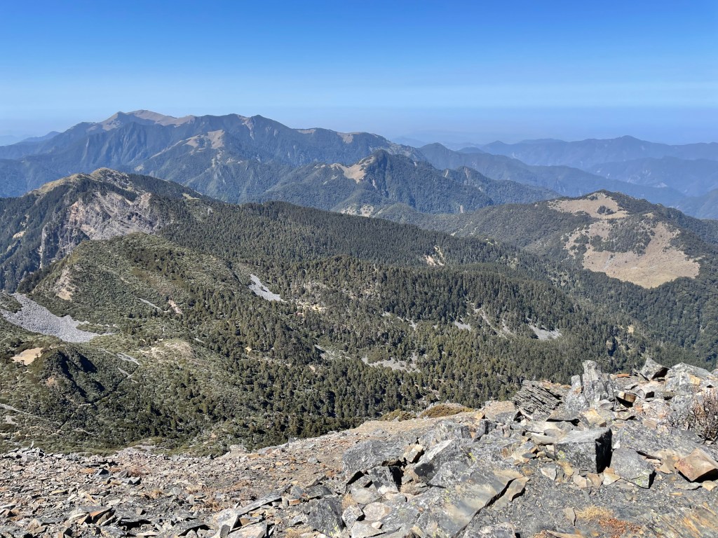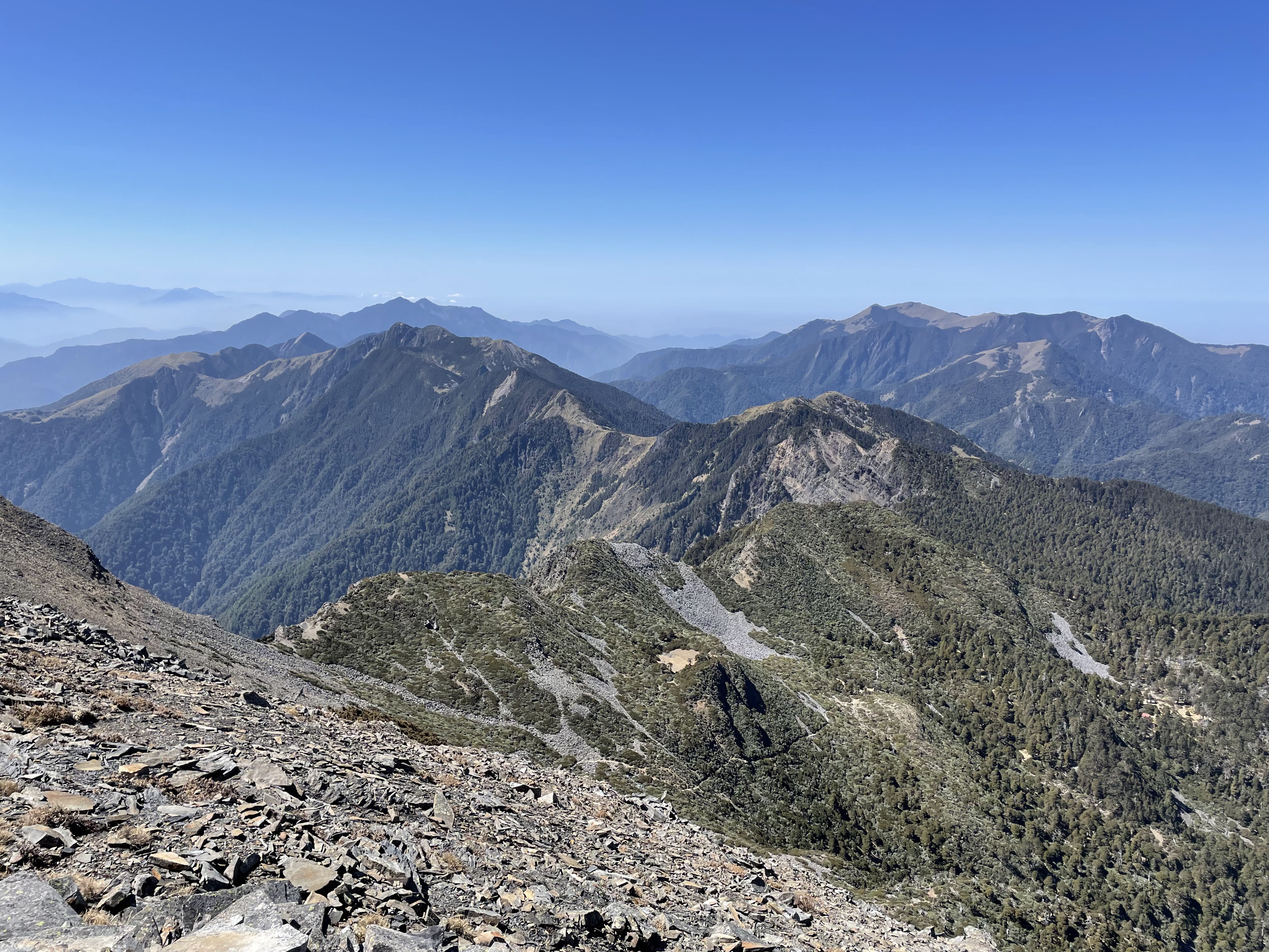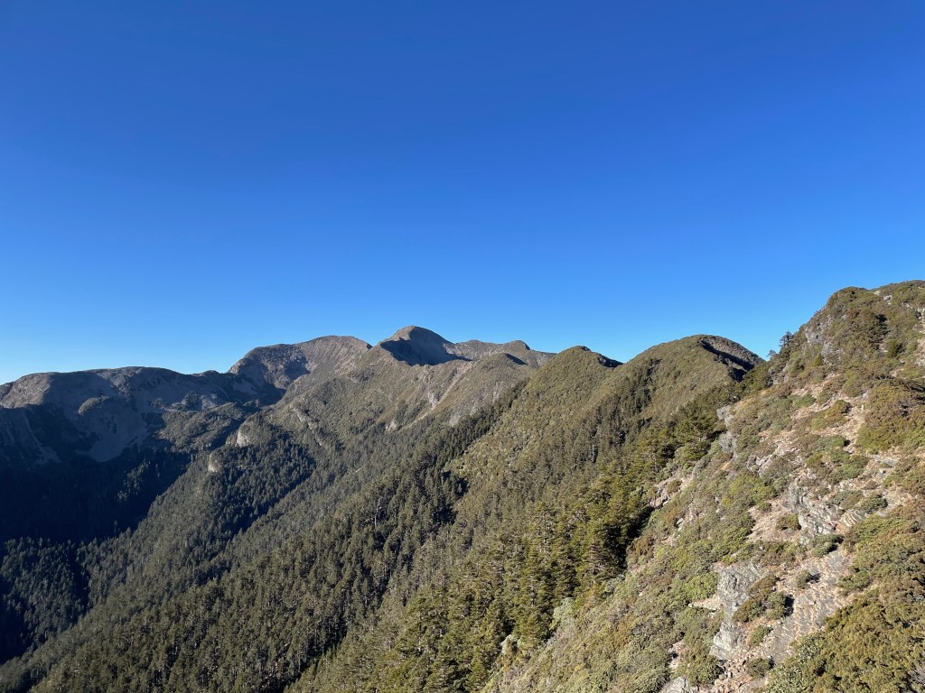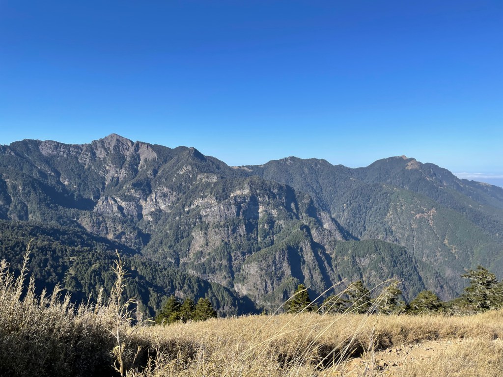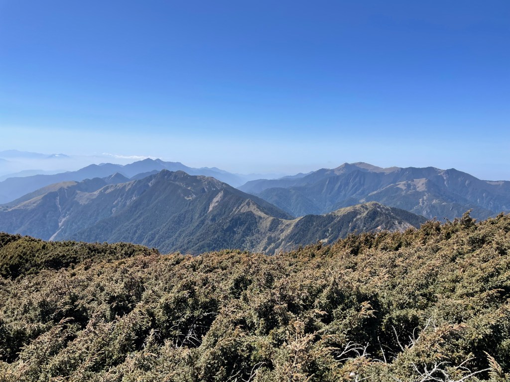 上圖:此時回首來時路,竟見穆特勒布山、大小霸、東霸尖山、布秀蘭山與品田山都清晰可見,而我們今早還遠在品田山之後