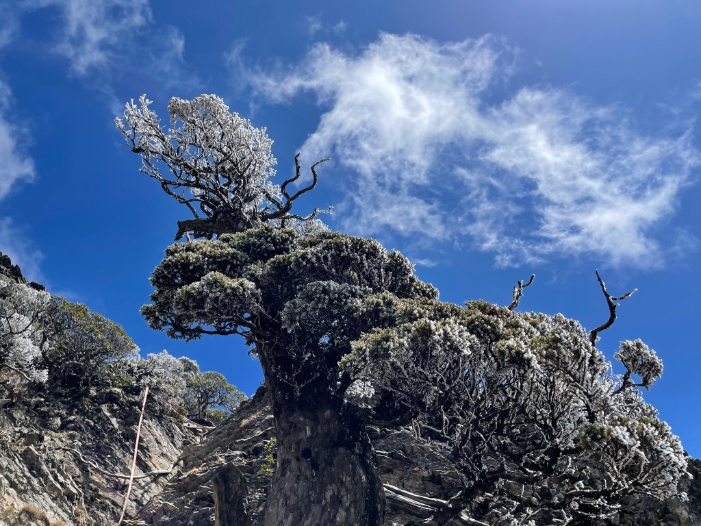 上圖:此時天空大開,豔陽下霧淞與綠意一言不合就融合成言語無法形容的景色,也讓我第一次體會到糖霜為何要用「霜」這個字