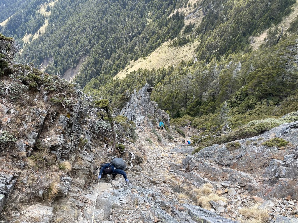 A2:斷崖處毫無疑問是「危險」的,品田三大斷崖除了垂直或接近垂直外,第二斷崖更有一處下攀是沒有踩點的,必須單手拉繩「稍微」鼓起勇氣往側邊跳下,加上斷崖下方都是一小塊傾斜腹地,然後緊鄰萬丈深淵,因此毫無容錯空間,絕對「危險」