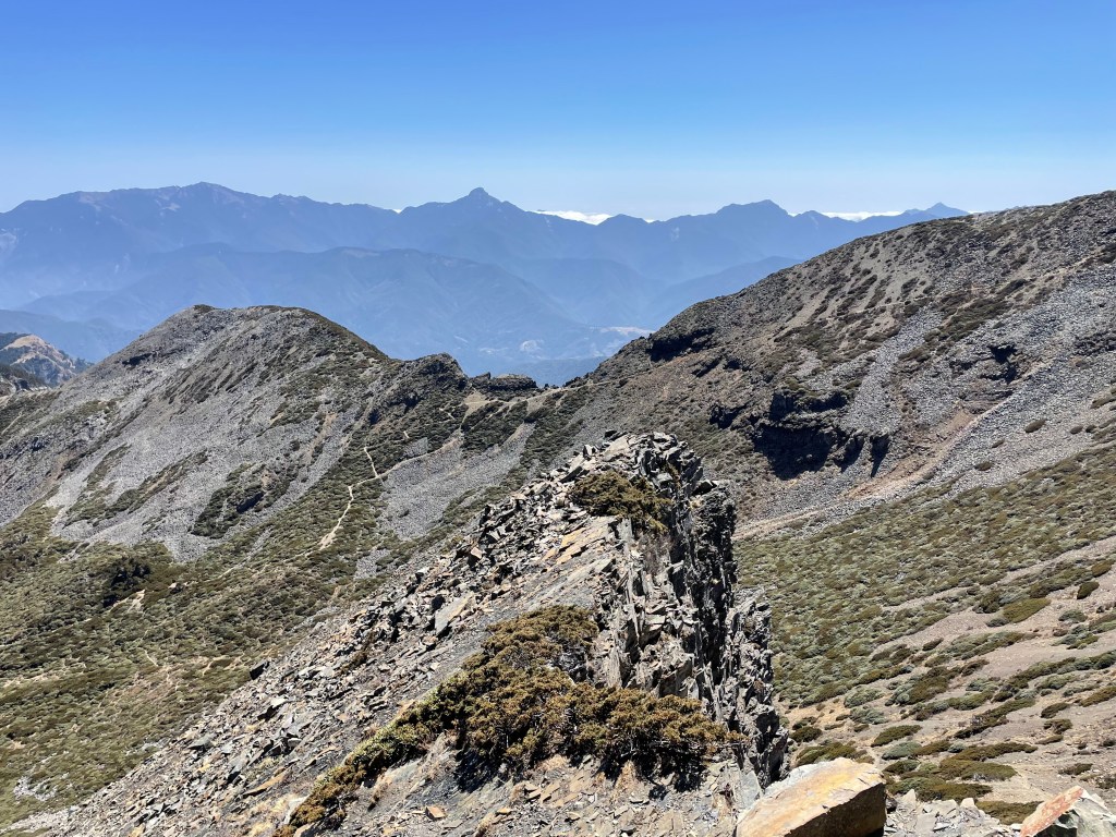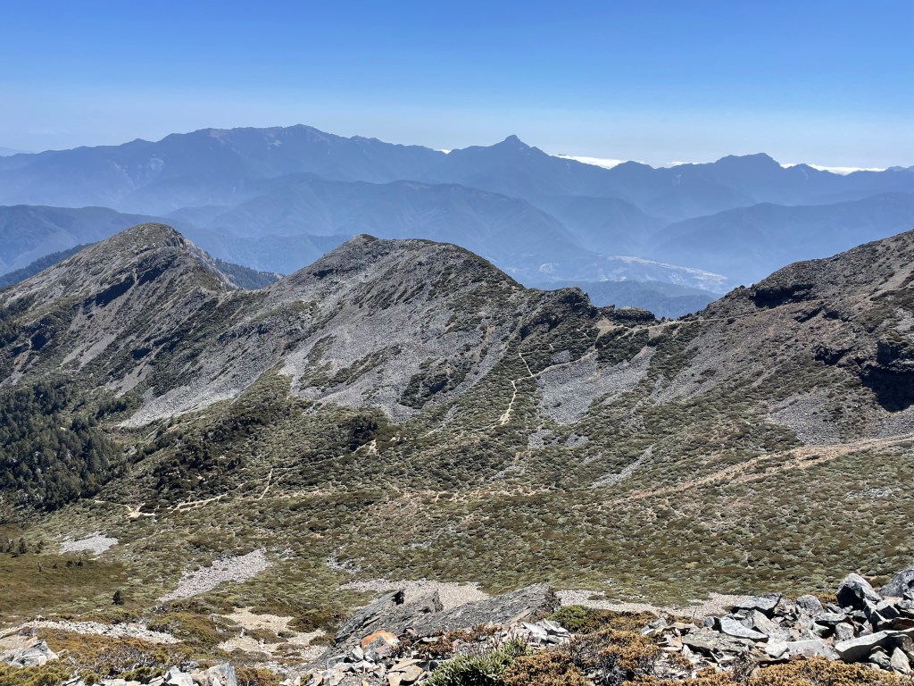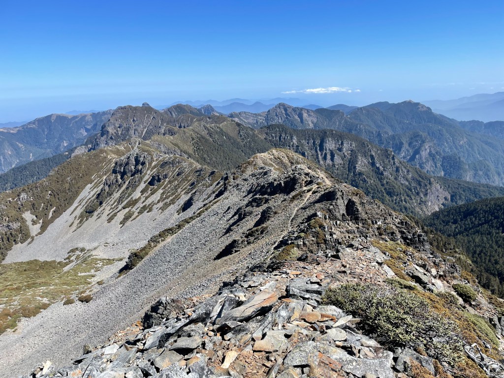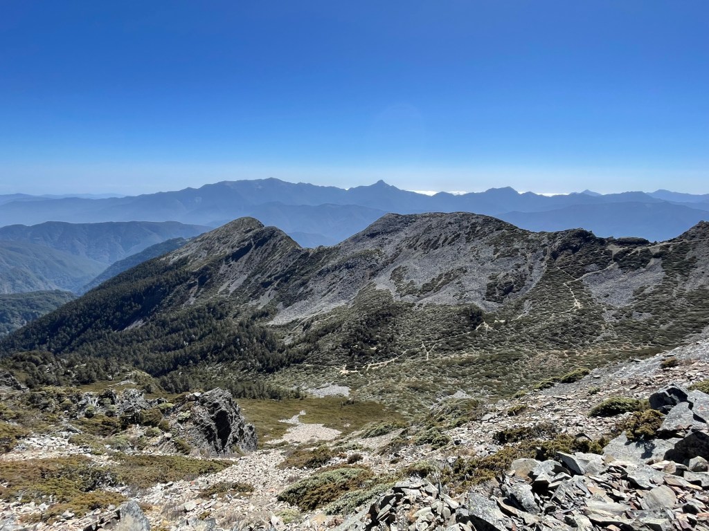 上圖:雪東也是眺望武陵四秀的好地點,在這裡我們可以看到我們起登的稜線,此時品田池有已經變得好遠好遠