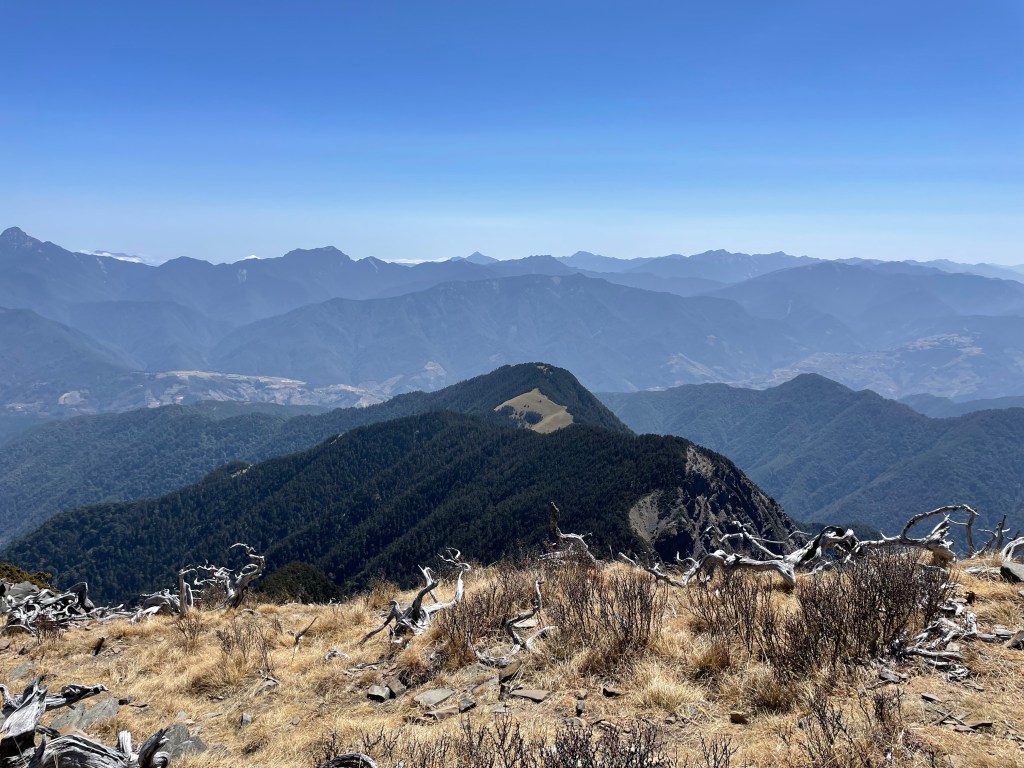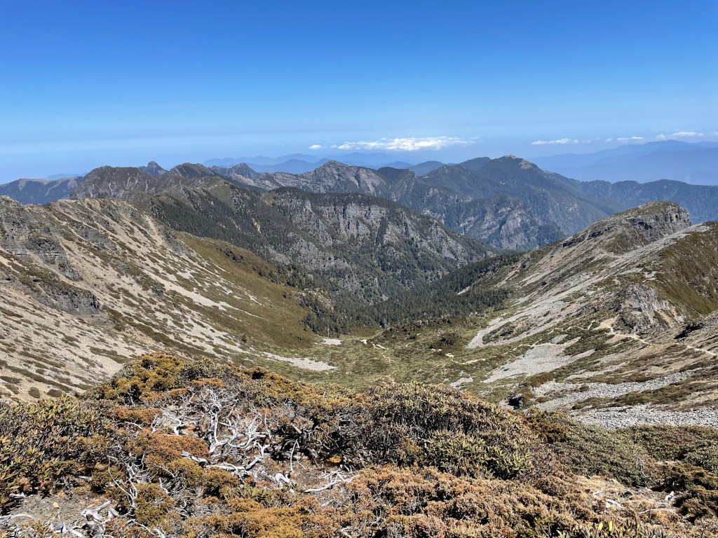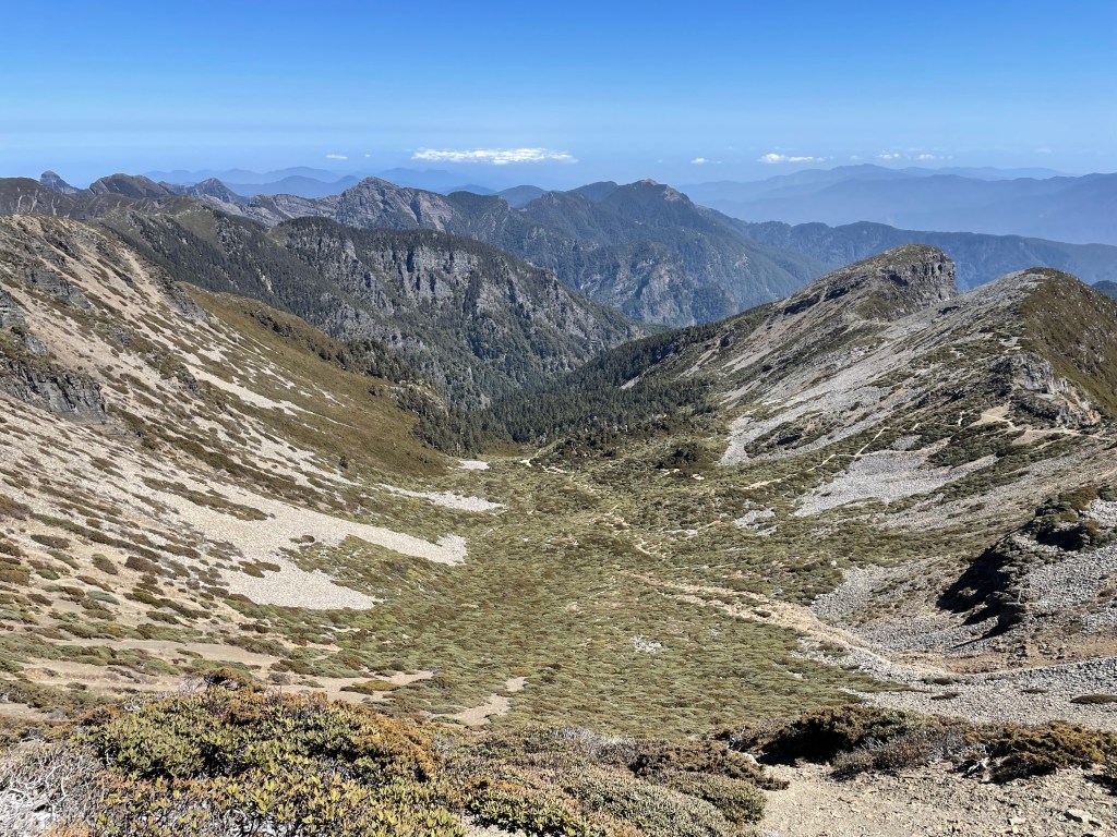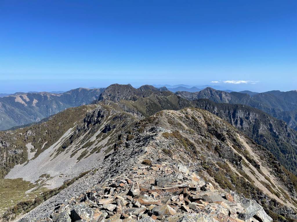 上圖:雪東也是眺望武陵四秀的好地點,在這裡我們可以看到我們起登的稜線,此時品田池有已經變得好遠好遠