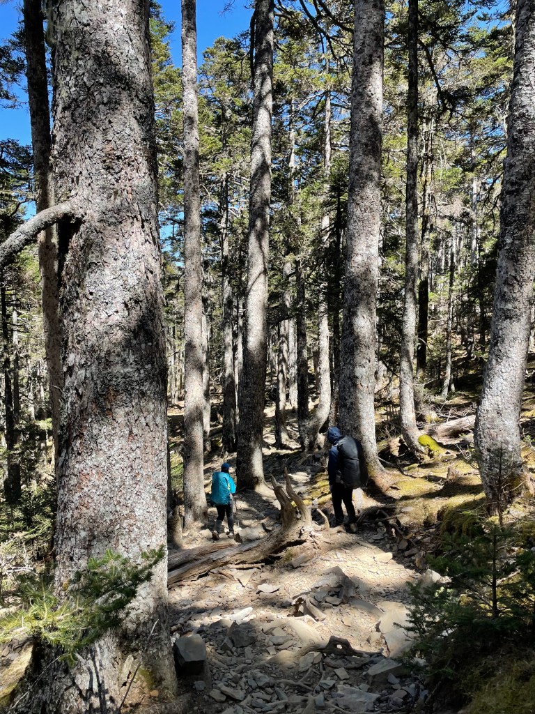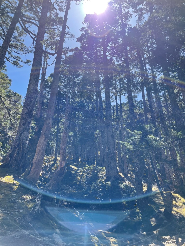 我們在鞍部樹林內小休了一陣,當陽光與微風拂過樹梢的霧淞,林內便下起陣陣冰霰敲打在我們身上,我不知應如何形容這種美麗,也不知何年何月才能再見
