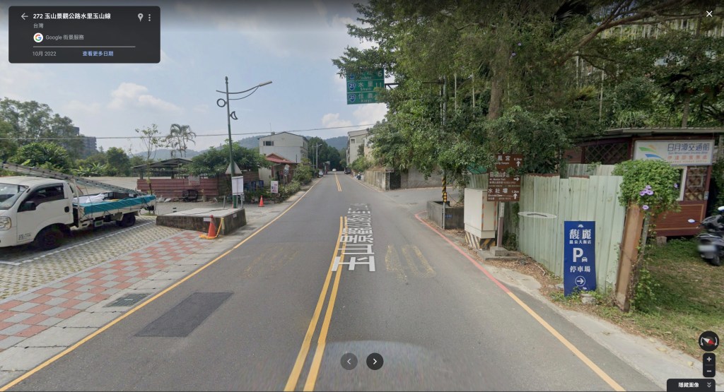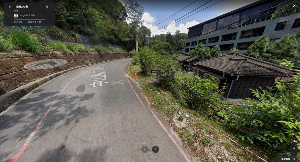 上圖:再走300m後,會看到路徑右側的原魚池紅茶試驗研究所日式宿舍 。照片截錄於Google地圖。13:24