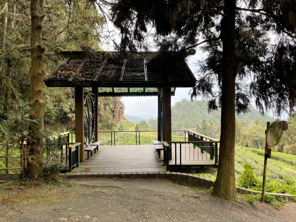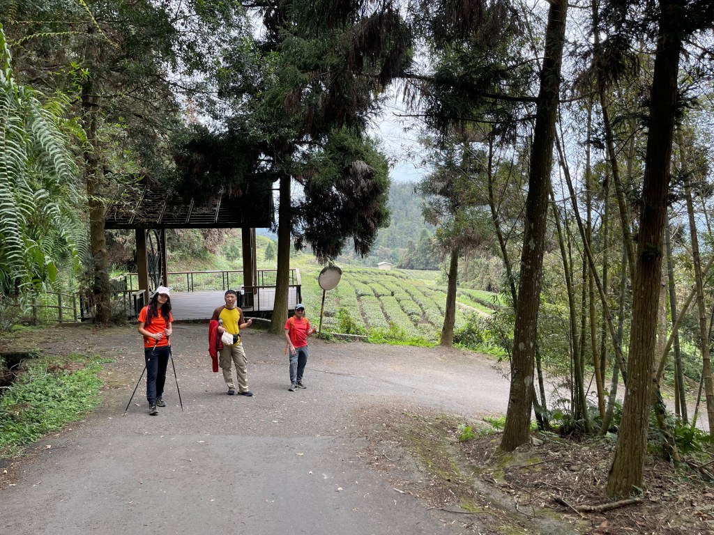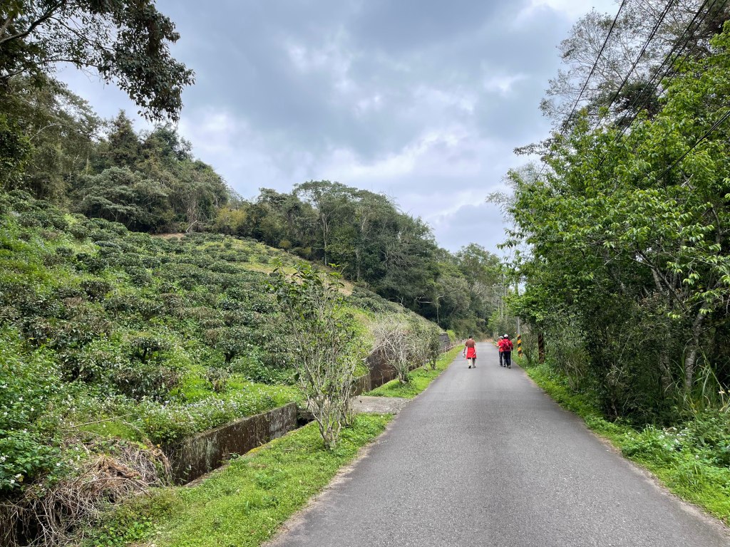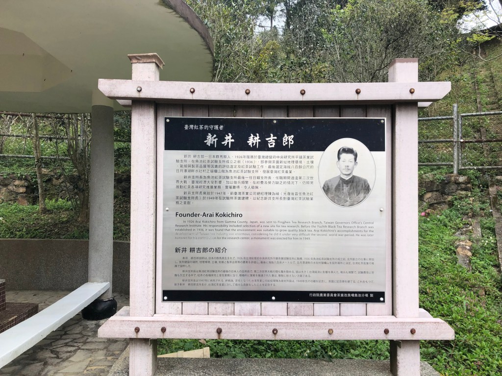 我們將汽車停在日月餐坊 旁的私人收費停車場,沿著台21線往馥麗溫泉大飯店方向走,經過南投縣政府消防局第二大隊日月潭分隊 後,即右轉進入中山路270巷,走1.3K後會抵達新井耕吉郎紀念亭 ,此日本人是第一位將紅茶栽種引進台灣,此紀念亭為為紀念而設,這裡也是行政院農業委員會茶業改良場 的入口,一般汽車無法進入。