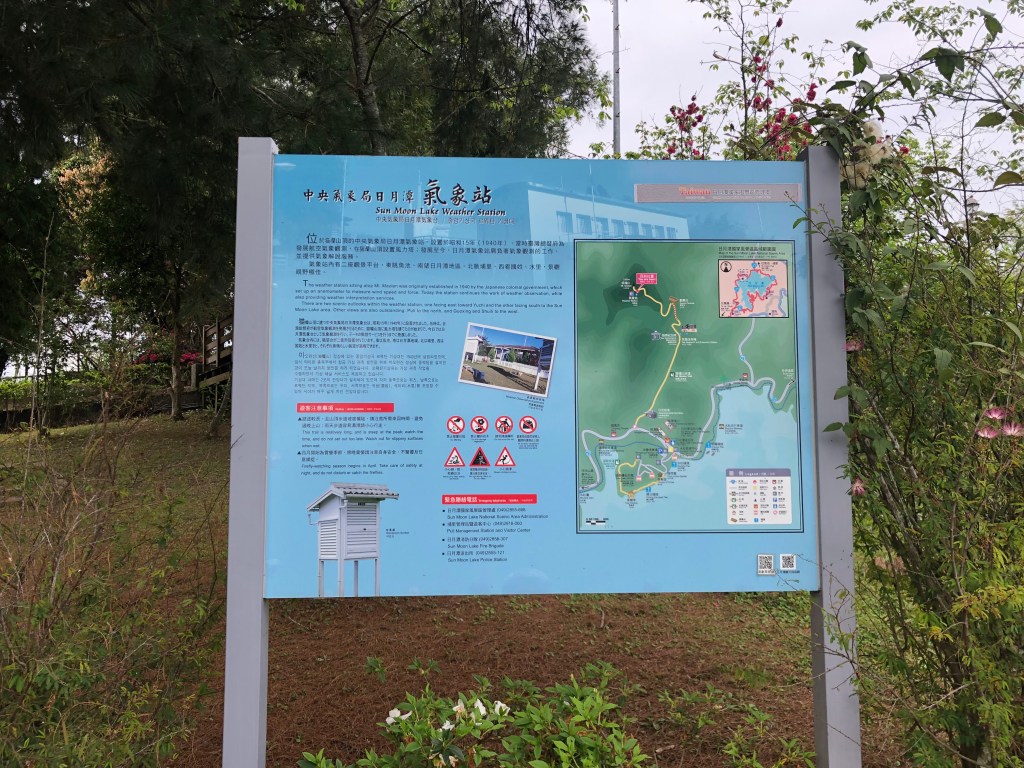 上圖:告示牌上寫著:午後山區氣候多變,遇惡劣天氣時(雷雨、豪雨),日月潭氣象站暫停開放,請遊客不要上山。這表示,天氣非常不好時,貓囒山就無法抵達,因為貓囒山就位於氣象站裡面。
