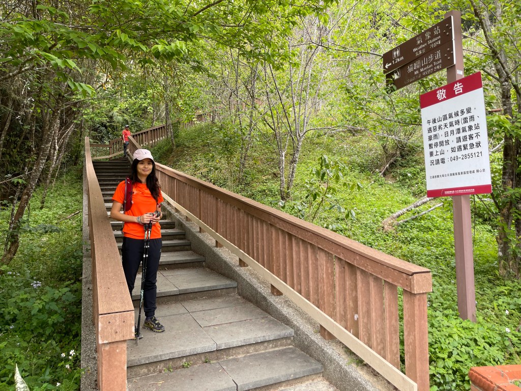 在新井耕吉郎紀念亭 這裡,由左側階梯陡上,就是貓囒山步道的起點,由此陡上到貓囒山的距離為1.4K,一路都走在柏油的產業道路上,沿路會看到粗壯的錫蘭橄欖樹,以及經過四個觀景台後,看到一路的日本柳杉,當看到交通部中央氣象局日月潭氣象站時,由大門進入一小段就會看到貓囒山巨石以及三角點。