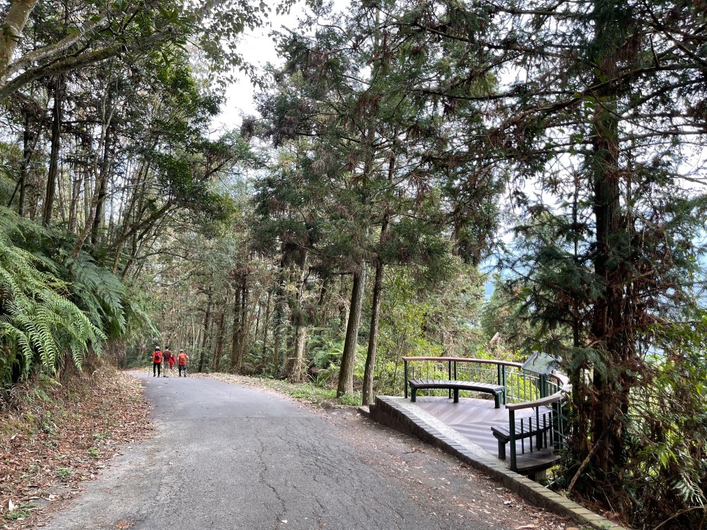 13:17 日月餐坊旁停車場 (總里程0.0K) 13:24 日式宿舍 (總里程0.5K) 13:34 最後停車場 (總里程1.2K) 13:39 新井耕吉郎紀念亭 (總里程1.5K) 13:50 第一(日本柳杉)觀景台 (總里程1.9K) 13:55 第二(明潭涼亭)觀景台 (總里程2.05K) 13:58 第三(半月形狀)觀景台 (總里程2.3K) 14:01 第四(電塔線路)觀景台 (總里程2.4K) 14:12-14:28 貓囒山 (總里程2.9K) 14:53 新井耕吉郎紀念亭 (總里程4.3K) 14:57 最後停車場 (總里程4.6K) 15:06 日式宿舍 (總里程5.3K) 15:13 日月餐坊旁停車場 (總里程5.8K)