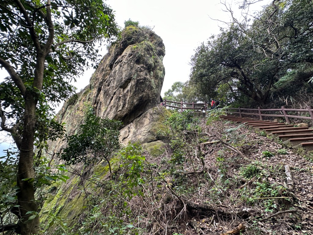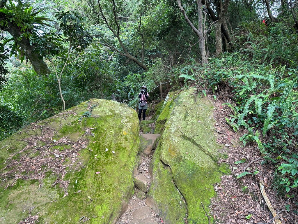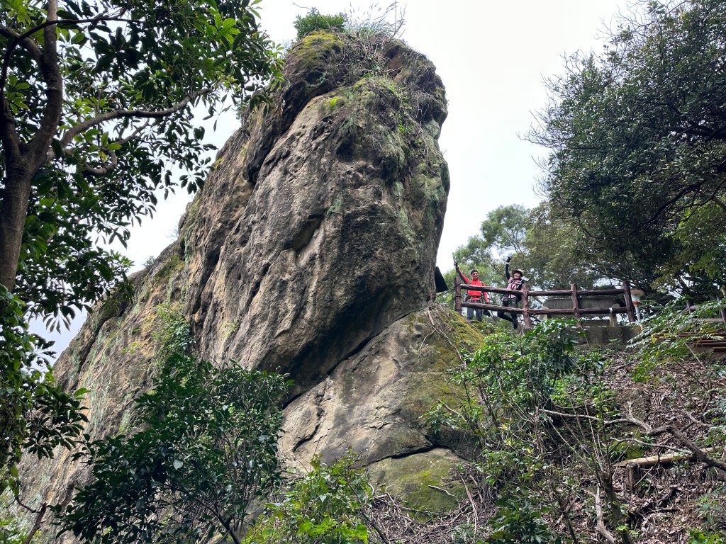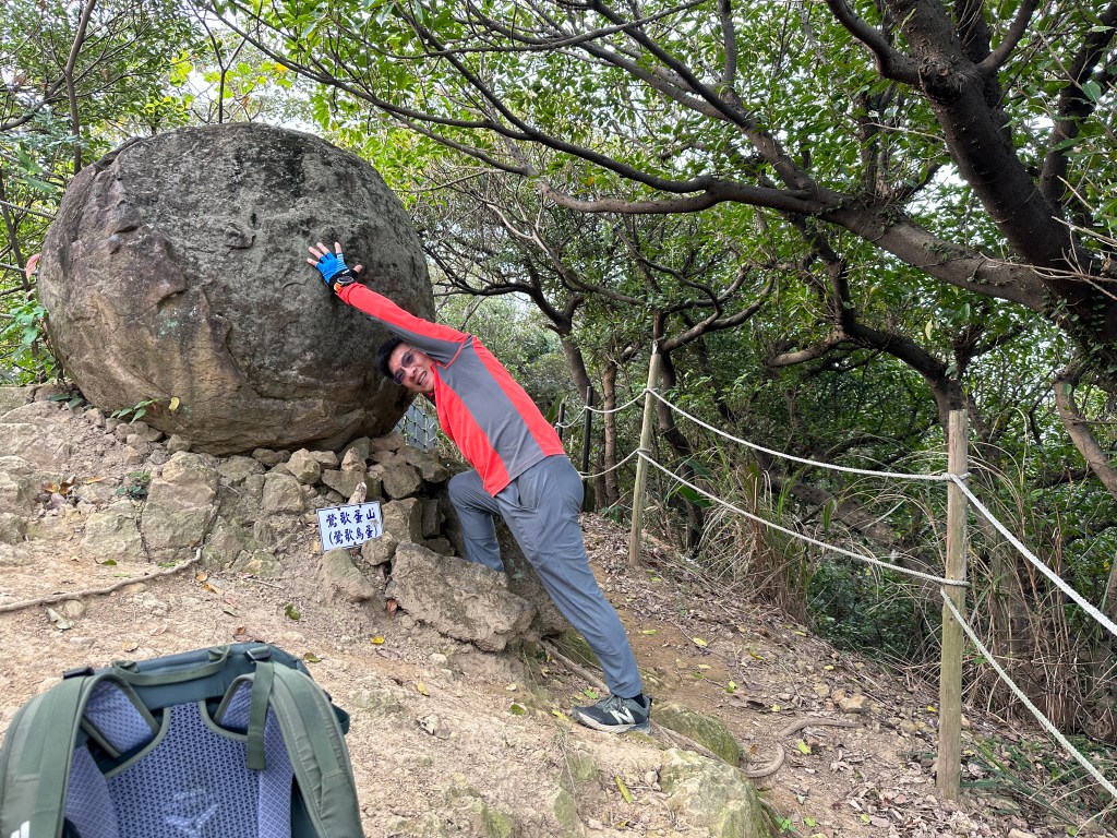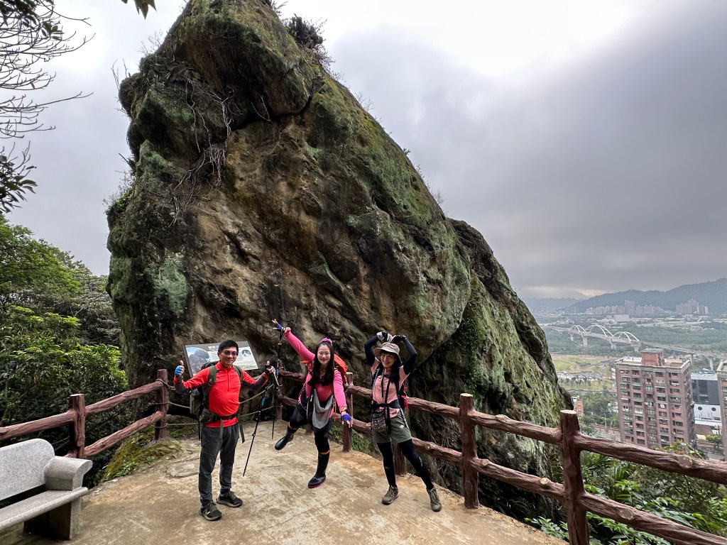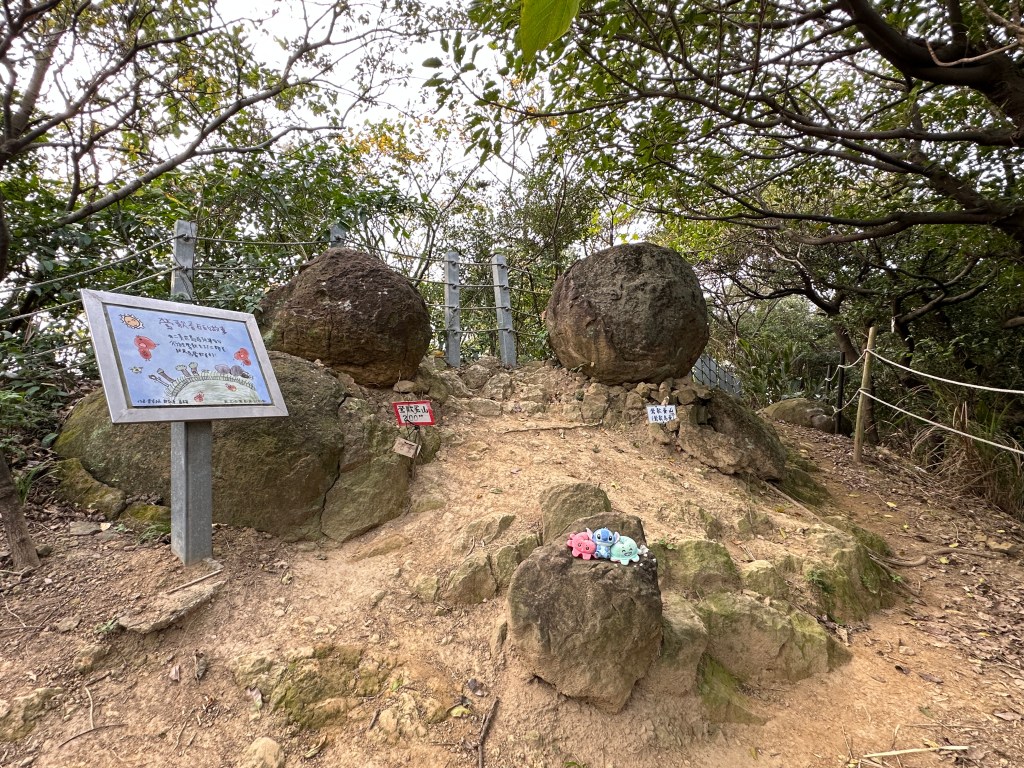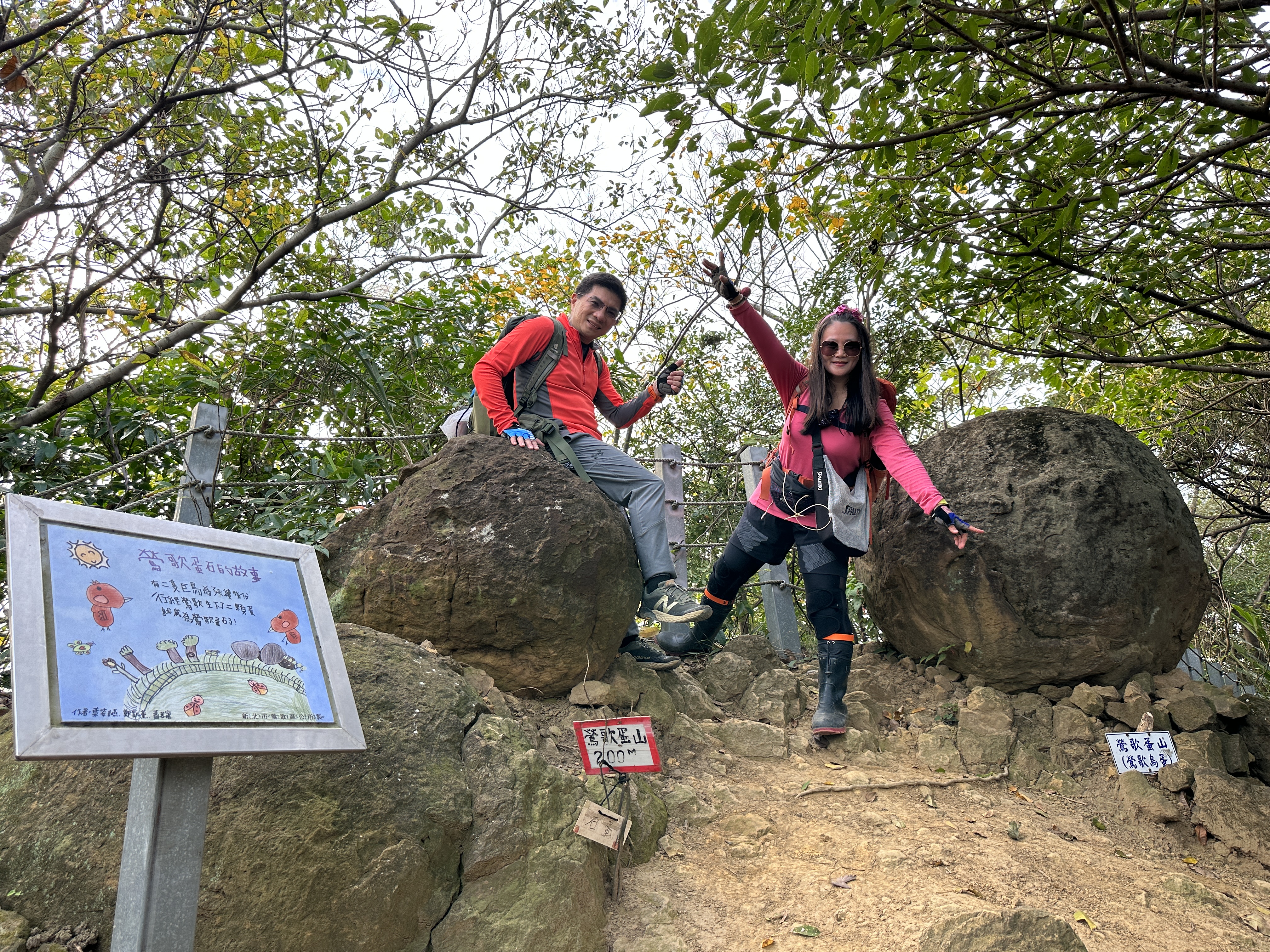 由大湖山回走到大湖山岔後,接著的路線就又回到優美型態了,一路沿著產業道路陡下經東福宮、三湖宮、東湖宮後,再度進入山徑,由東湖步道接上幸福步道,右岔沿著幸福步道走約300m就會來到鶯歌蛋山,真是令人驚艷!真的有兩顆擬真圓形的蛋石!三人在此輪流拍照一番。