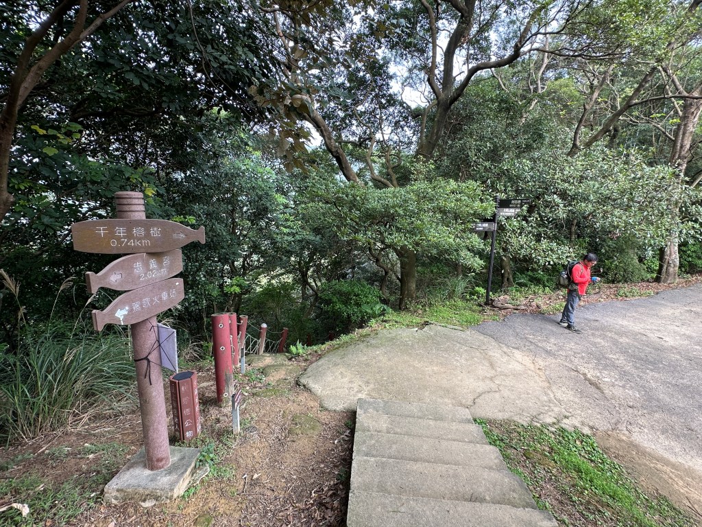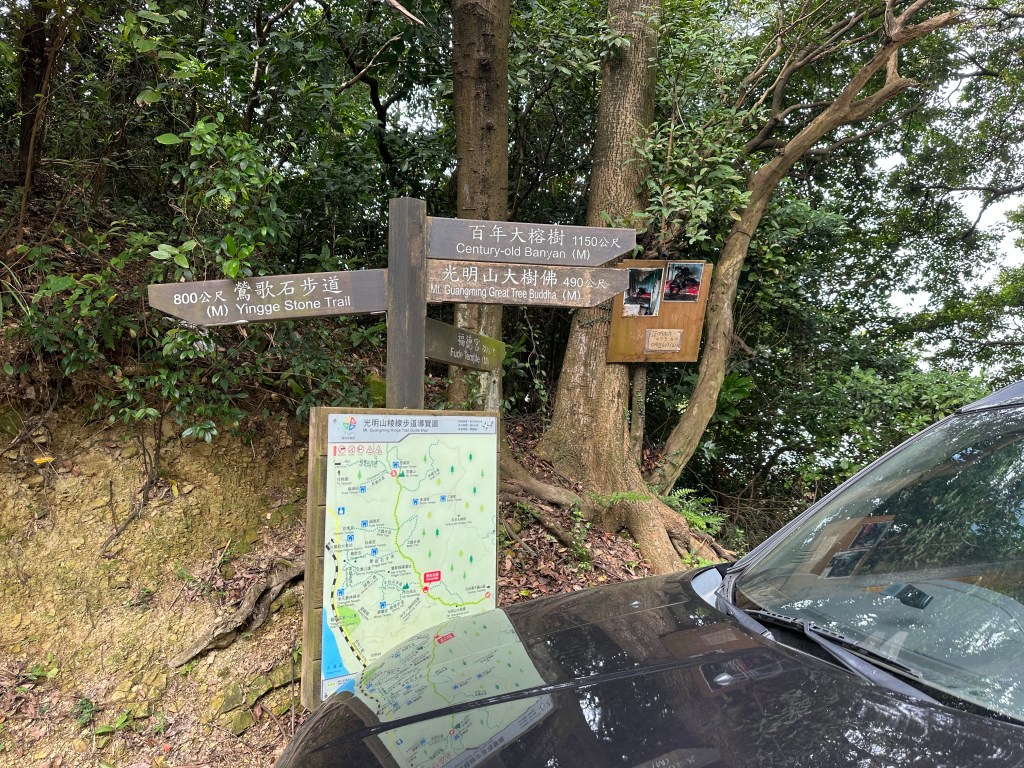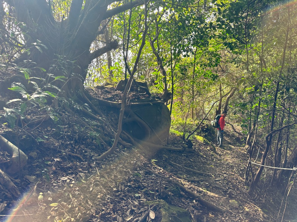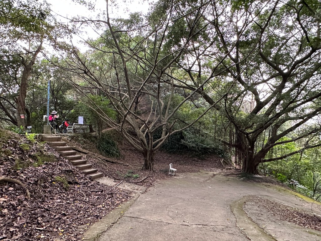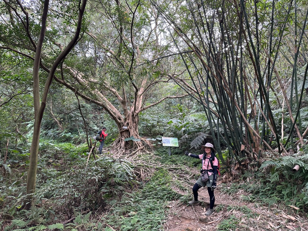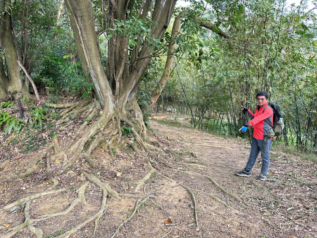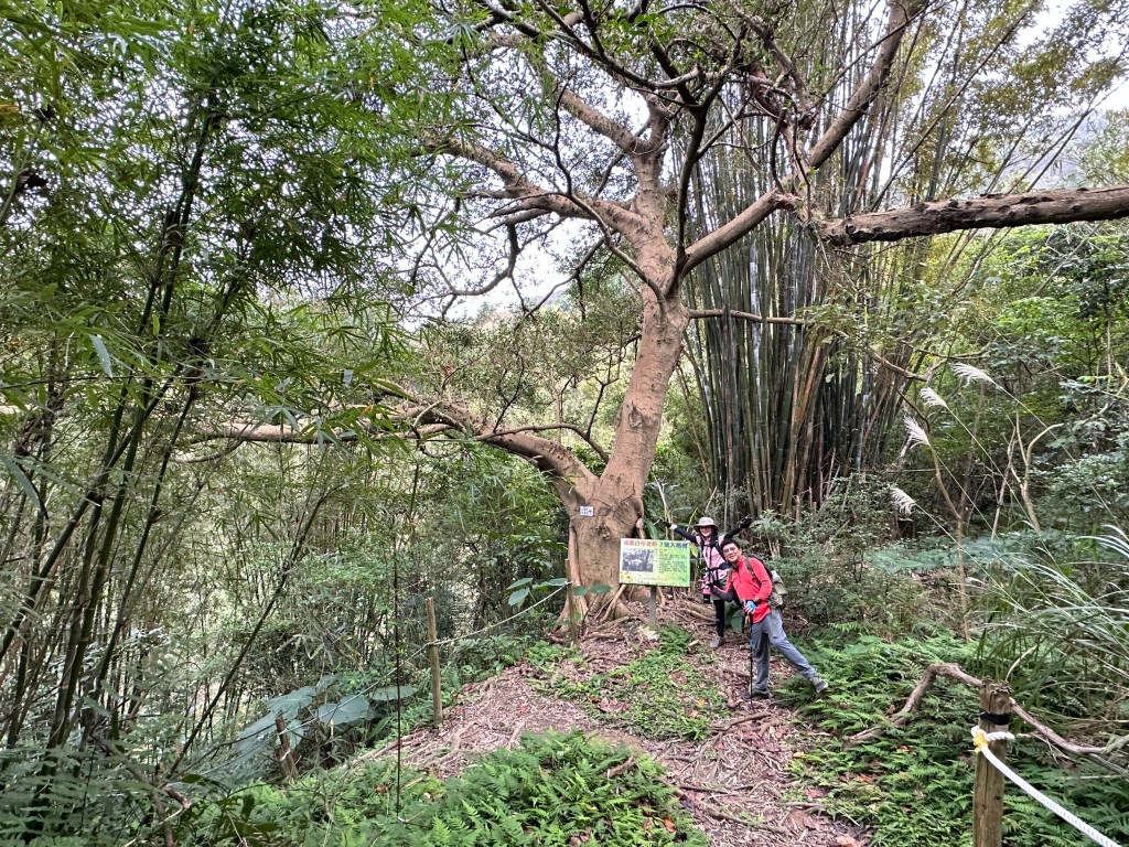 由阿南坑山回到光明山稜線步道後,繼續陡上即可接上產業道路,直走山路直上100m的距離可以通往望湖山,我們先往左100m去看百年大榕樹,接著就在此吃午餐,休息了將近半小時。