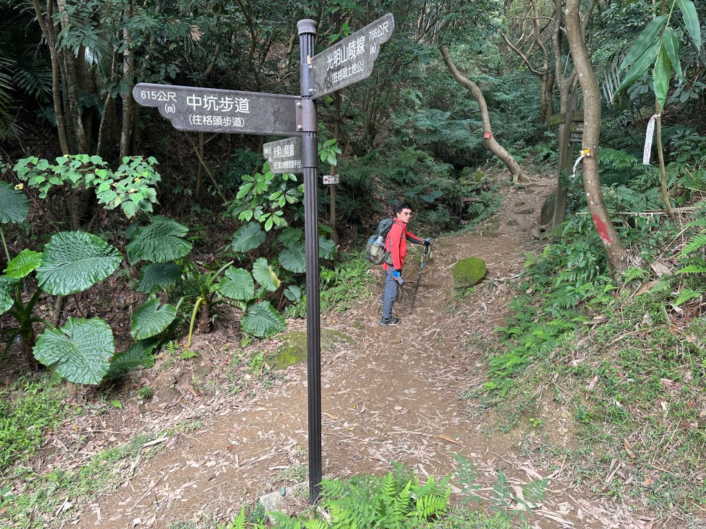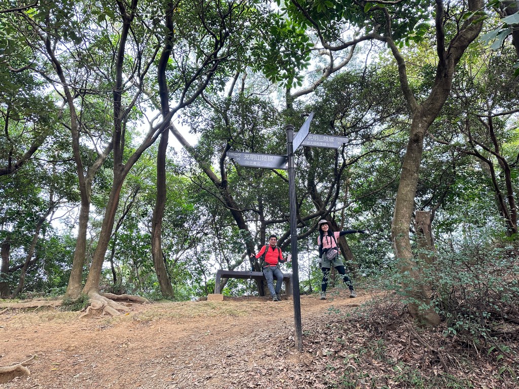 回走200m會回到剛才穿出來的岔路口,持續沿著牛灶坑步道再走100m就會接上光明山稜線步道,在此三岔路左轉走100m抵達彰埔坑山,這已經是今天的第五峰。稍微休息一下,再度原路而回到牛灶坑步道與光明山稜線步道的三岔路,接著就一路沿著光明山稜線步道而上,中途有右岔路可以通往阿南坑山,右岔出走200m可抵阿南坑山,但這一路段原始少人整理,比較崎嶇一些。