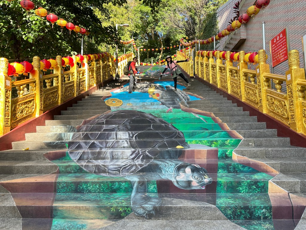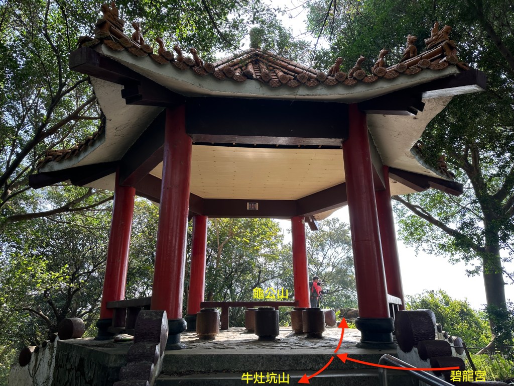 要上碧龍宮前有彩繪階梯,上了階梯可以站在碧龍宮前的大廣場上享受空曠的展望!由碧龍宮右側石階梯往上走100m直接陡上有40m的高度即可到達龜公山,其實在此龜公山的三岔路,沿著碧龍步道可以通往牛灶坑山,但我們要再去接上阿四坑山,因此原路折回到碧龍宮,就改由左側有100m長度的極陡階梯直下海拔30m的高度,左轉接上碧龍巷有200m的公路,有一左岔陡上後就可以走到阿四坑山,三角點在山徑邊右側的樹林內,要由山徑走進約50m就可到。