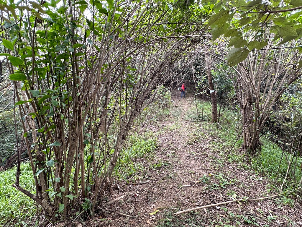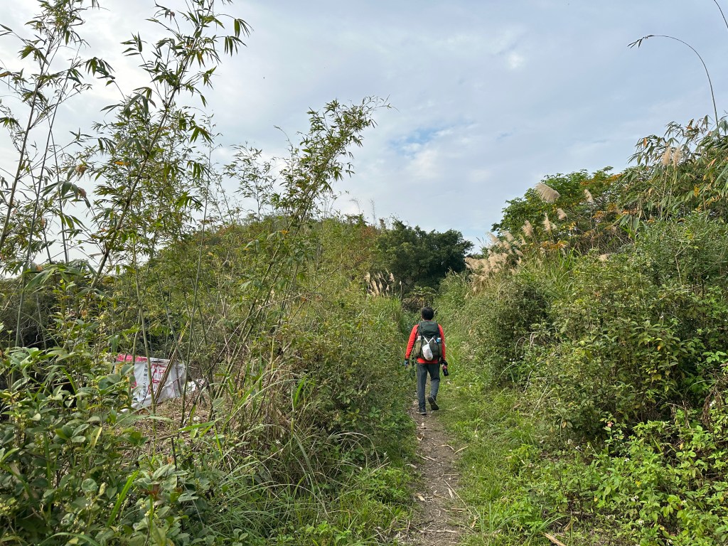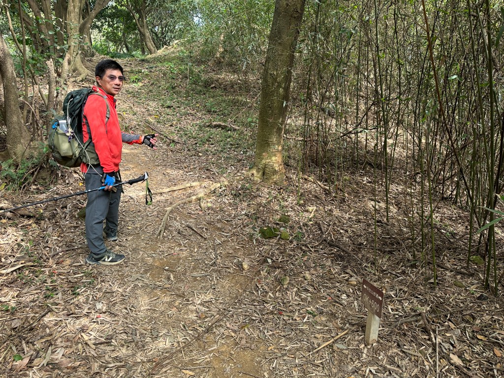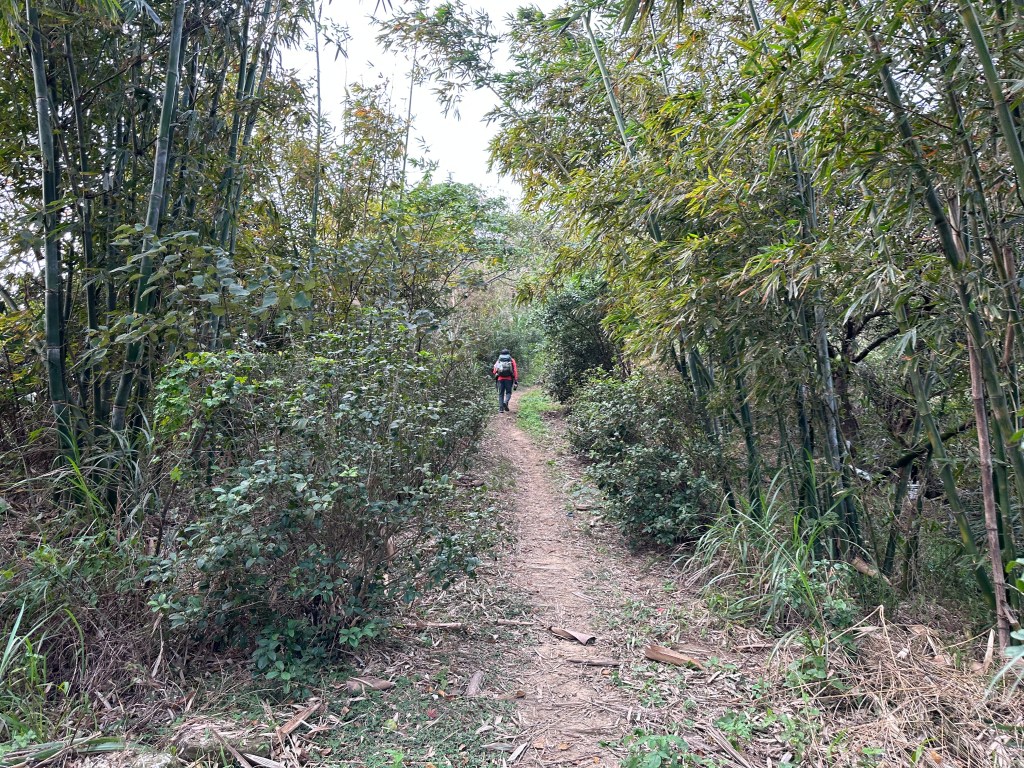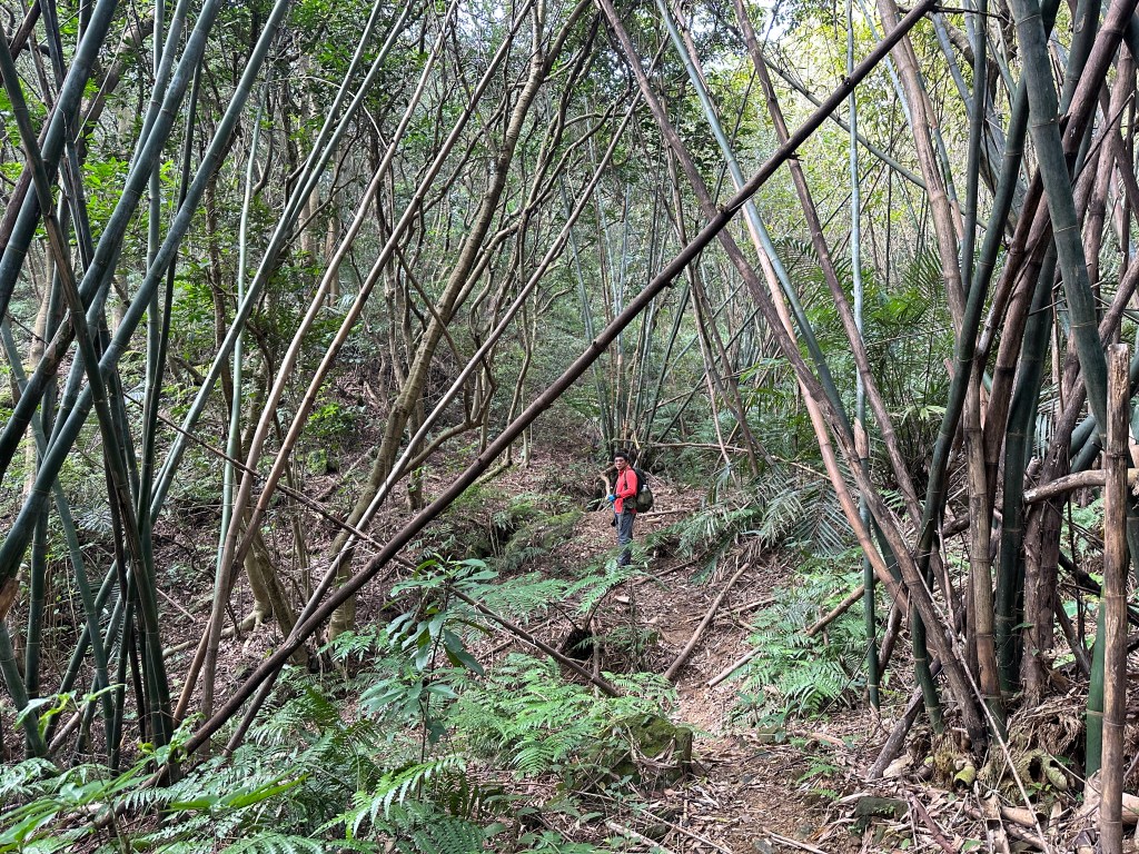 離開阿四坑山後繼續沿著山徑走,接上阿四巷後左轉沿著阿四巷往上走,看著離線地圖上有一條岔路可以接上牛灶山步道,取這一條捷徑走100m即可接上,這一條捷徑路上其實沒有路徑指標,但看得到上方的牛灶山步道,所以就由竹林內直穿就行。然後接上牛灶山步道後,左轉走200m即可抵達牛灶坑山。