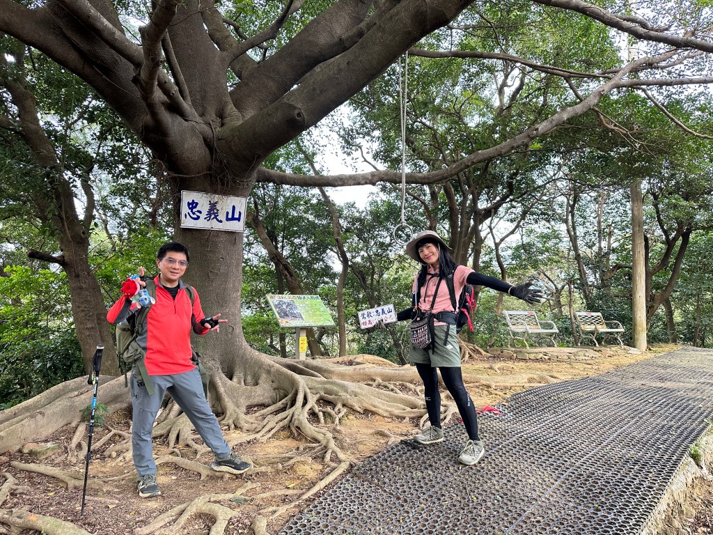 接著,再由再原路沿著幸福步道走回,接上一段山徑就會再度接上光明山稜線步道,就會看到忠義山,沒有三角點就是以一棵大樹做為基點。再往前100m就看到忠義宮,又是一個看晚霞落日的好地方,展望非常的好!
