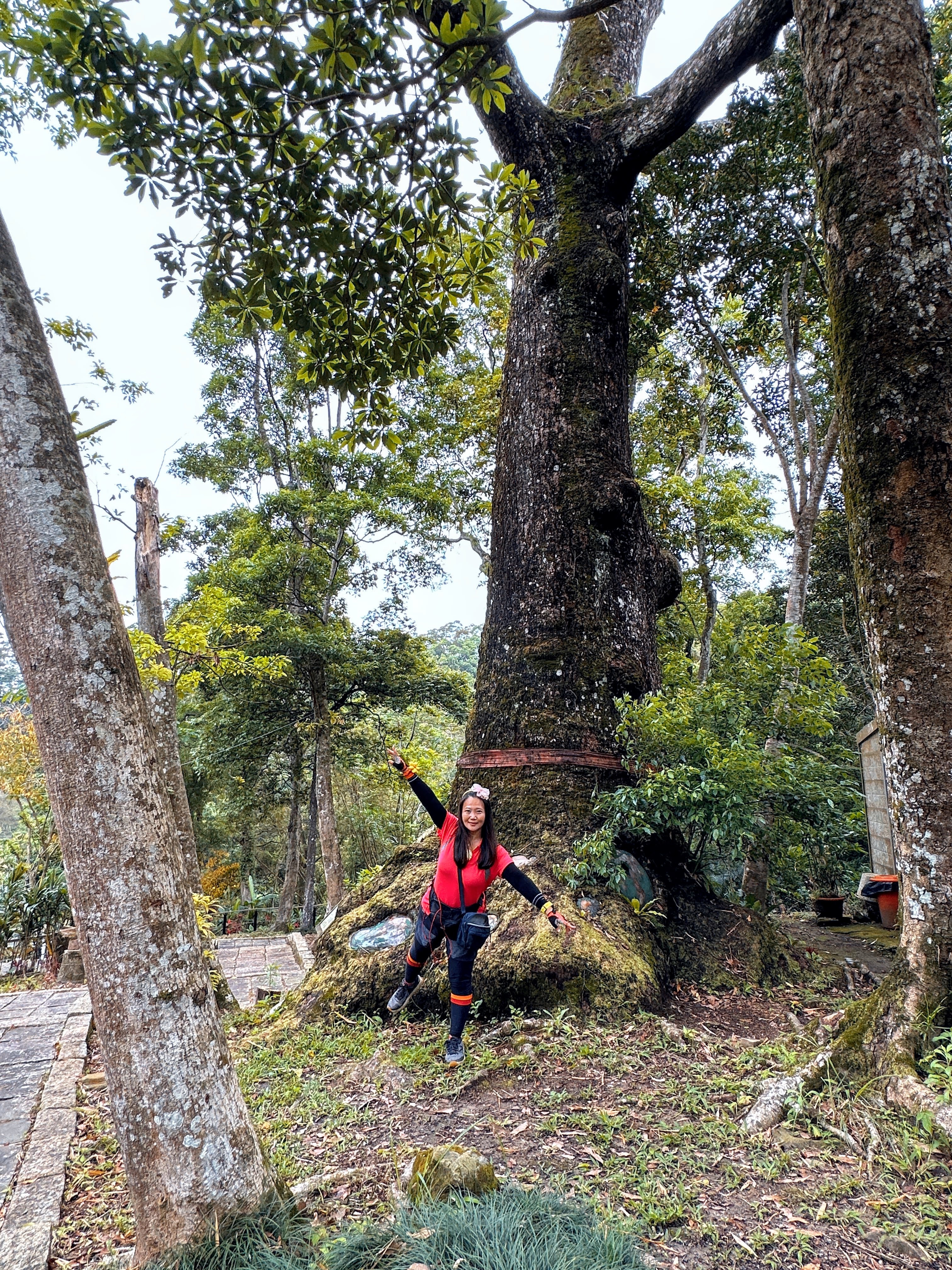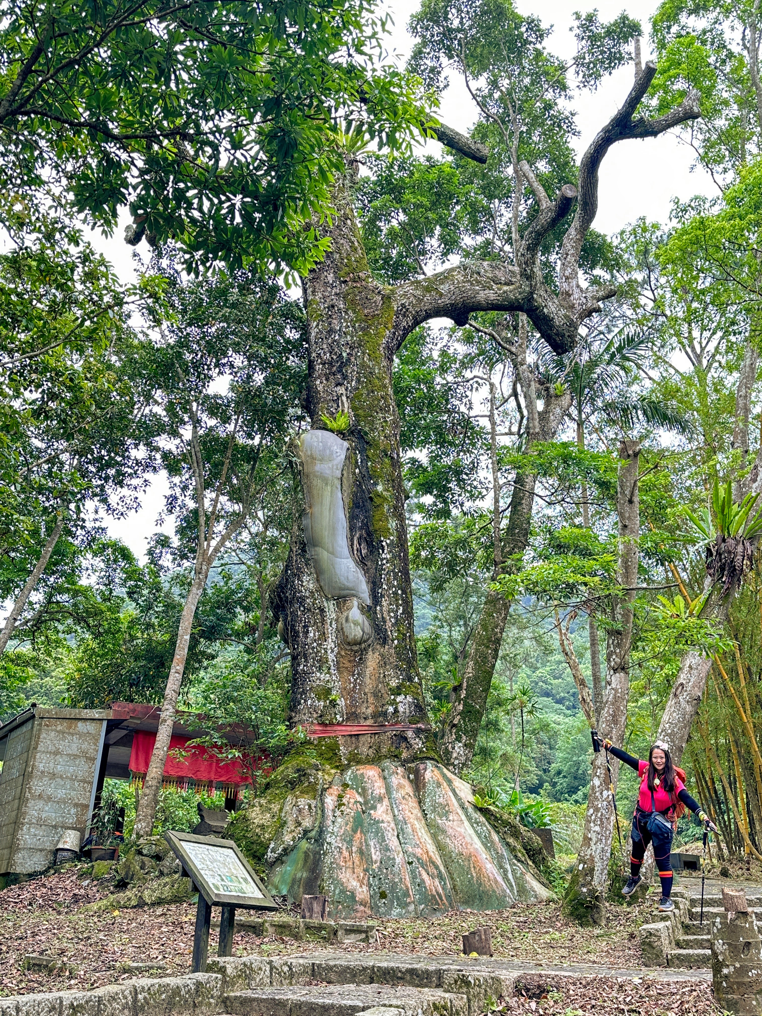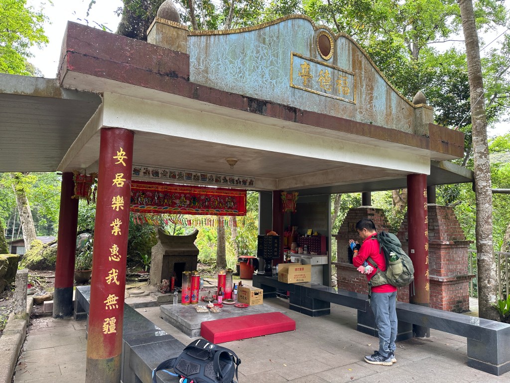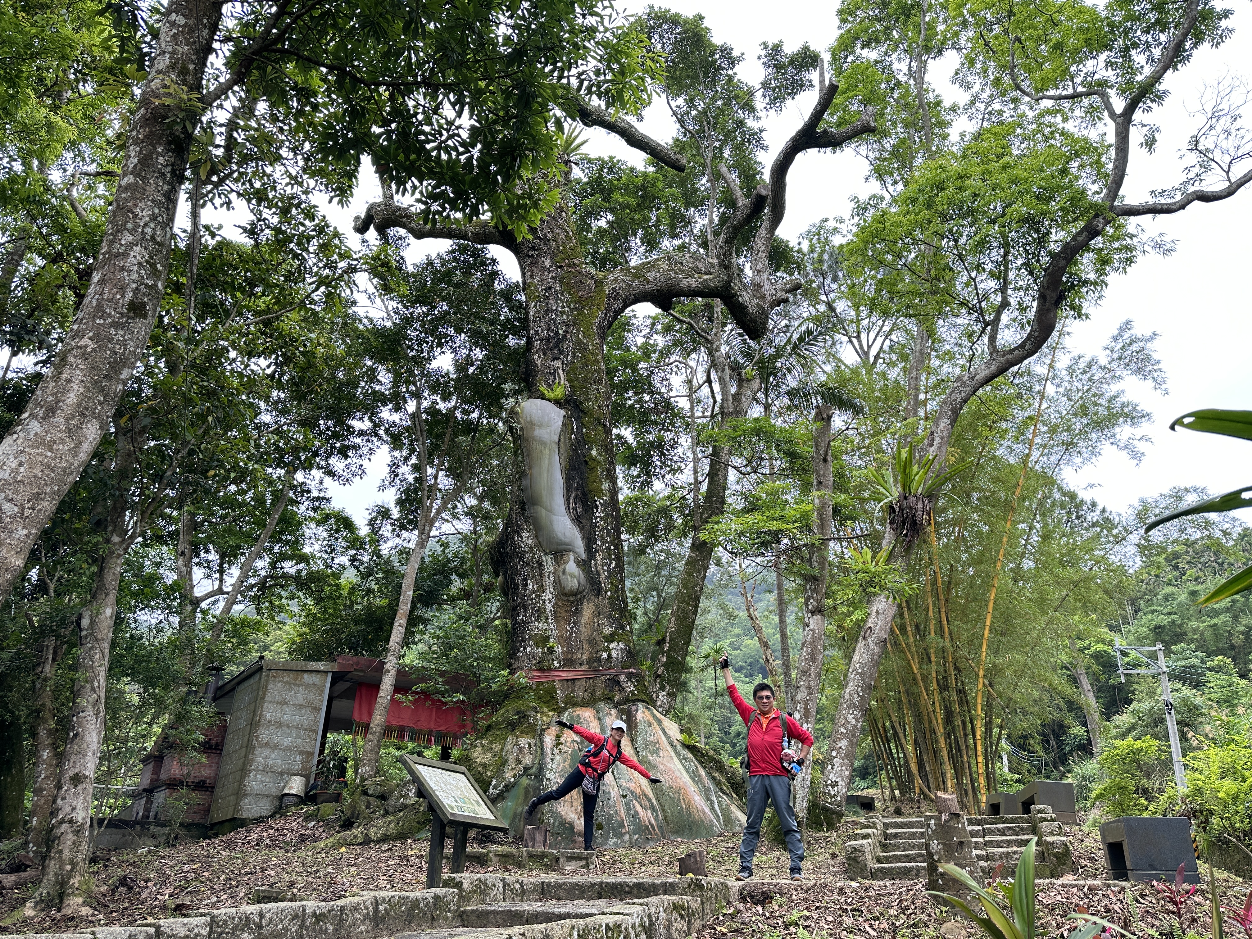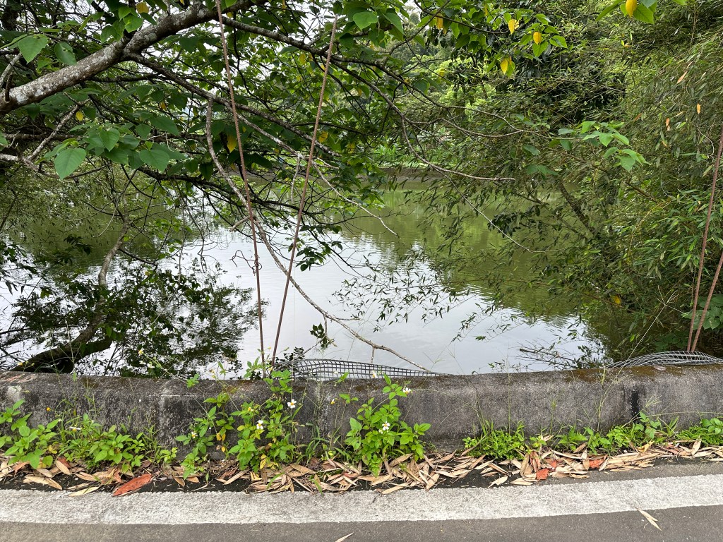 接著要去二寮神木,路上開始偶飄著極不明顯的雨滴,二寮神木旁有一座福德宮,看了雄偉且被拯救過的神木後,再往二寮岡頂山走,登山口在產業道路上但完全不明顯,進入後,發現要過水池,應該是上一波的梅雨導致溪水過高導致水池的水位太高,硬要跳過去或許我(Gosen)沒有問題,但考慮到Smile萬一沒有跳過大概就要洗泥澡(泥沼)了!因而放棄!