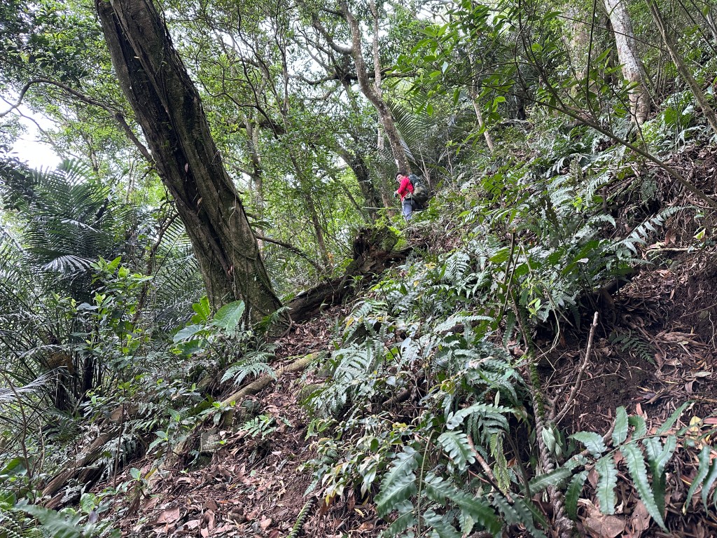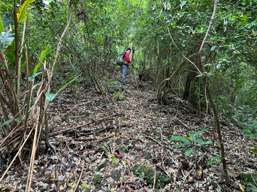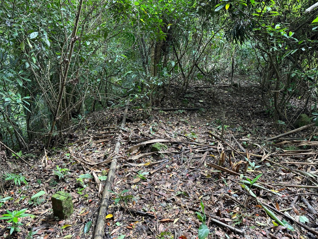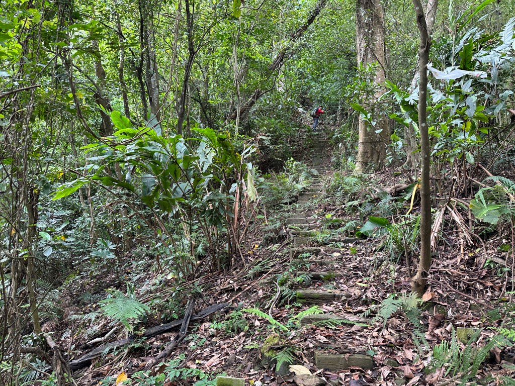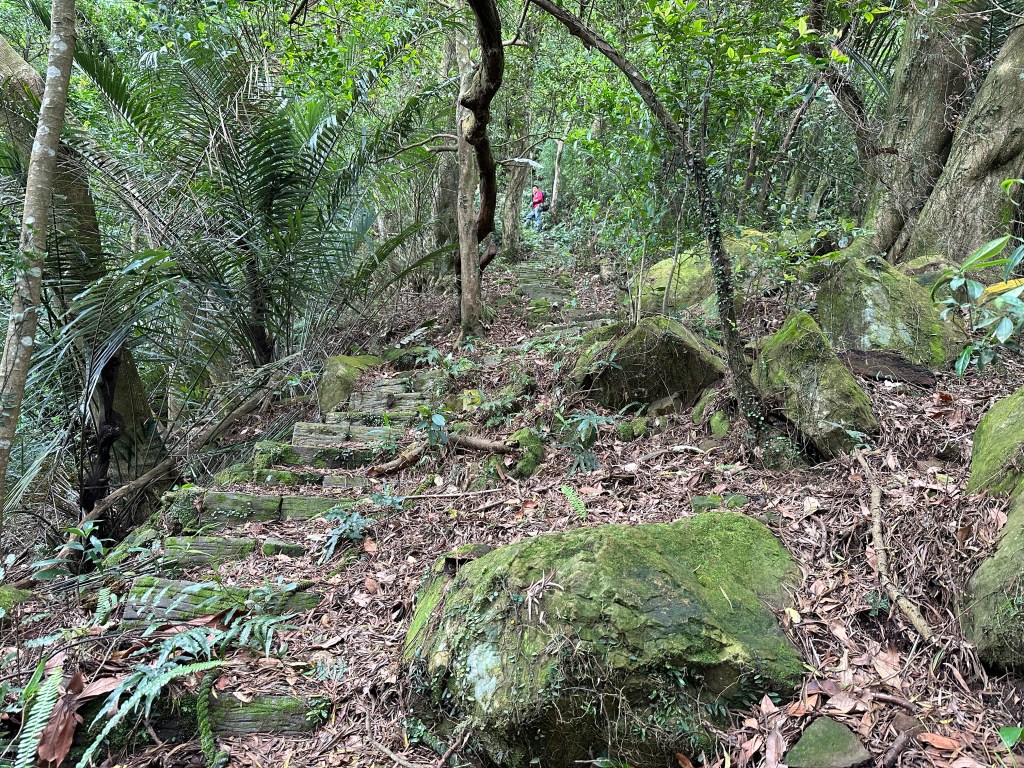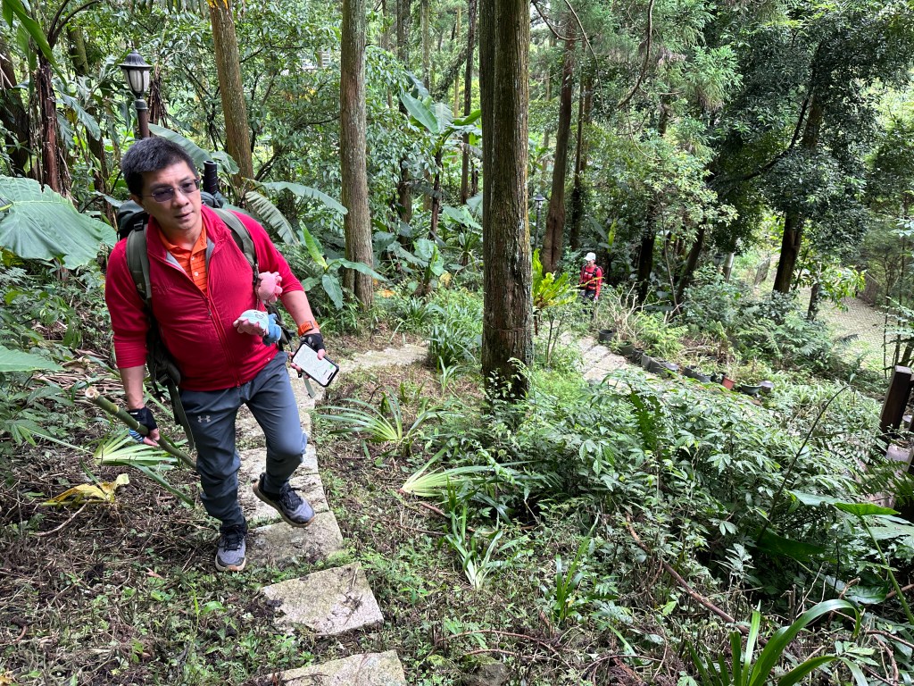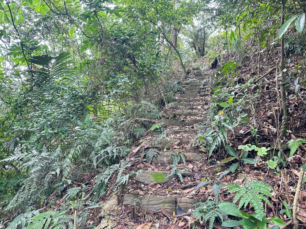因此,三人決定退出改由產業道路繞大圈一些,由離線地圖上看到假山頭之間兩端皆有產業道路,中間有一小段約差了100m的距離就可接上?但離線地圖上來看是沒有軌跡路線的?因此,我們三人想嘗試突破看看?要先由一小木屋旁開始陡上,走沒幾部,就發現到這一小段的陡上路徑,在豐厚植披底下仔細撥弄居然可以看到有小石階鋪成的老舊階梯,但不知有多久沒人走過?