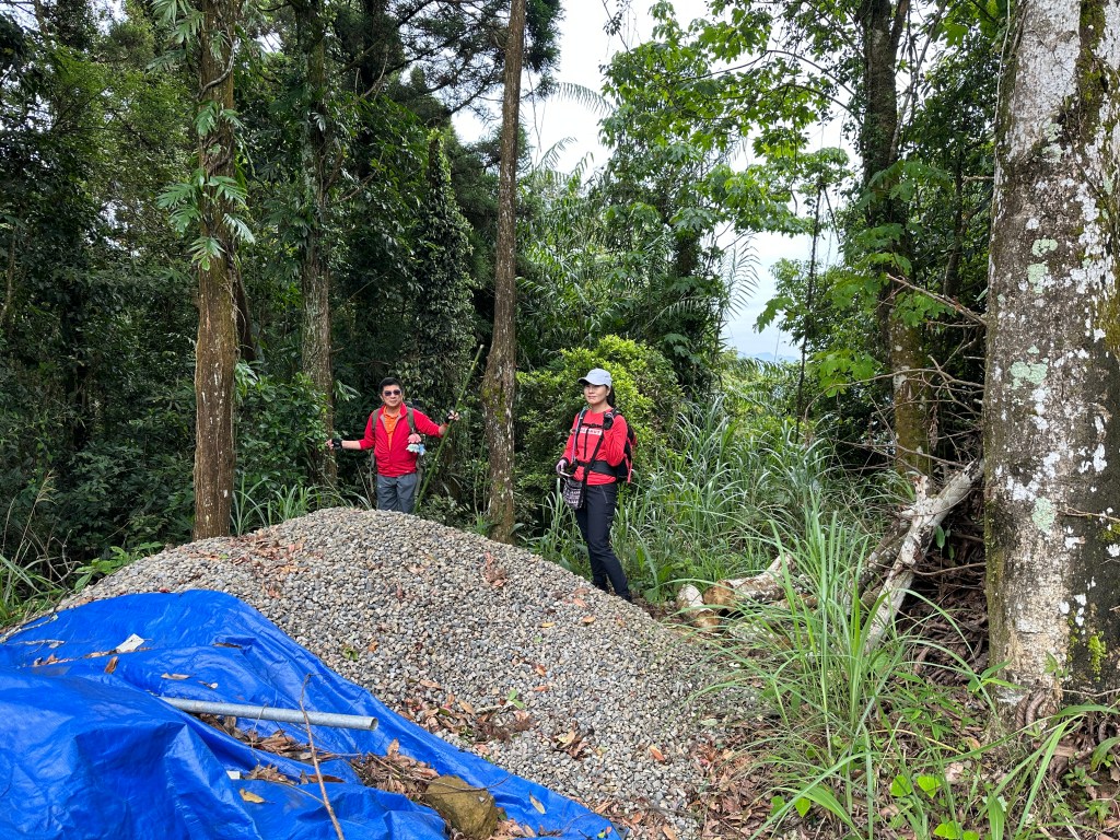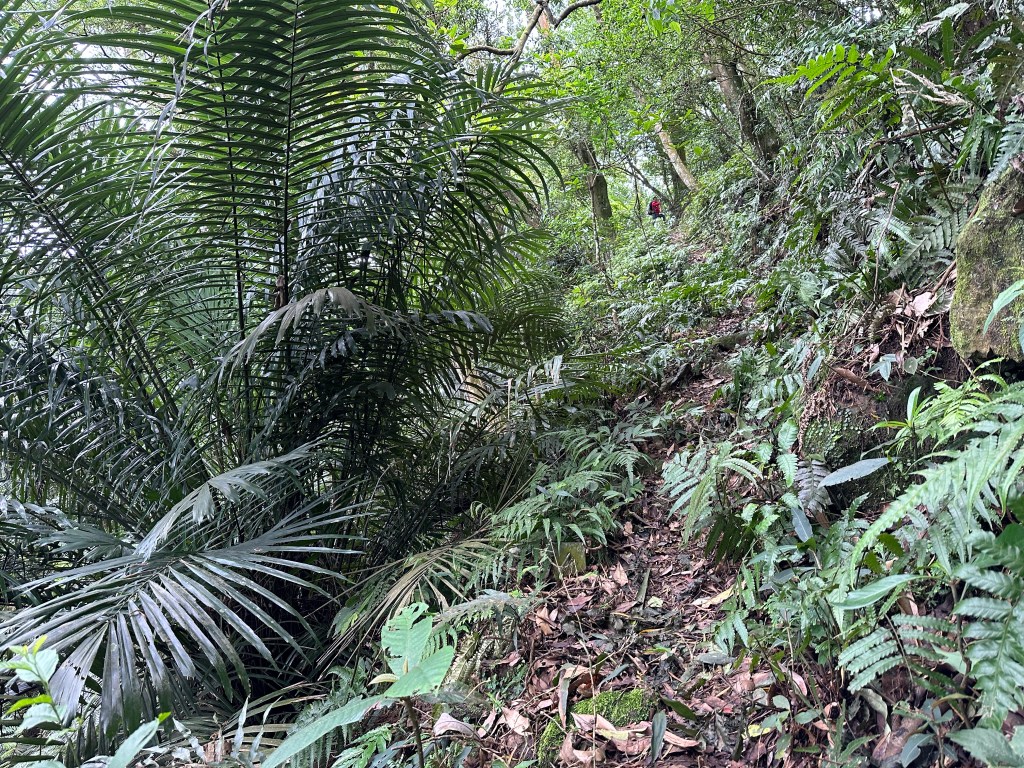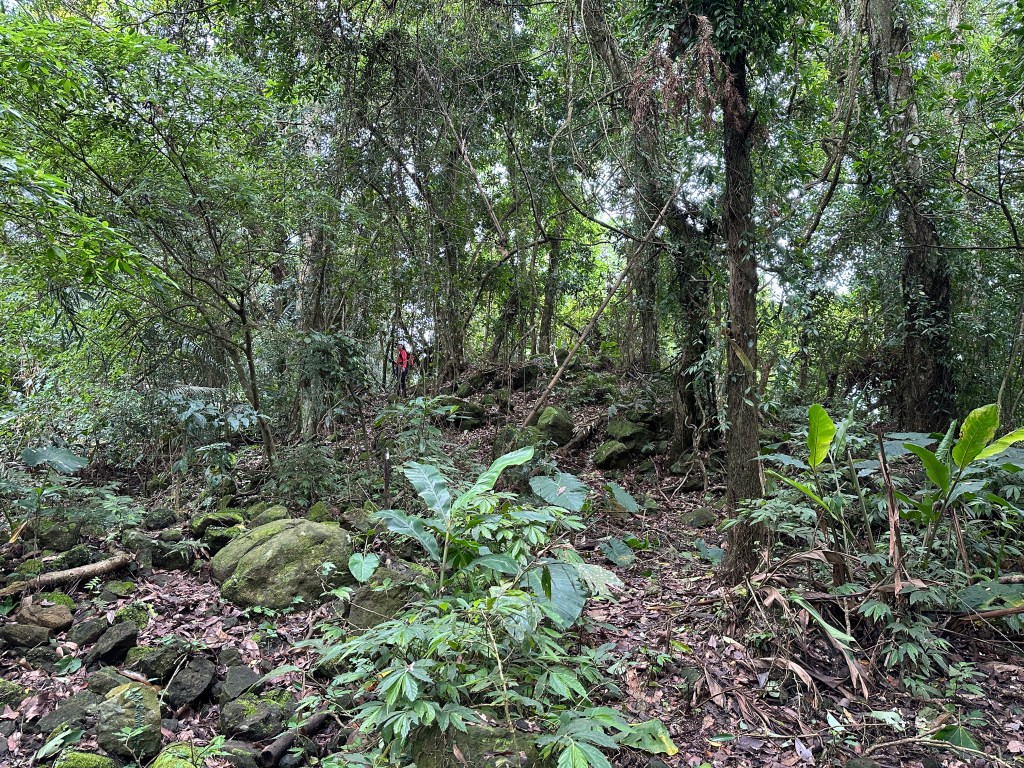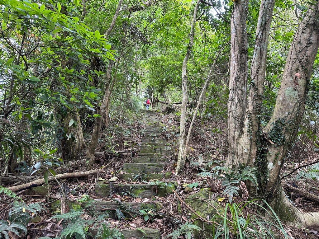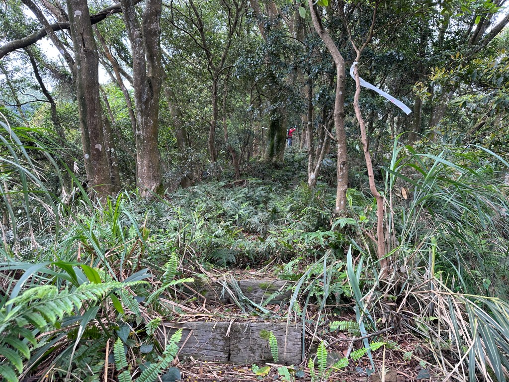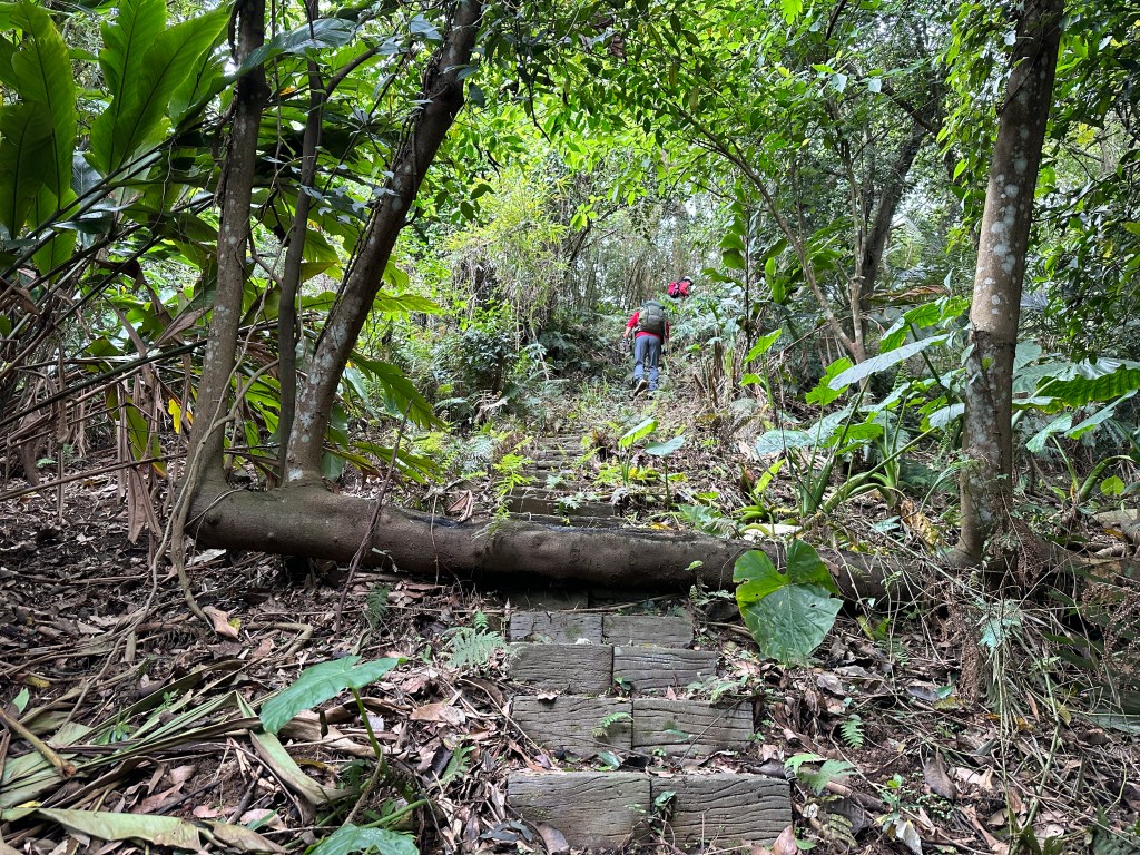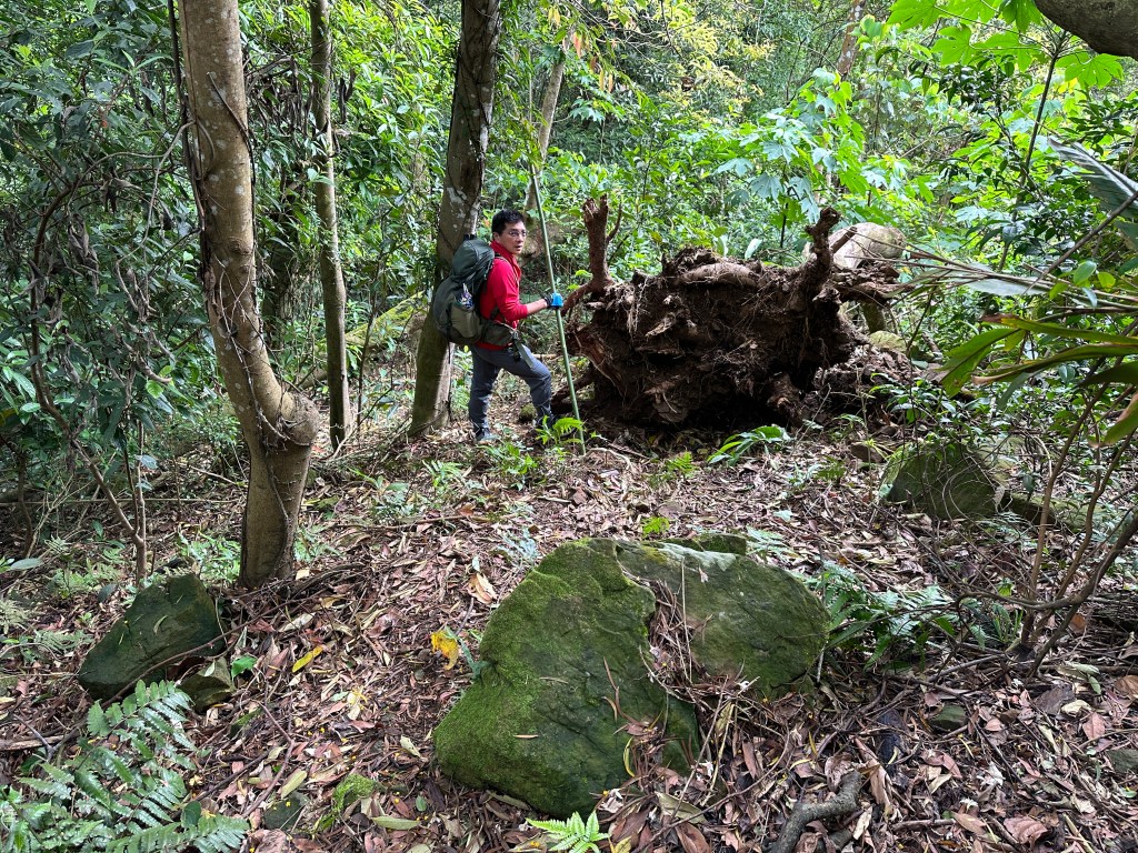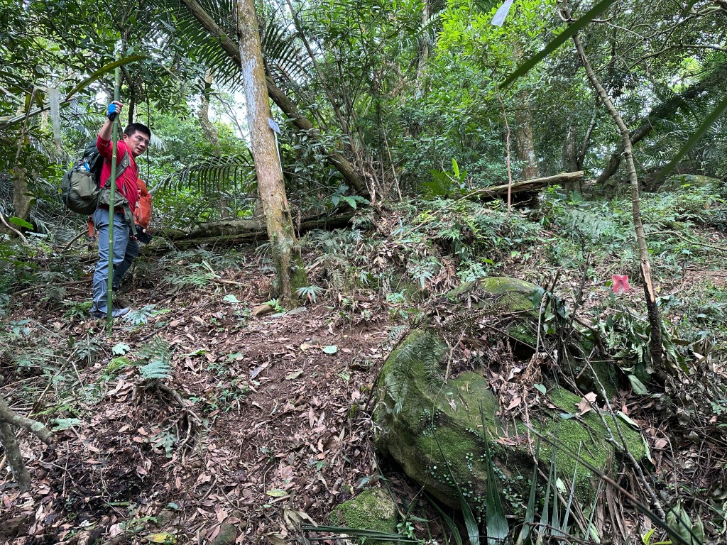 因此,三人決定退出改由產業道路繞大圈一些,由離線地圖上看到假山頭之間兩端皆有產業道路,中間有一小段約差了100m的距離就可接上?但離線地圖上來看是沒有軌跡路線的?因此,我們三人想嘗試突破看看?要先由一小木屋旁開始陡上,走沒幾部,就發現到這一小段的陡上路徑,在豐厚植披底下仔細撥弄居然可以看到有小石階鋪成的老舊階梯,但不知有多久沒人走過?