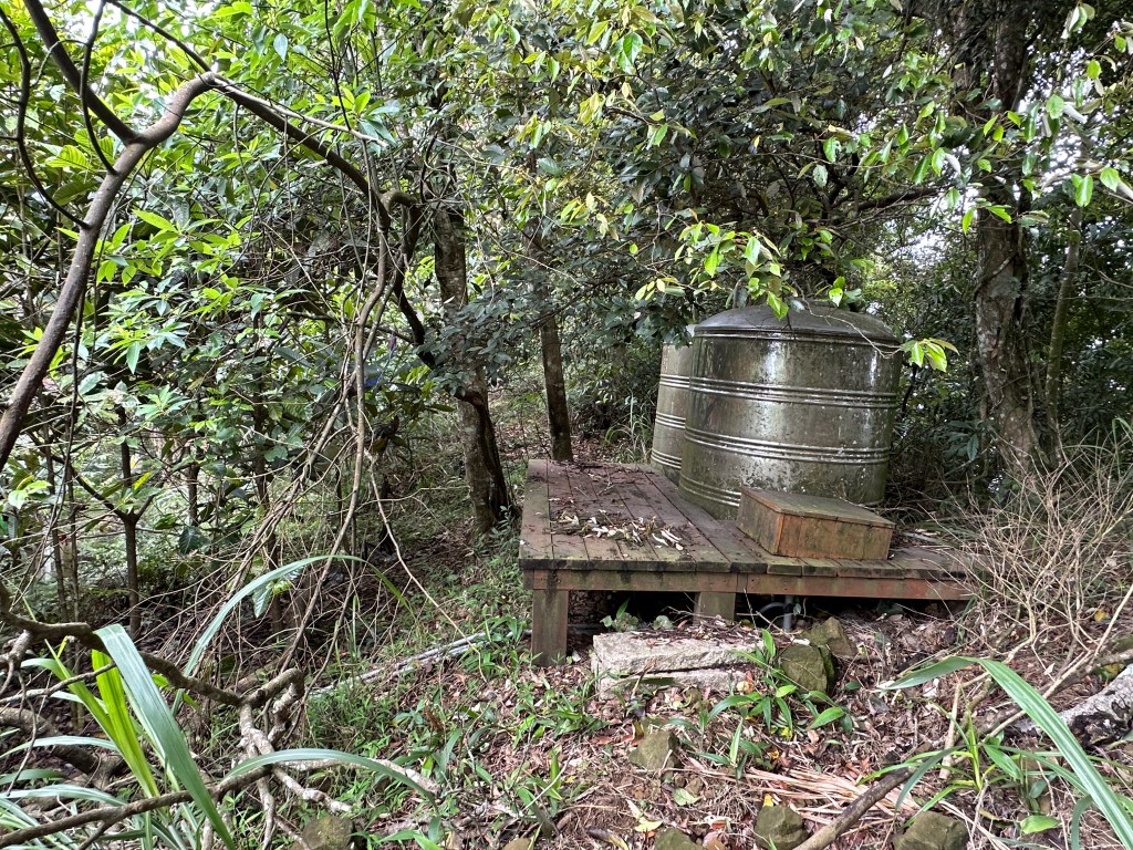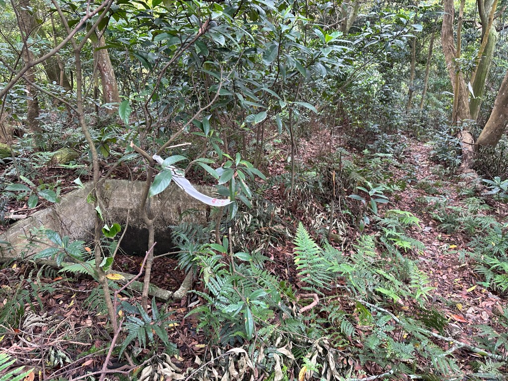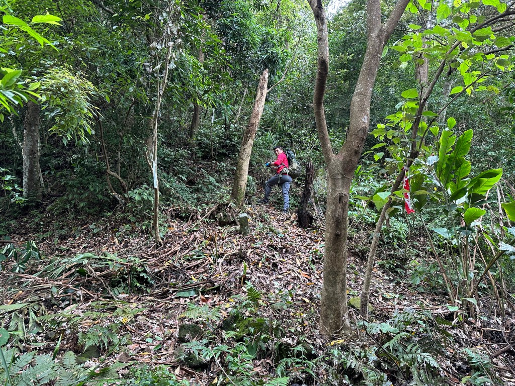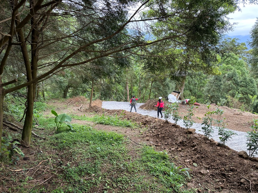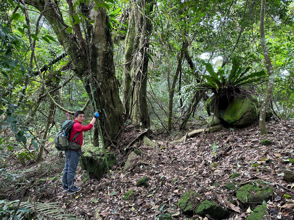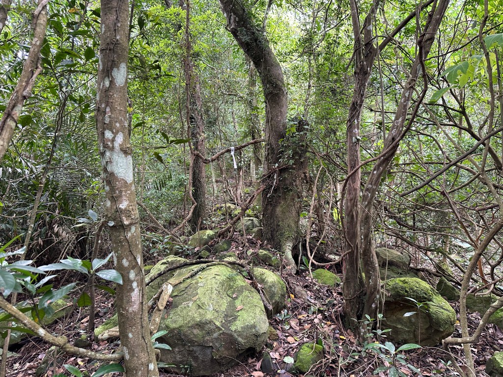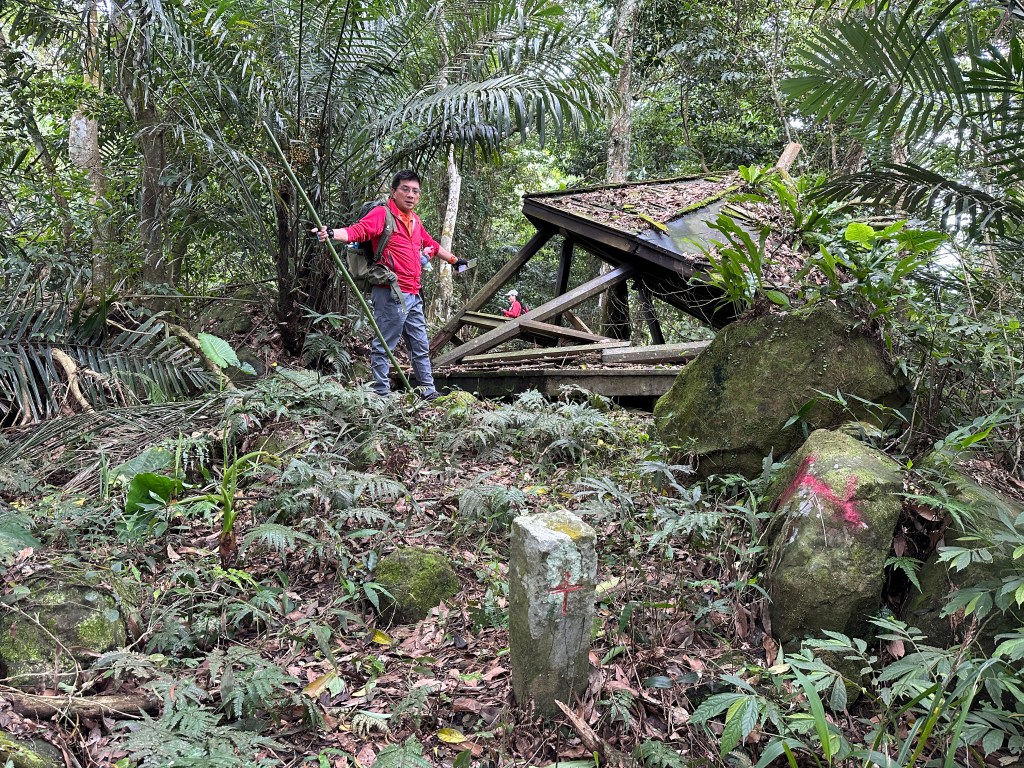 因此,三人決定退出改由產業道路繞大圈一些,由離線地圖上看到假山頭之間兩端皆有產業道路,中間有一小段約差了100m的距離就可接上?但離線地圖上來看是沒有軌跡路線的?因此,我們三人想嘗試突破看看?要先由一小木屋旁開始陡上,走沒幾部,就發現到這一小段的陡上路徑,在豐厚植披底下仔細撥弄居然可以看到有小石階鋪成的老舊階梯,但不知有多久沒人走過?