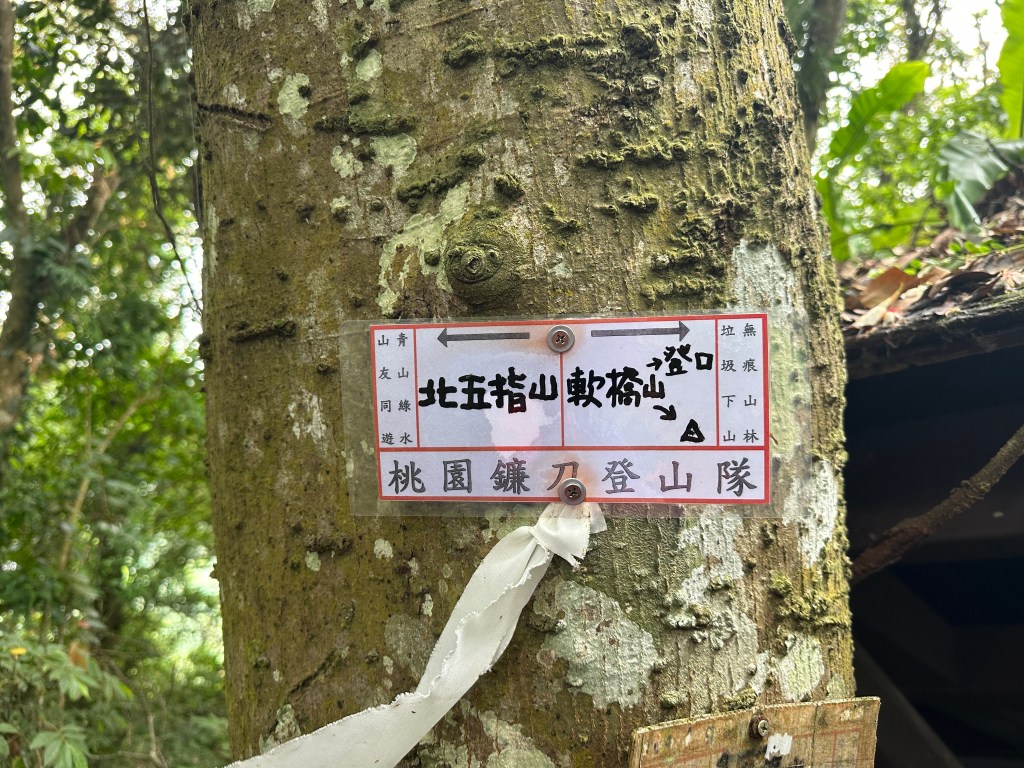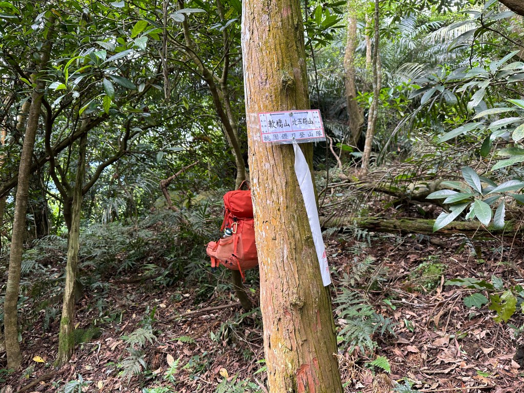 由停車處起登進入山徑後,不久就來到「軟橋登山步道」的「景觀生態步道」,一開始陡上就能感受到路徑被鐮刀隊先進們給清理得很清晰明確,陡上不久即會經過第一個完全崩塌的涼亭,陡上的走在老舊的木階梯上,一路來到北五指山與軟橋山的三岔路口,我們三人先陡下走500m來到軟橋山,若由軟橋山繼續直走可以下接南清公路的花草林,但我們是要回走,回到三岔路口,因為我們還要去北五指山。