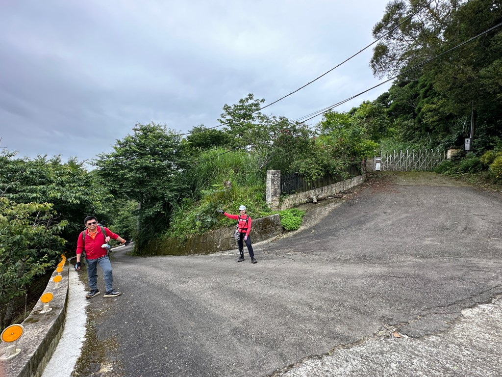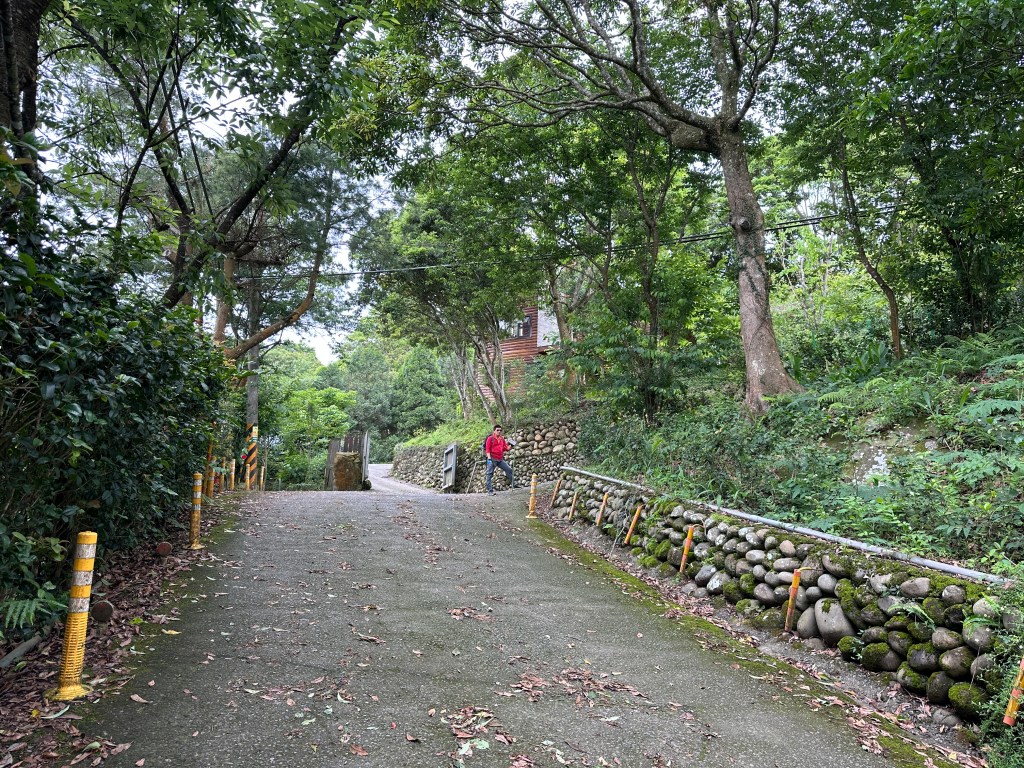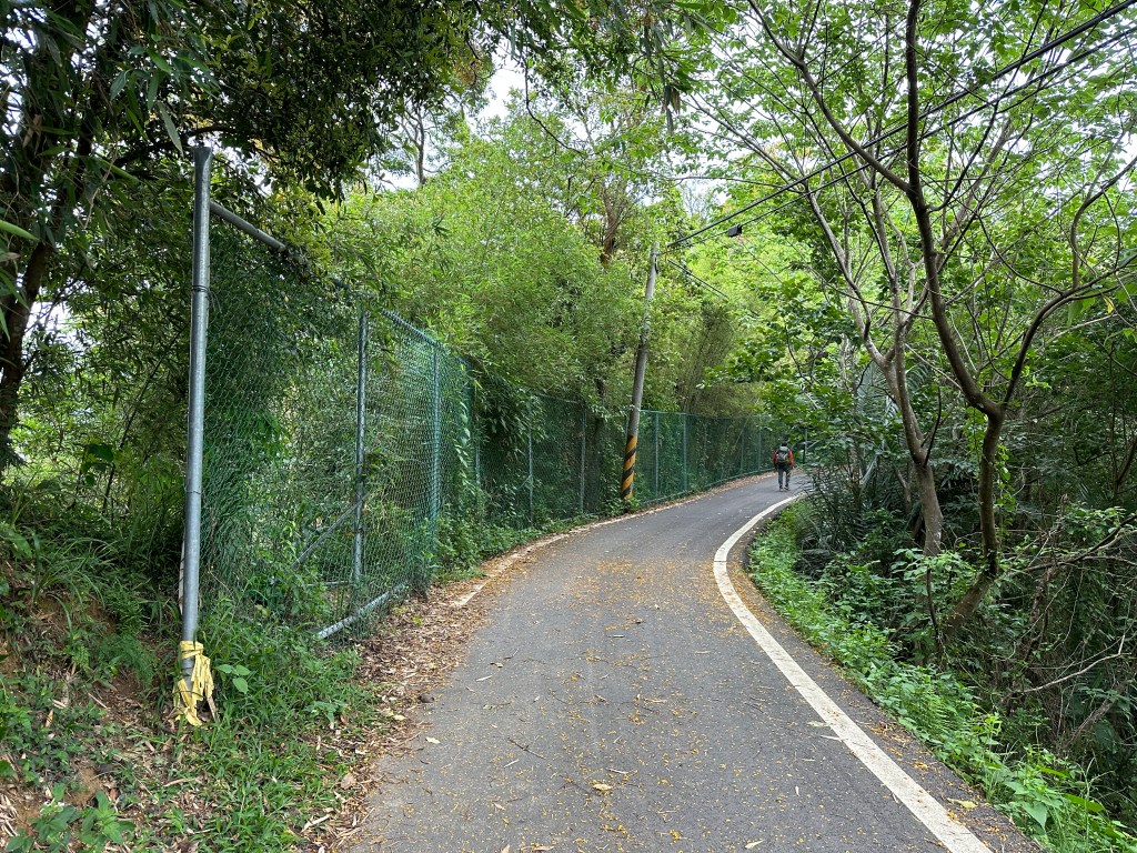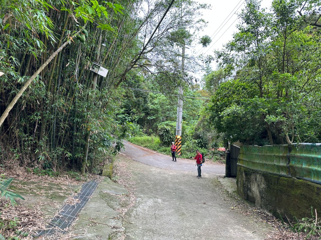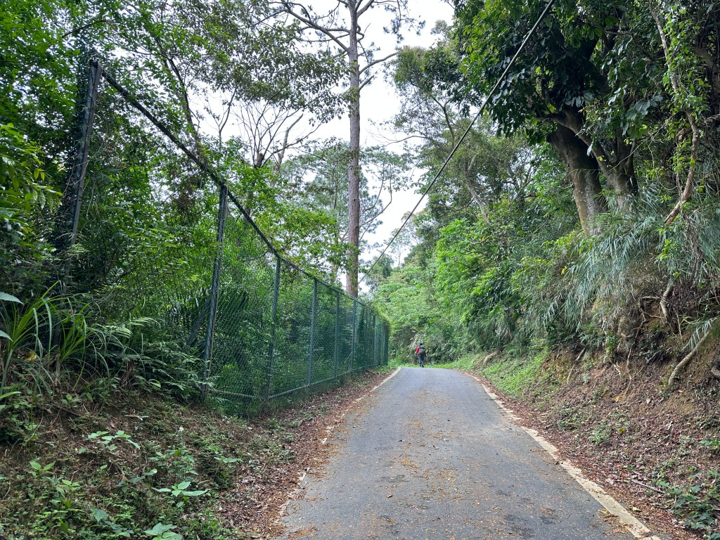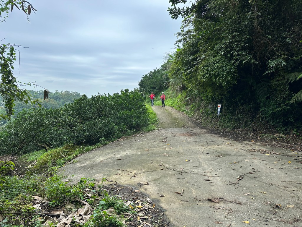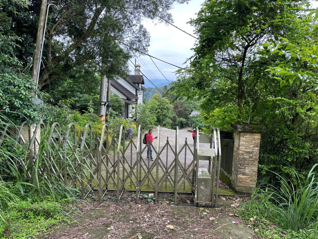 非常難走,陡上後發現還真的可以接上產業道路,往左走100m就看到前方有鐵門,但鐵門留了一個人可以通過的門縫,這感覺上,就是我們是走在人家的社區內?出了鐵門,接著,沿著產業道路一路陡下要往四崙頂山方向走,走了約800m後,