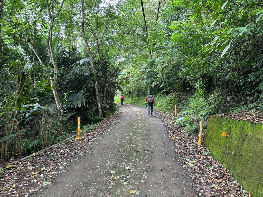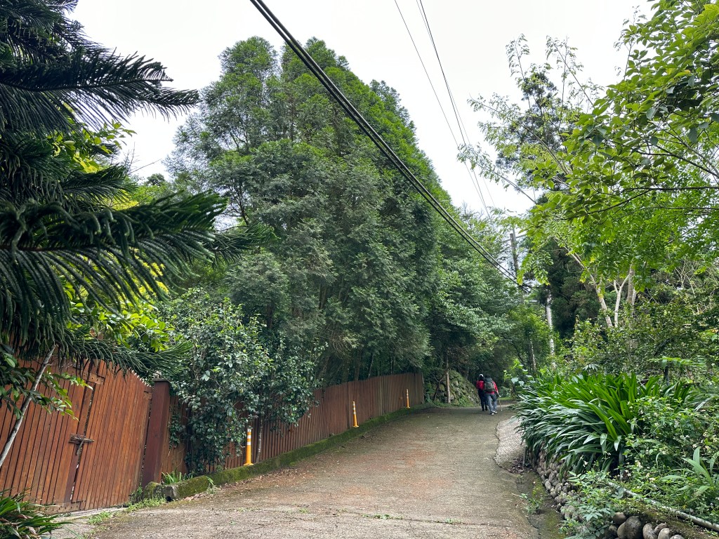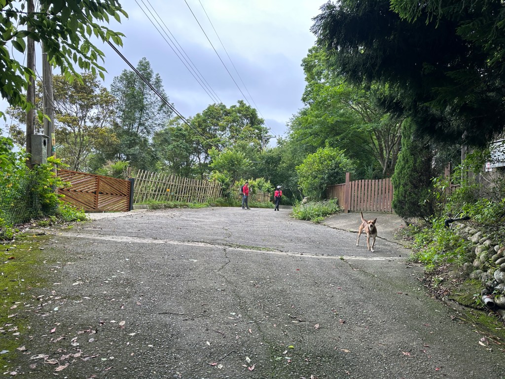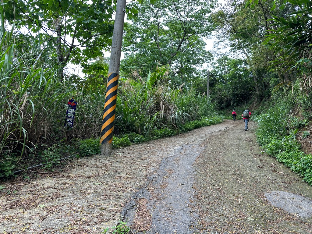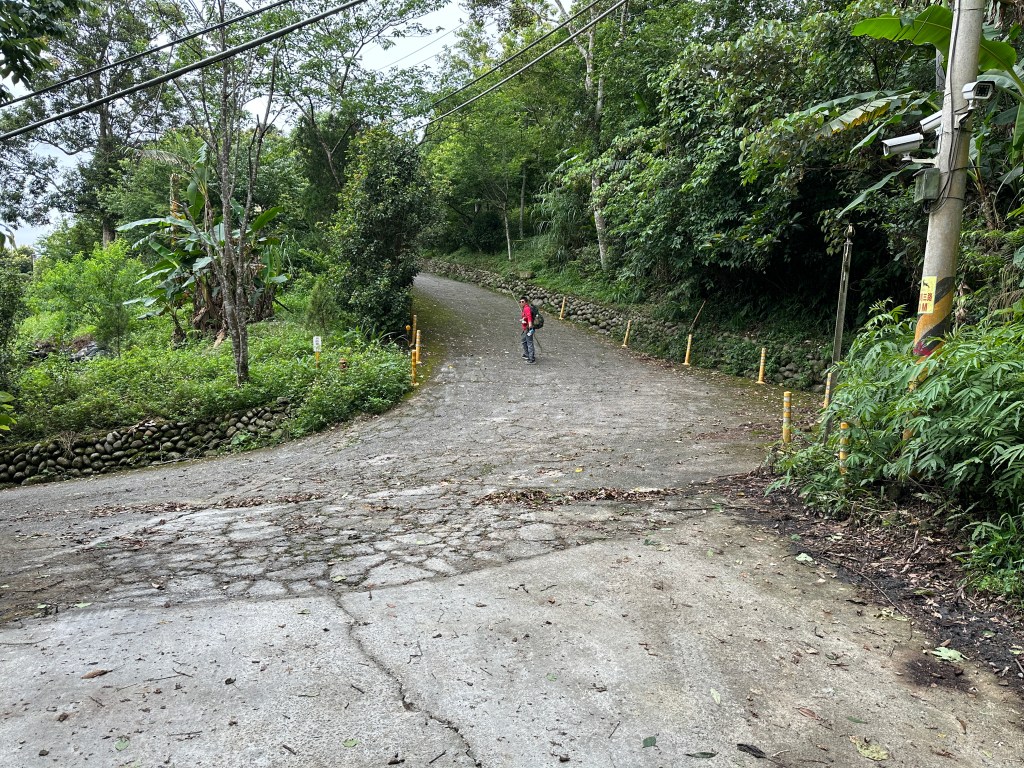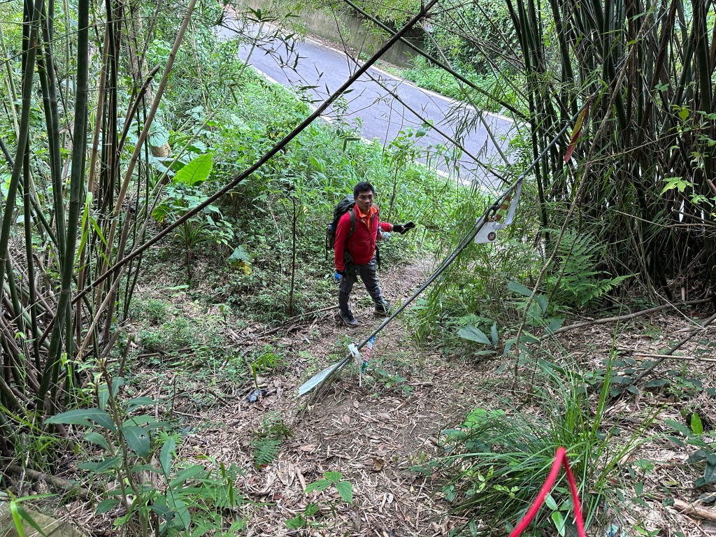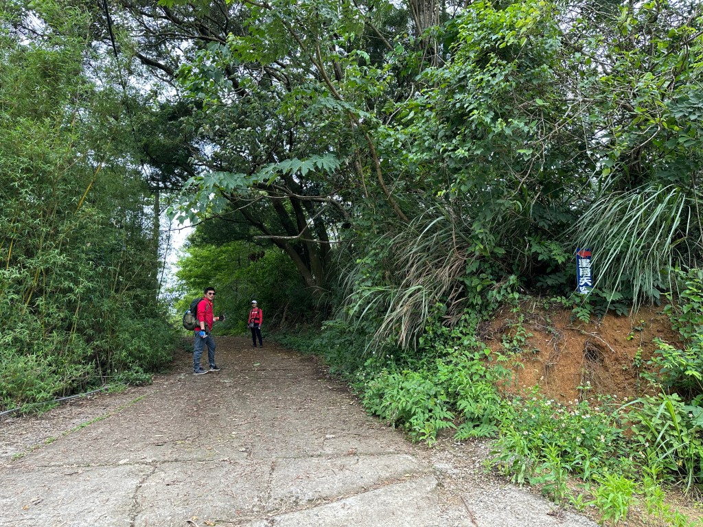 非常難走,陡上後發現還真的可以接上產業道路,往左走100m就看到前方有鐵門,但鐵門留了一個人可以通過的門縫,這感覺上,就是我們是走在人家的社區內?出了鐵門,接著,沿著產業道路一路陡下要往四崙頂山方向走,走了約800m後,