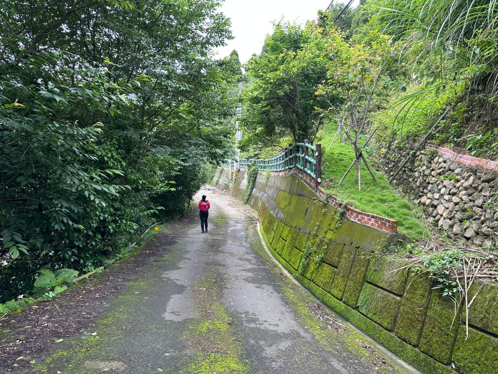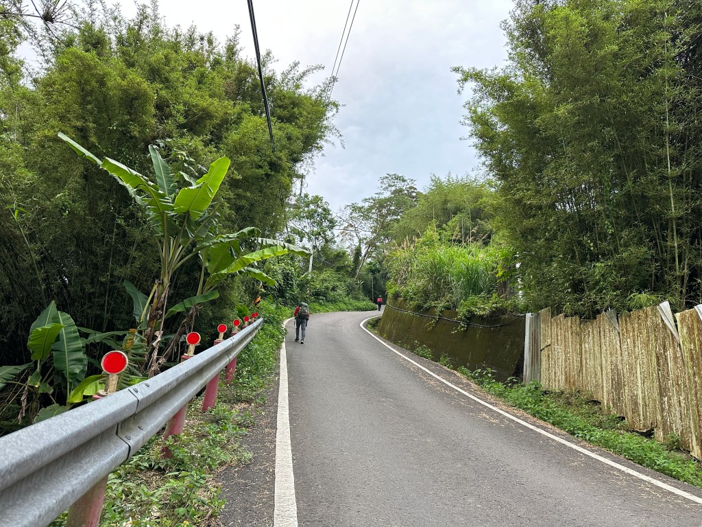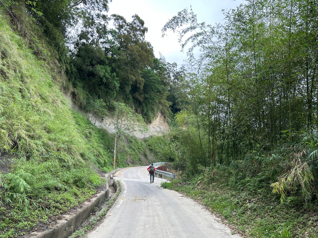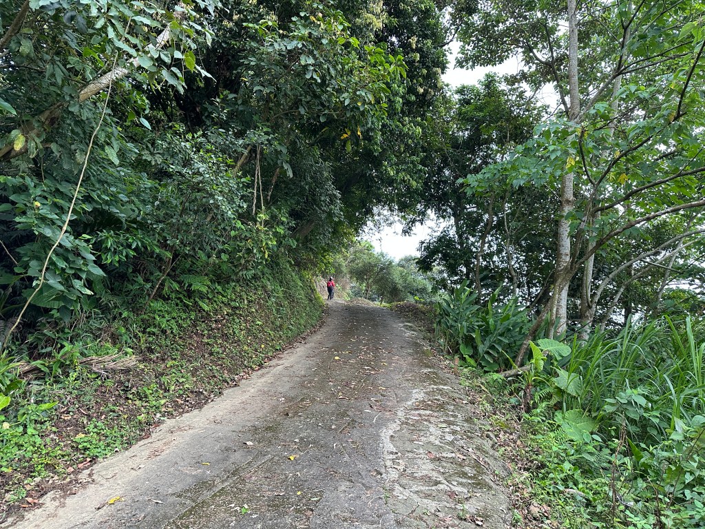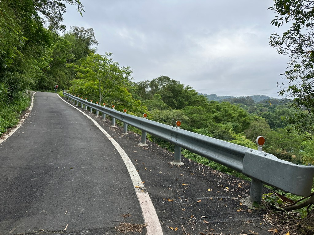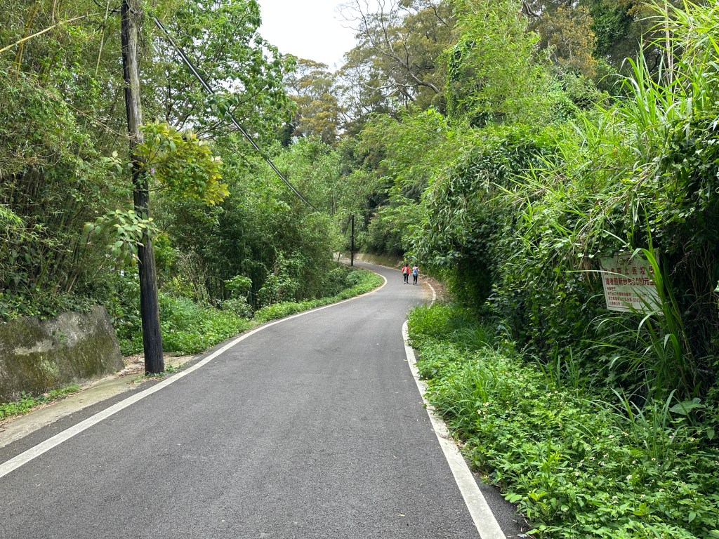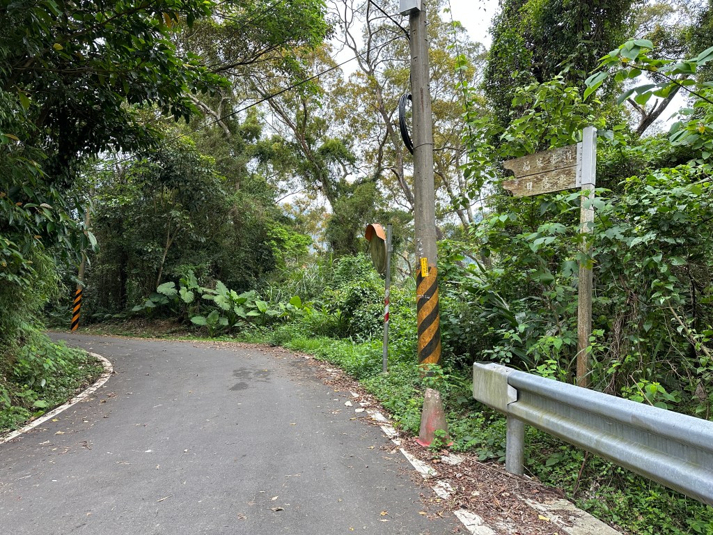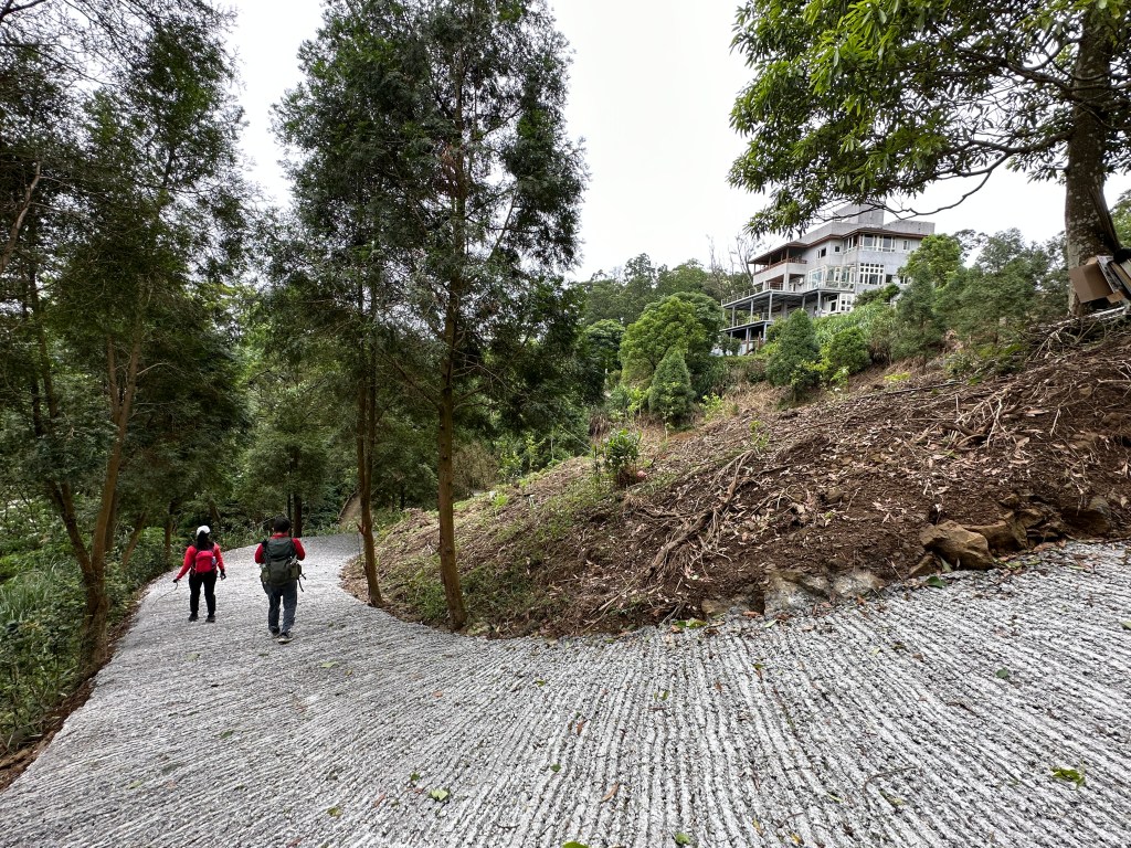非常難走,陡上後發現還真的可以接上產業道路,往左走100m就看到前方有鐵門,但鐵門留了一個人可以通過的門縫,這感覺上,就是我們是走在人家的社區內?出了鐵門,接著,沿著產業道路一路陡下要往四崙頂山方向走,走了約800m後,