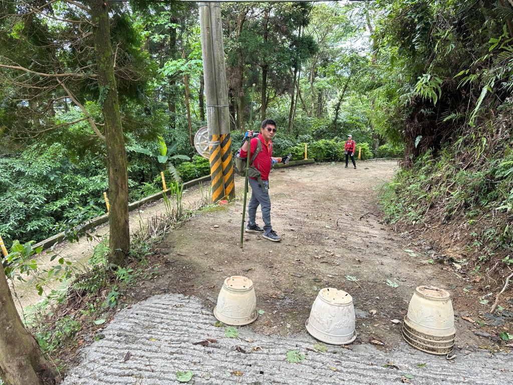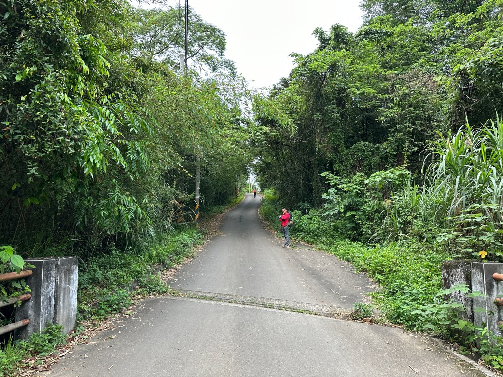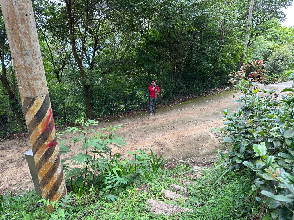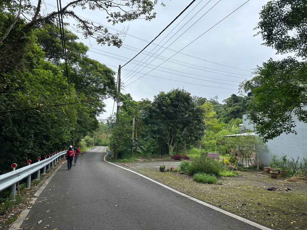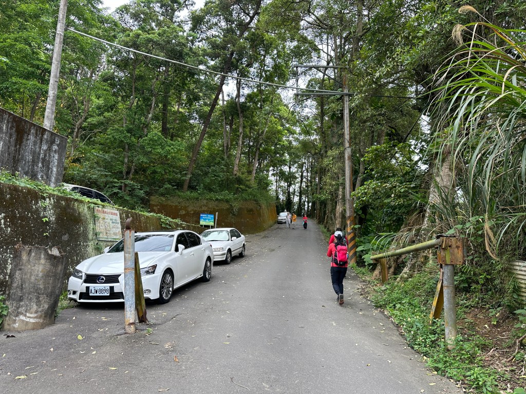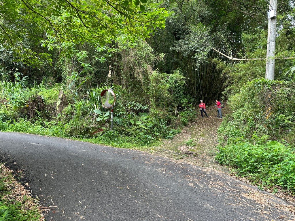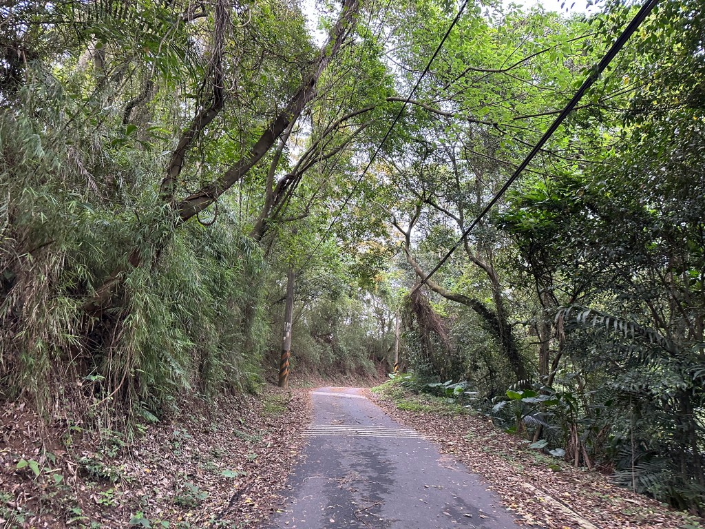 非常難走,陡上後發現還真的可以接上產業道路,往左走100m就看到前方有鐵門,但鐵門留了一個人可以通過的門縫,這感覺上,就是我們是走在人家的社區內?出了鐵門,接著,沿著產業道路一路陡下要往四崙頂山方向走,走了約800m後,