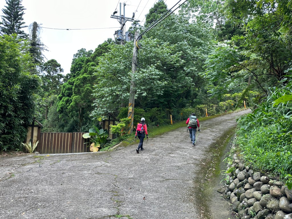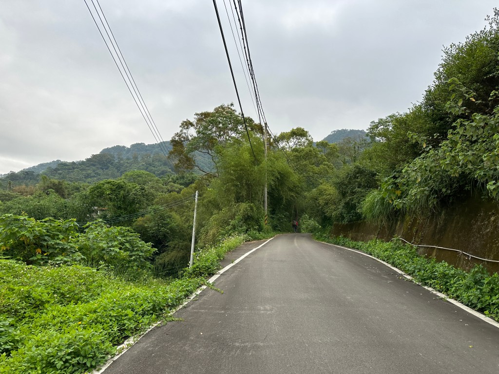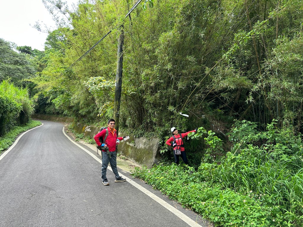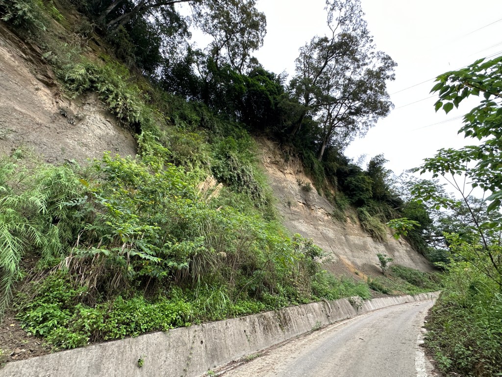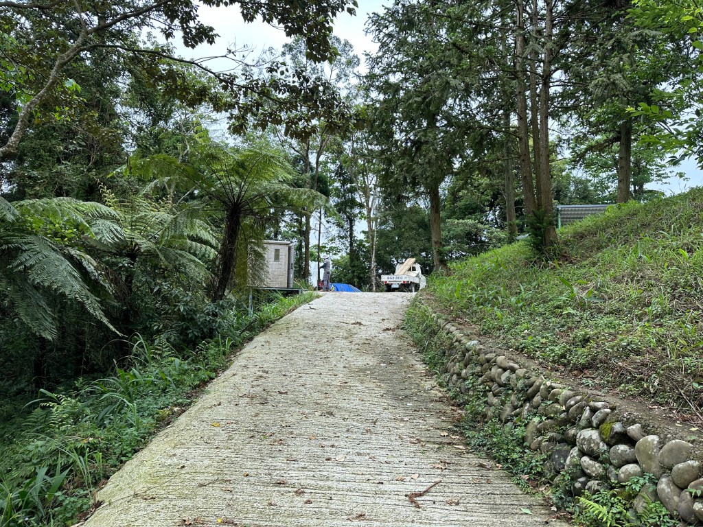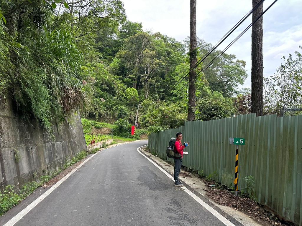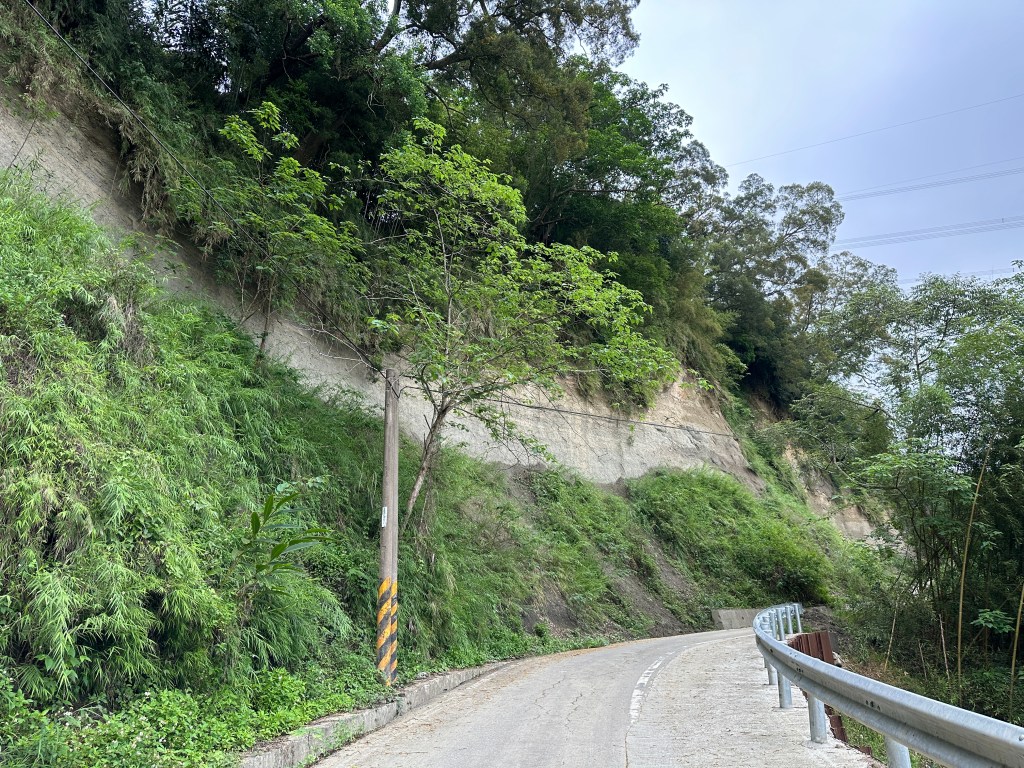 非常難走,陡上後發現還真的可以接上產業道路,往左走100m就看到前方有鐵門,但鐵門留了一個人可以通過的門縫,這感覺上,就是我們是走在人家的社區內?出了鐵門,接著,沿著產業道路一路陡下要往四崙頂山方向走,走了約800m後,