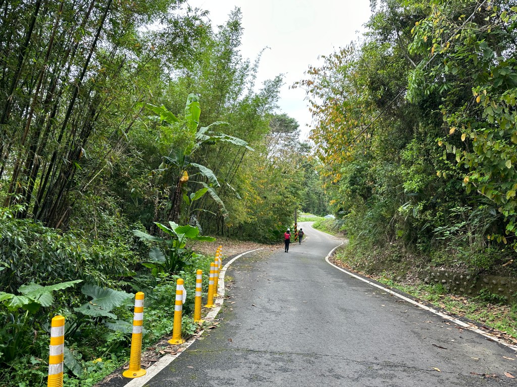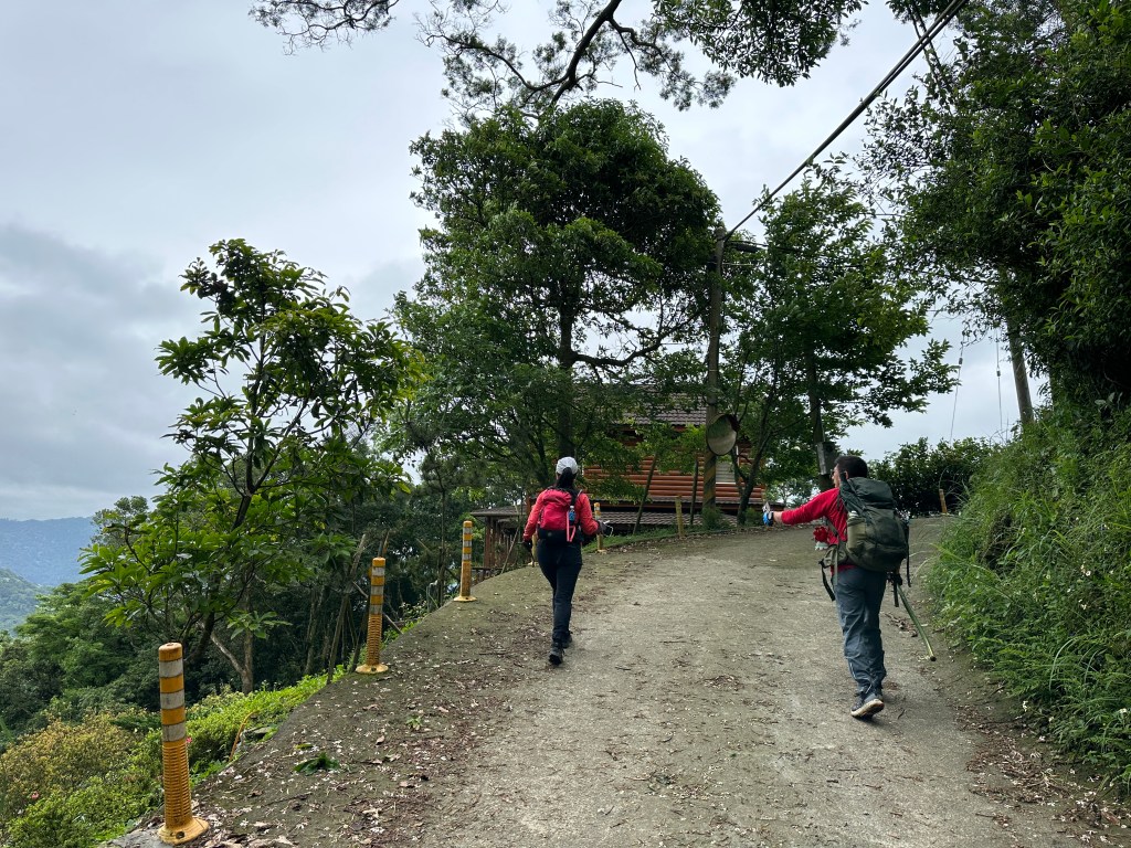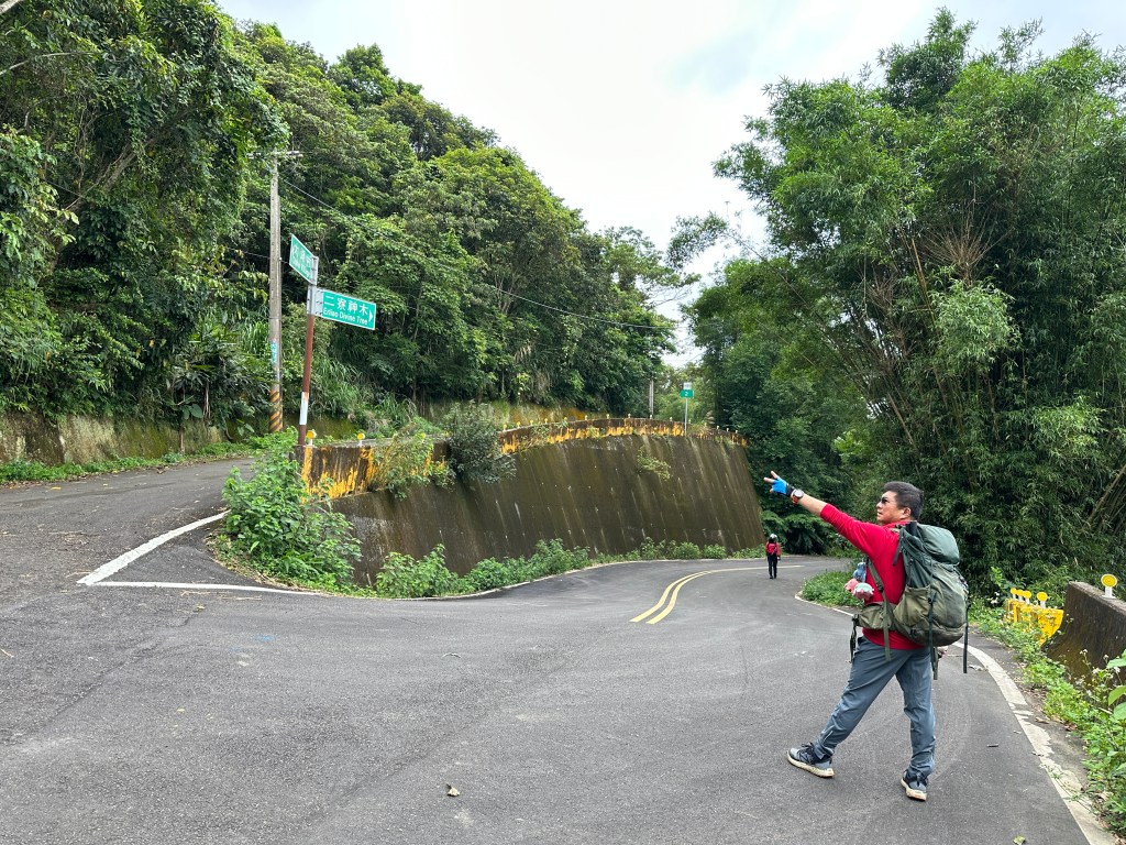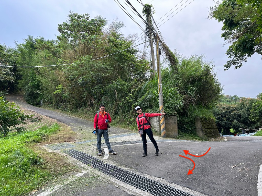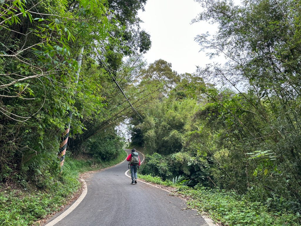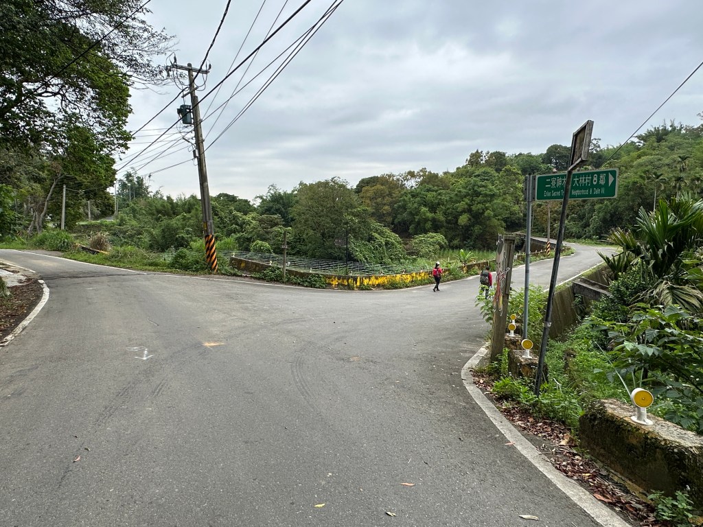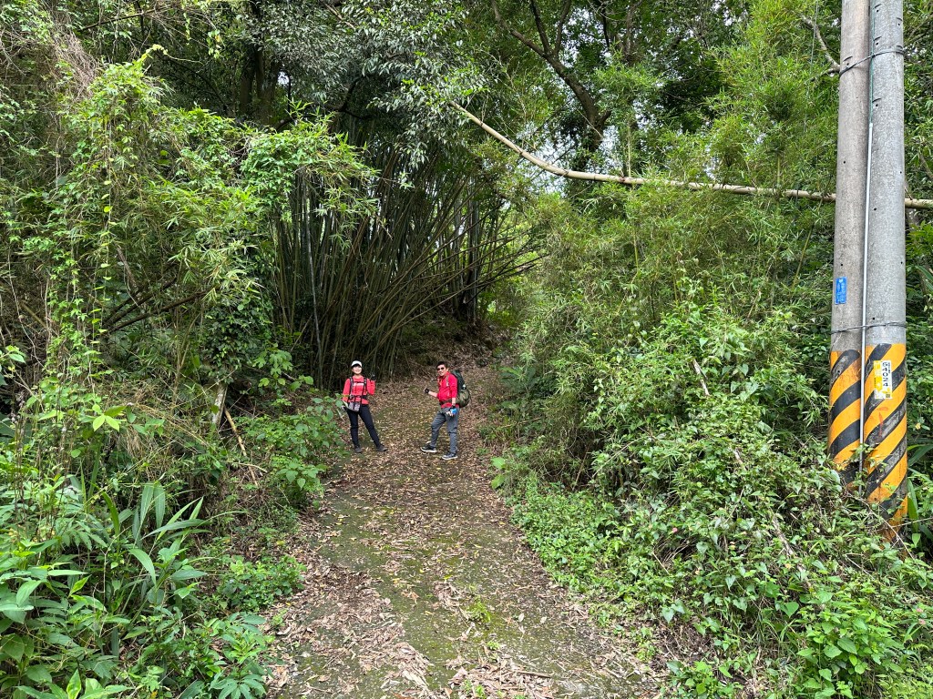 非常難走,陡上後發現還真的可以接上產業道路,往左走100m就看到前方有鐵門,但鐵門留了一個人可以通過的門縫,這感覺上,就是我們是走在人家的社區內?出了鐵門,接著,沿著產業道路一路陡下要往四崙頂山方向走,走了約800m後,