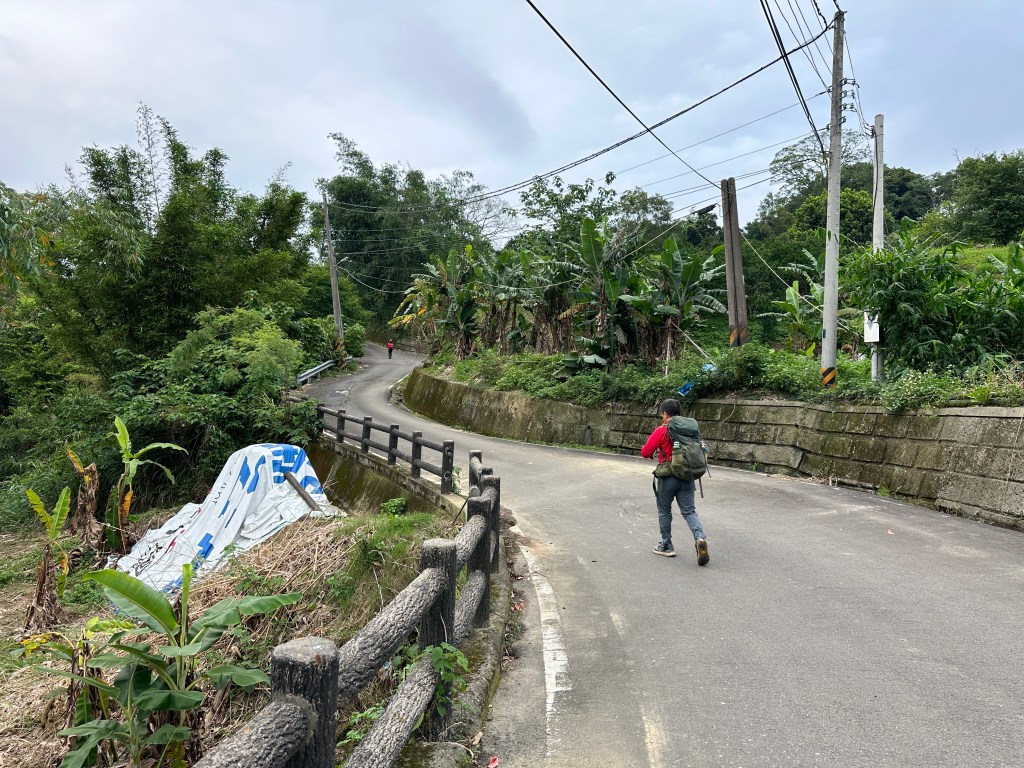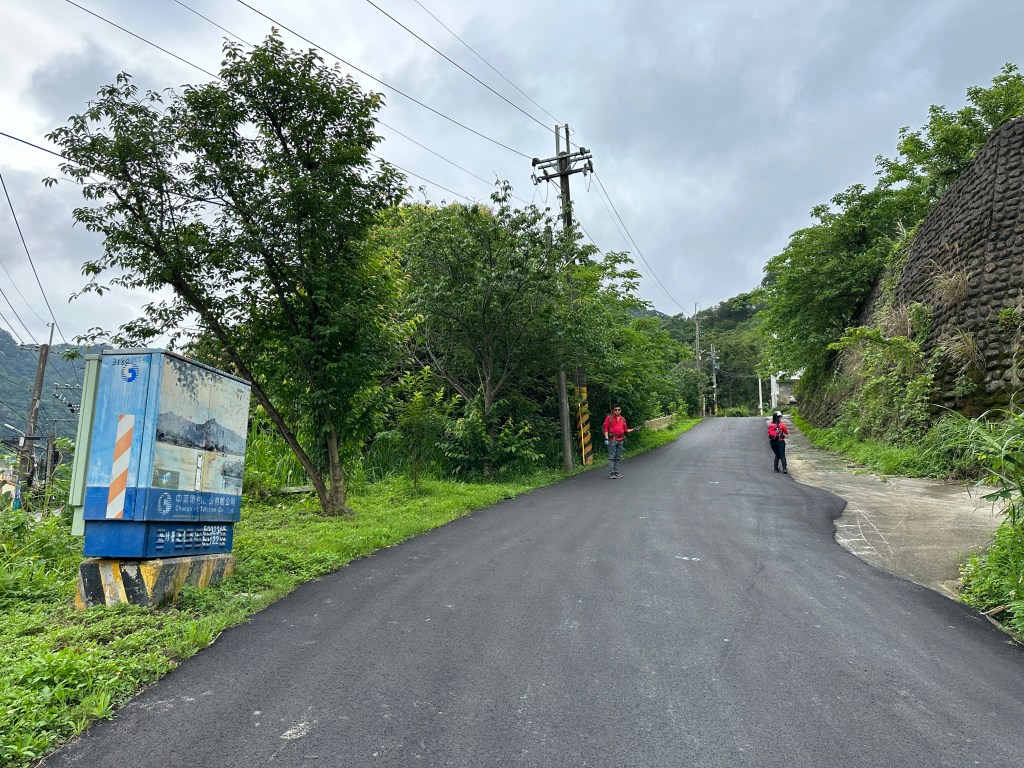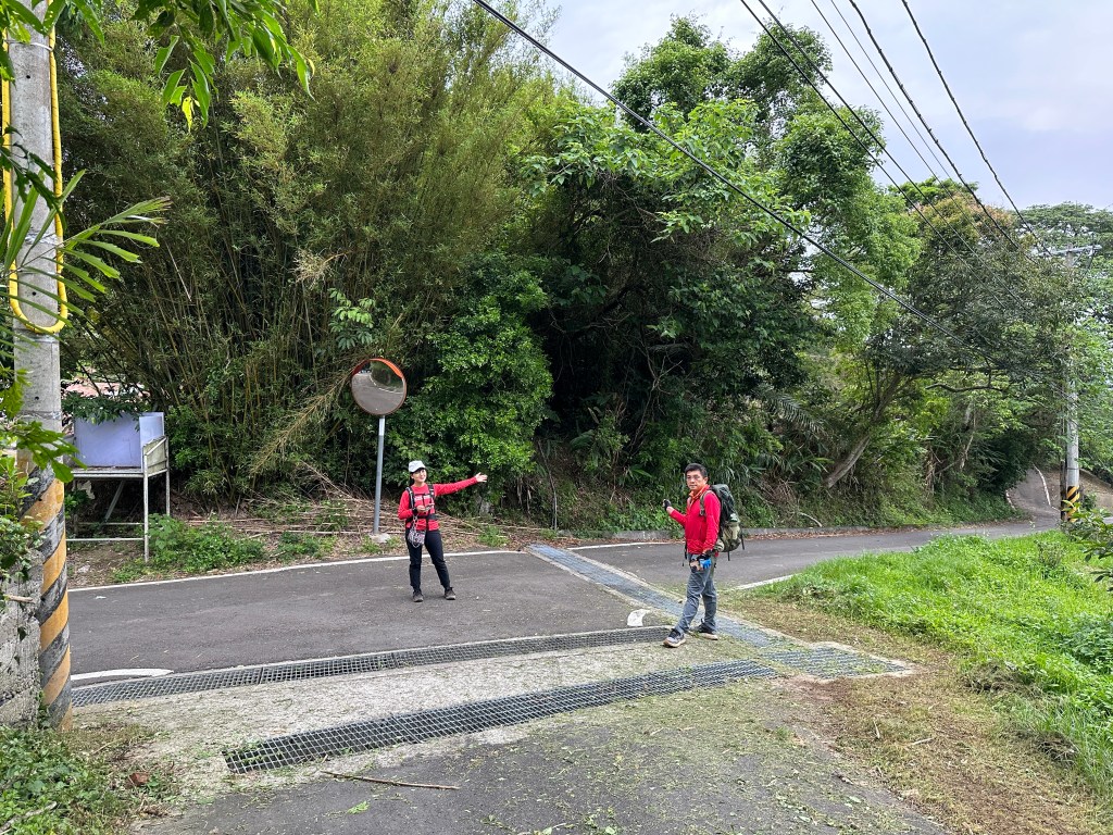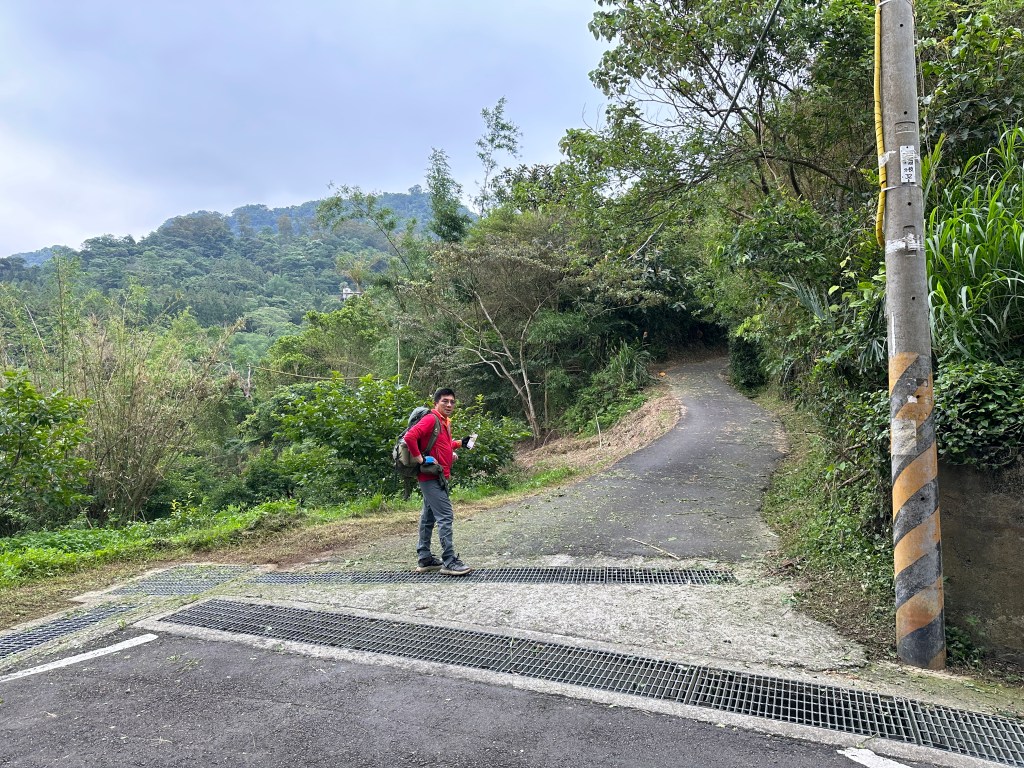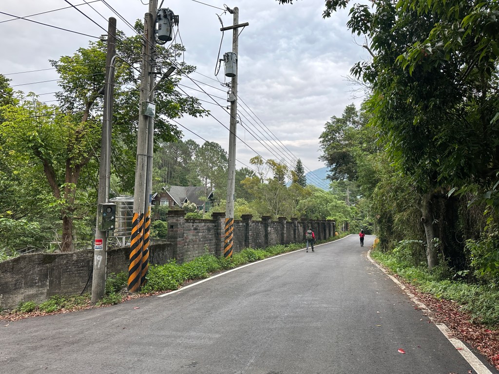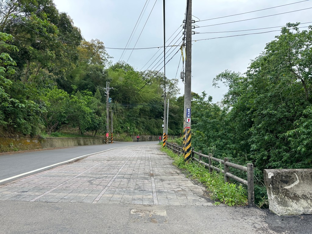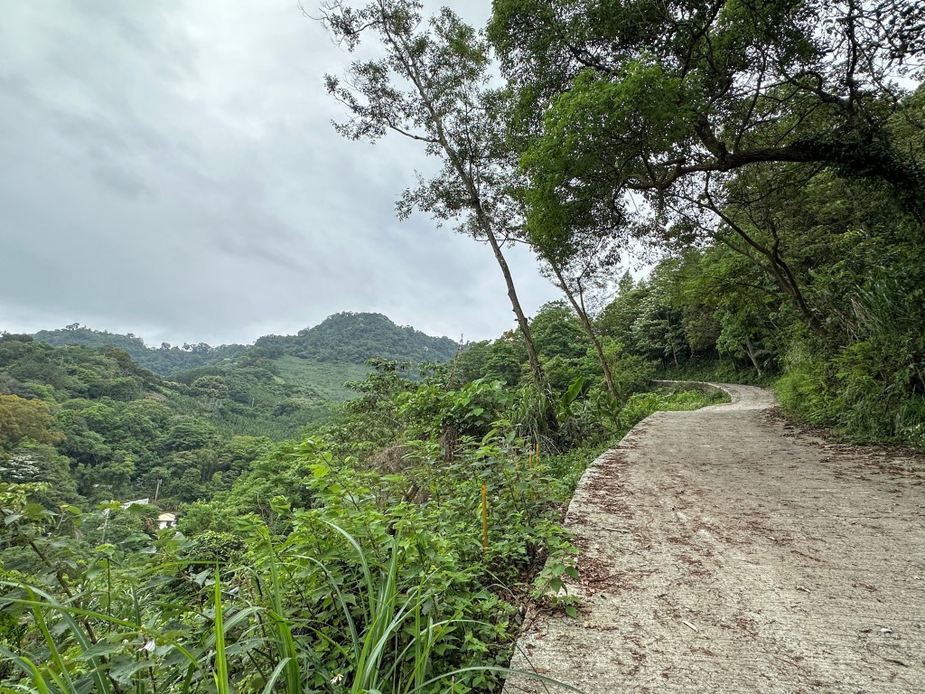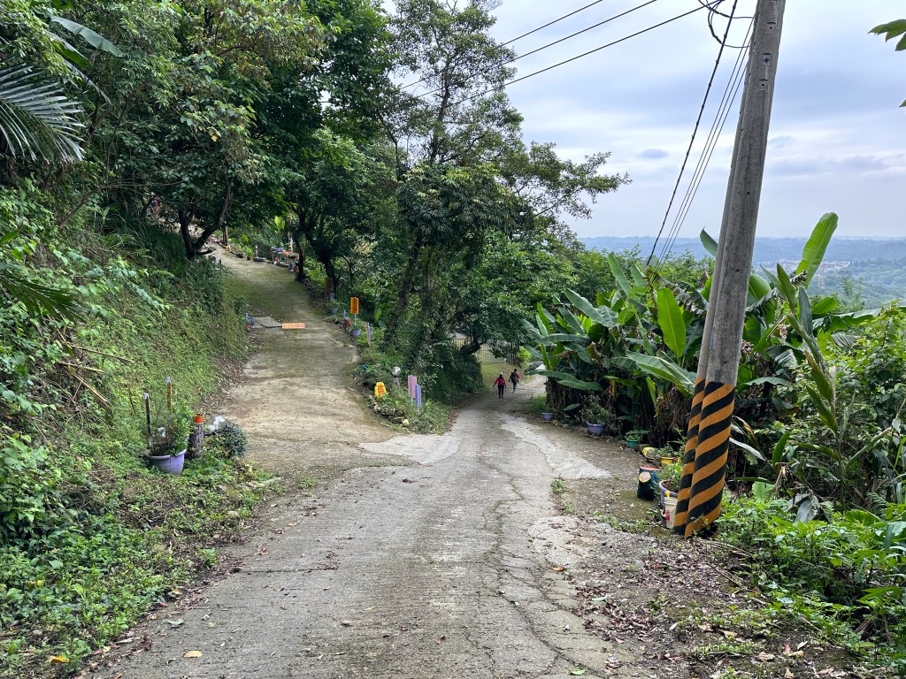 非常難走,陡上後發現還真的可以接上產業道路,往左走100m就看到前方有鐵門,但鐵門留了一個人可以通過的門縫,這感覺上,就是我們是走在人家的社區內?出了鐵門,接著,沿著產業道路一路陡下要往四崙頂山方向走,走了約800m後,