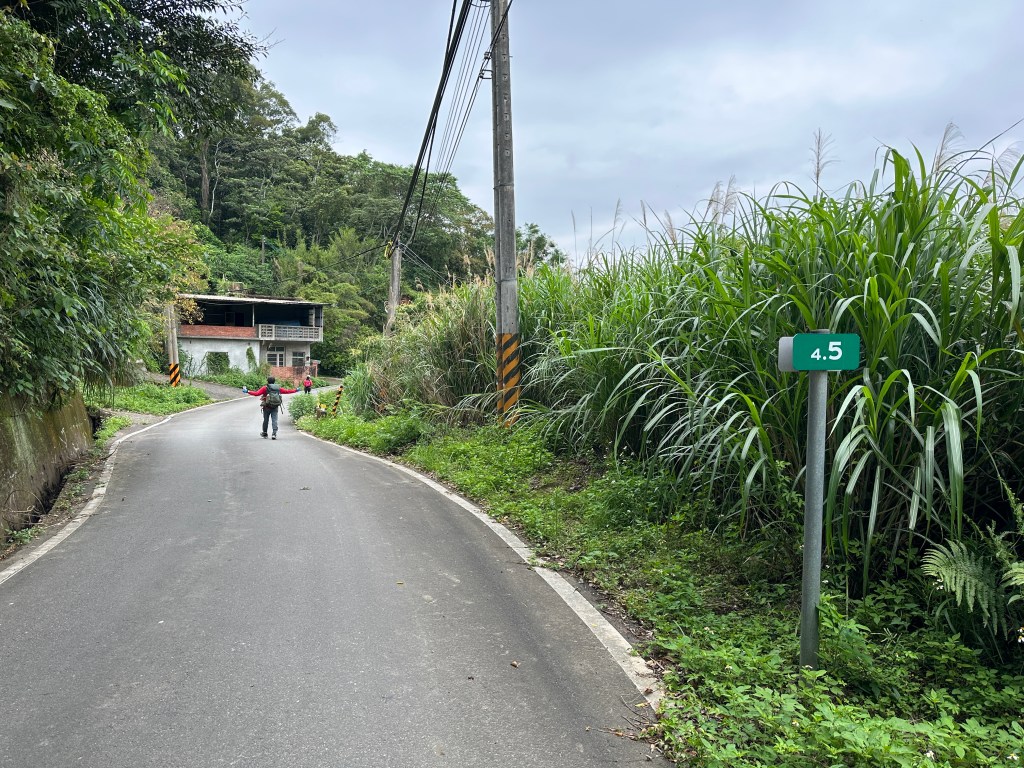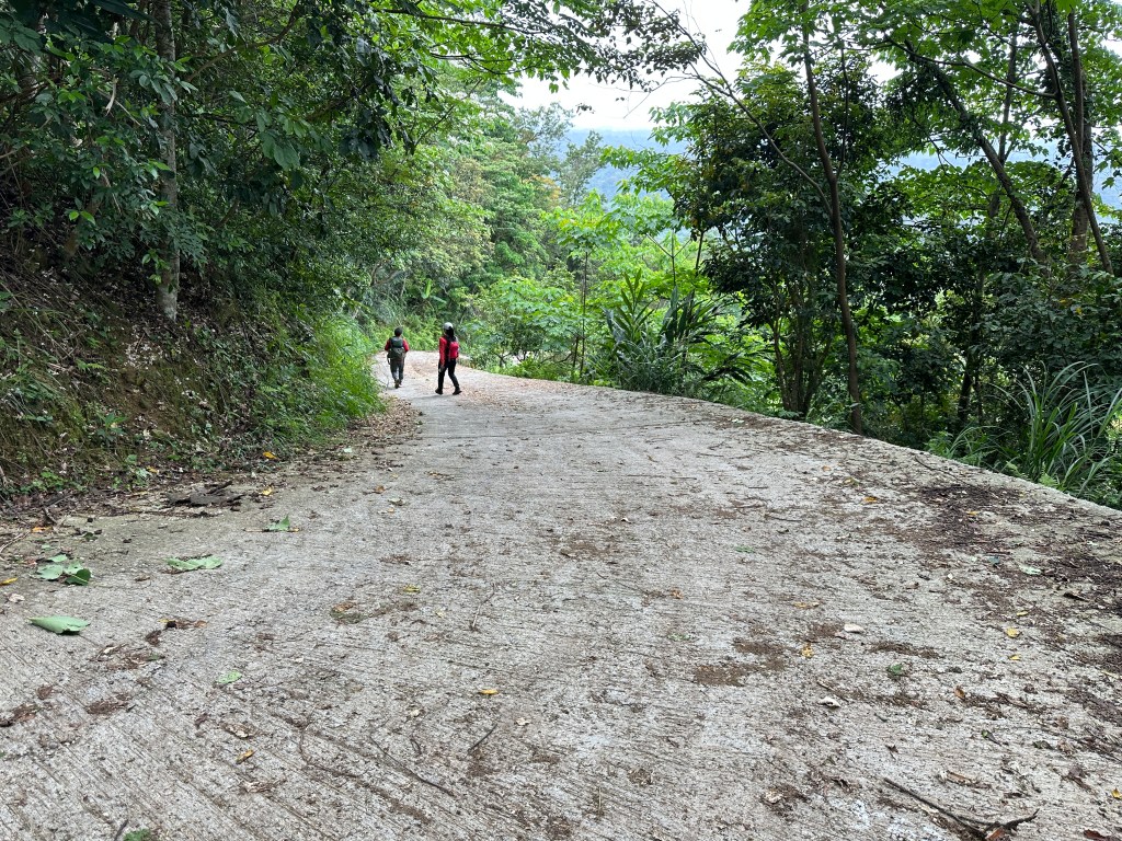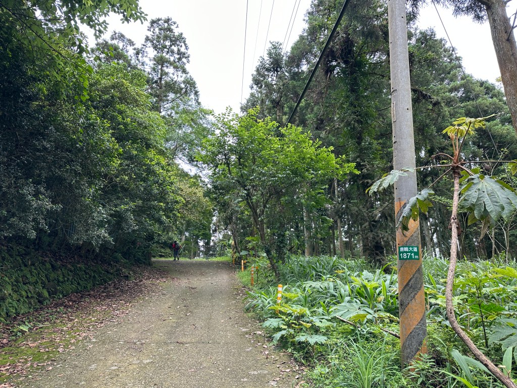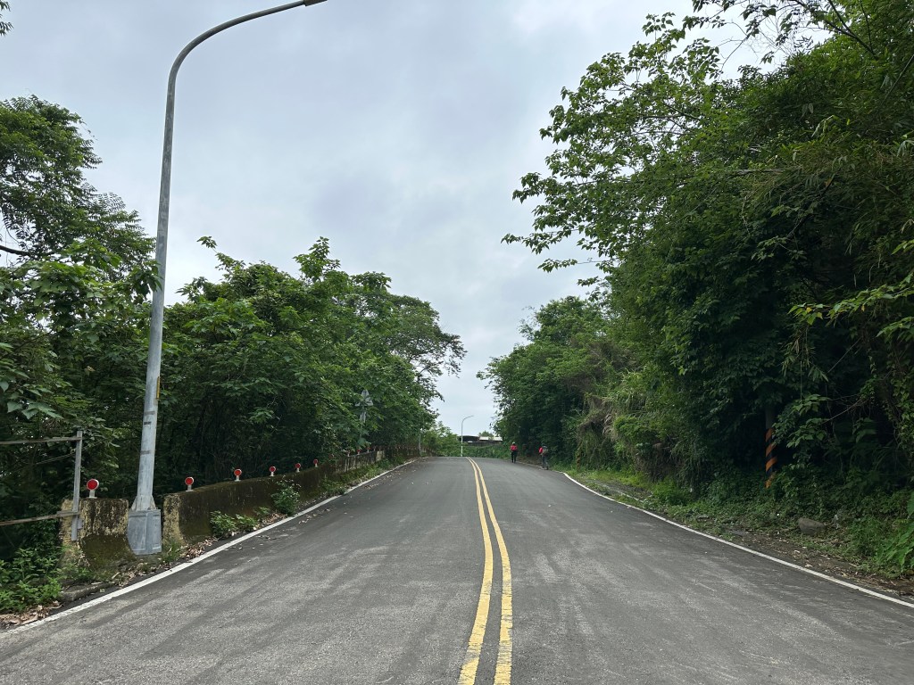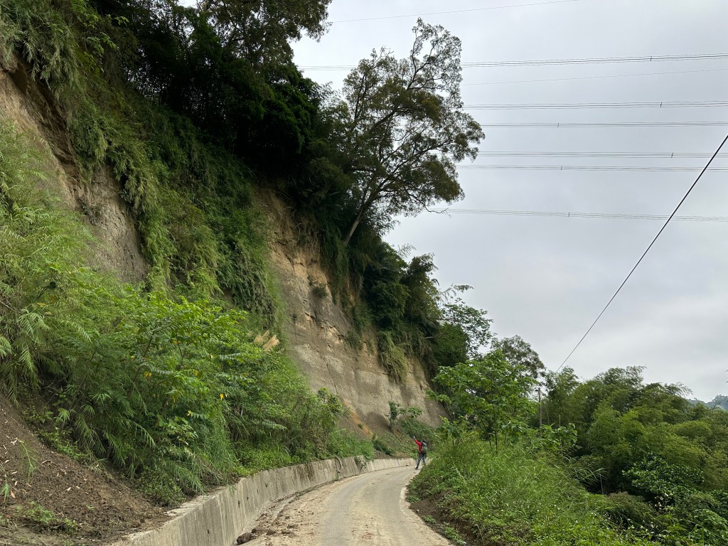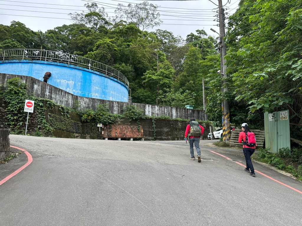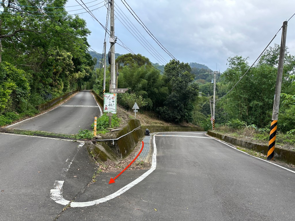 非常難走,陡上後發現還真的可以接上產業道路,往左走100m就看到前方有鐵門,但鐵門留了一個人可以通過的門縫,這感覺上,就是我們是走在人家的社區內?出了鐵門,接著,沿著產業道路一路陡下要往四崙頂山方向走,走了約800m後,