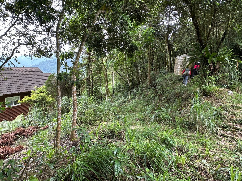接著,由此到四崙頂山前的路線之間,真不知如何下筆?因為接下來是圈中有圈,小圈外還有大圈!整個過程,都是看來是在封閉的社區內,這整個山頭內產業道路不少,一路上都是小木屋,或者應該說是大木屋,不是住家就是人家的渡假處,但不是對外營業的露營區。我們一路走過也與接觸的住家打好招呼,取完北五指山後,看到去年有山友從北五指山直接走稜線路,再接上往四崙頂山的產業道路上,因此我們也想這樣子走。